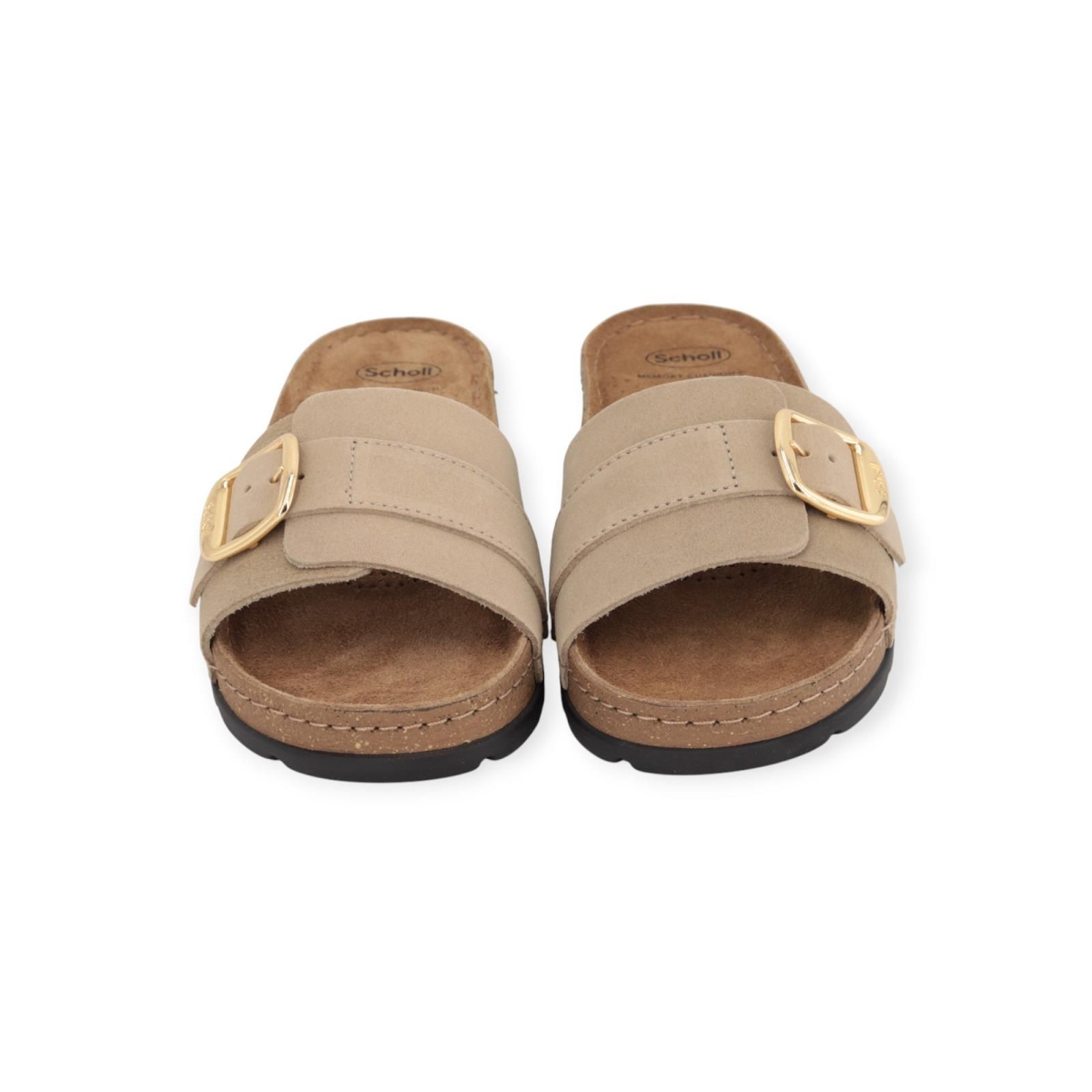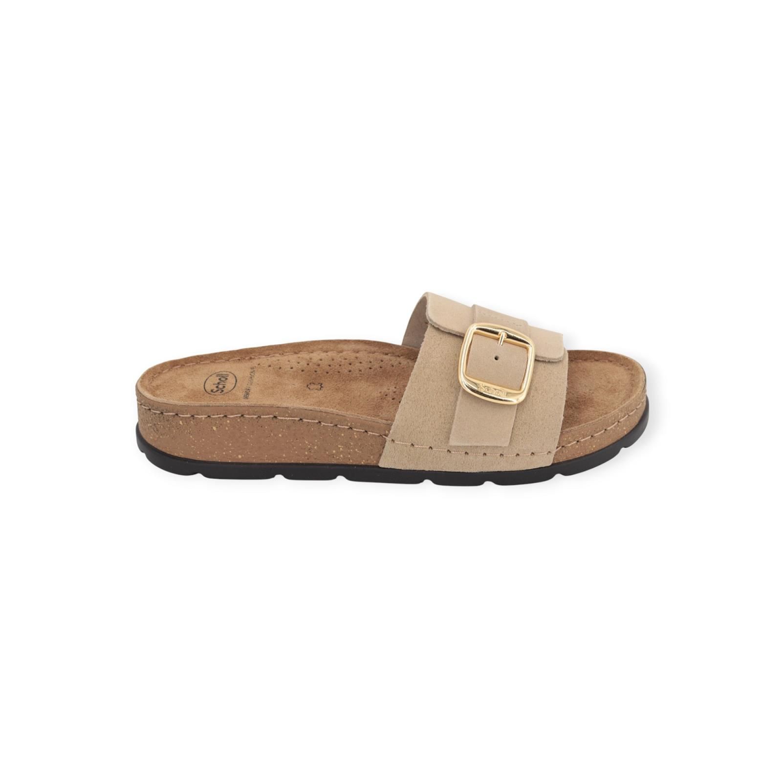 Slipper Bora 1 Strap van Scholl voor dames. Deze beige slipper in suède is een feilloze samensmelting van mode en comfort. Is met een verstelbare band over de wreef dankzij de iconische gouden gesp. Dit ergonomisch ontwerp vormt de Scholl binnenzool ‘Bioprint technologie’ naar de vorm van uw voet en helpt deze in de juiste positie te houden. Heeft een licht verhoogde sleehak van 30-35mm hoog en is op een donkere antislipzool.