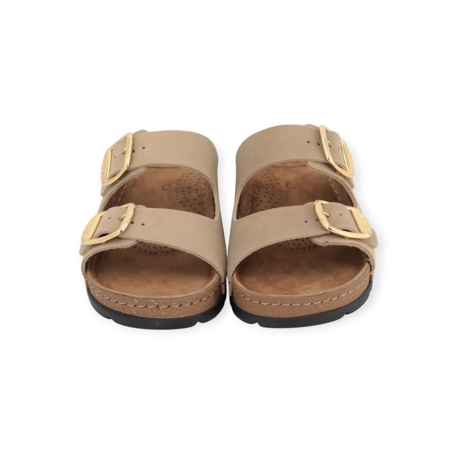 Slipper Bora 2 Buckles van Scholl voor dames. Deze beige slipper in suède is een feilloze samensmelting van mode en comfort. Dankzij de twee banden met de klassieke Scholl-gespen is de schoen verstelbaar. Dit ergonomisch ontwerp vormt de Scholl binnenzool ‘Bioprint technologie’ naar de vorm van uw voet en helpt deze in de juiste positie te houden. Heeft een licht verhoogde sleehak van 30-35mm hoog en is op een donkere antislipzool.