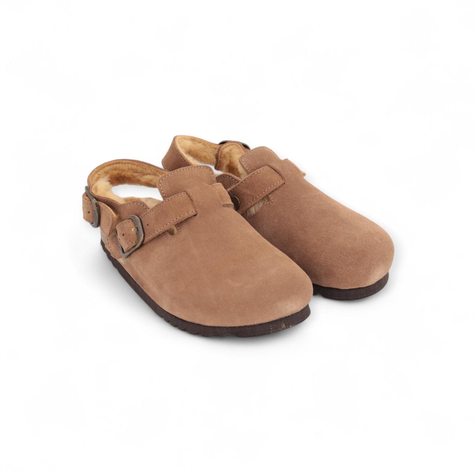 Slipper Fae Backstrap van Scholl voor dames. Deze slipper is in cognac suède De slipper heeft 2 verstelbare gespen in metaal aan de bovenkant om je pasvorm aan te passen en achteraan aan de hiel. De zachte met bont voering biedt comfort en ondersteuning. Is op een vaste antislipzool