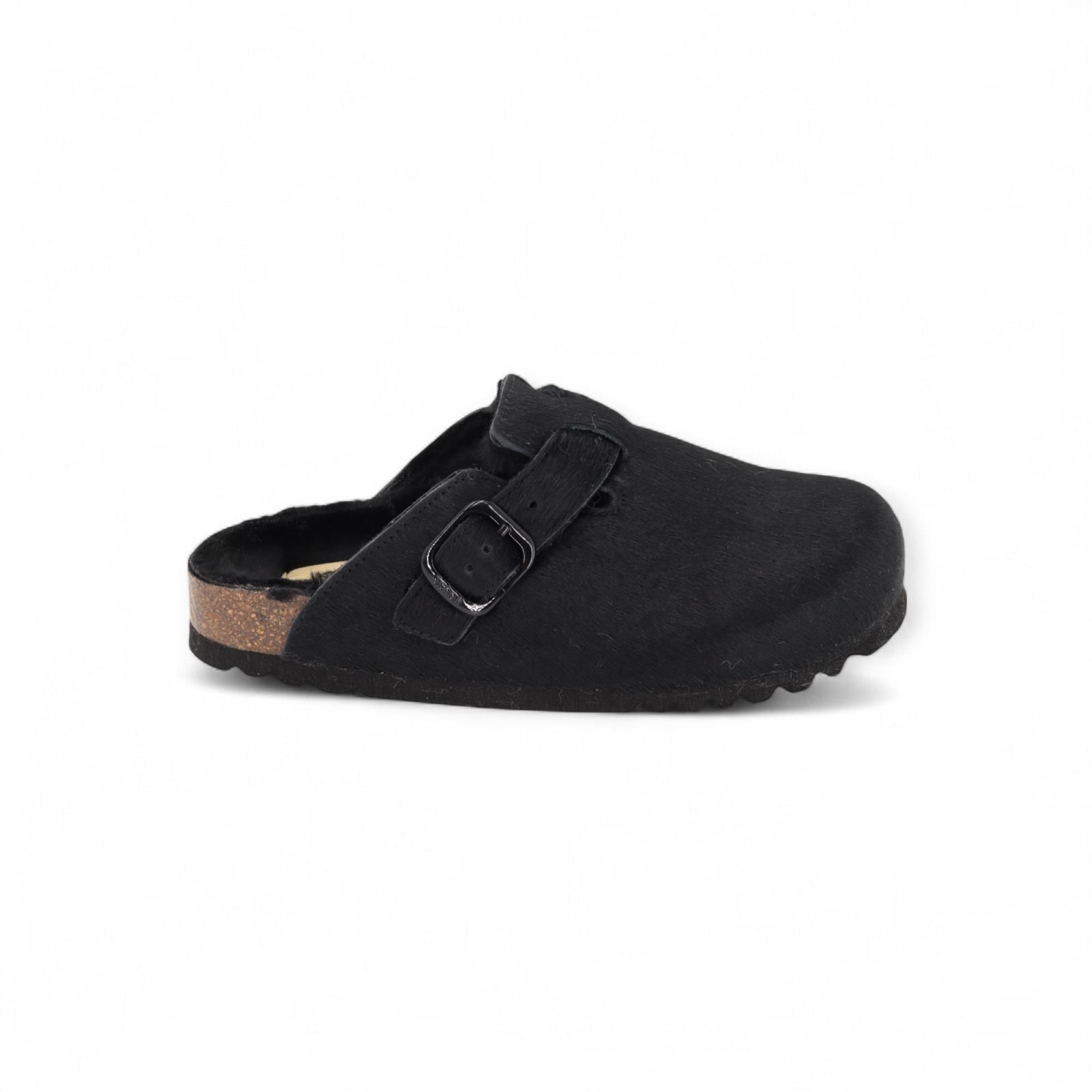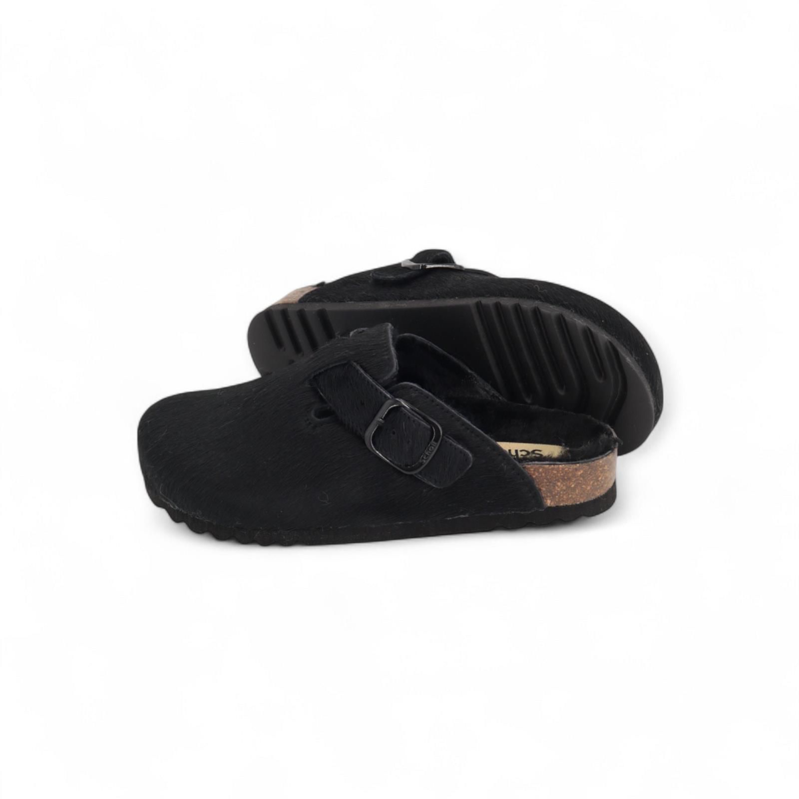Slipper Fae New F Seu van Scholl voor dames. Deze pantoffels in zwart pony zijn de perfecte combinatie van mode en functionaltieit. De met bont gevoerde slippers hebben een chic design. Ze zijn verstelbaar dankzij de gespsluiting en bieden de hele dag comfort en warmte. Is op een vaste antislipzool.