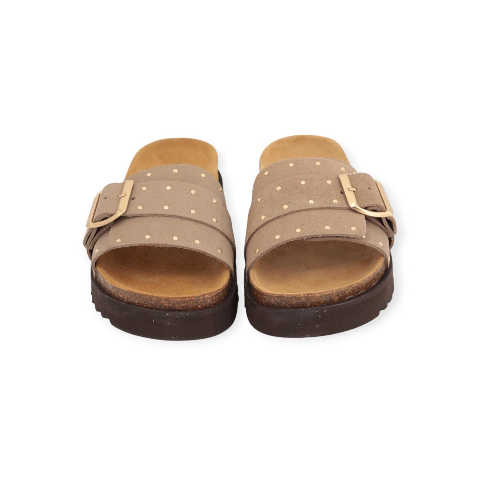 Slipper Joyce van Scholl voor dames. Deze slipper is in beige suède met studs. Heeft een enkele band die zich subtiel om de voorkant van de voet wikkelt en zo een verfijnde elegante uitstraling biedt. Is op een licht verhoogde sleehak van 35mm met een donkere antislipzool.