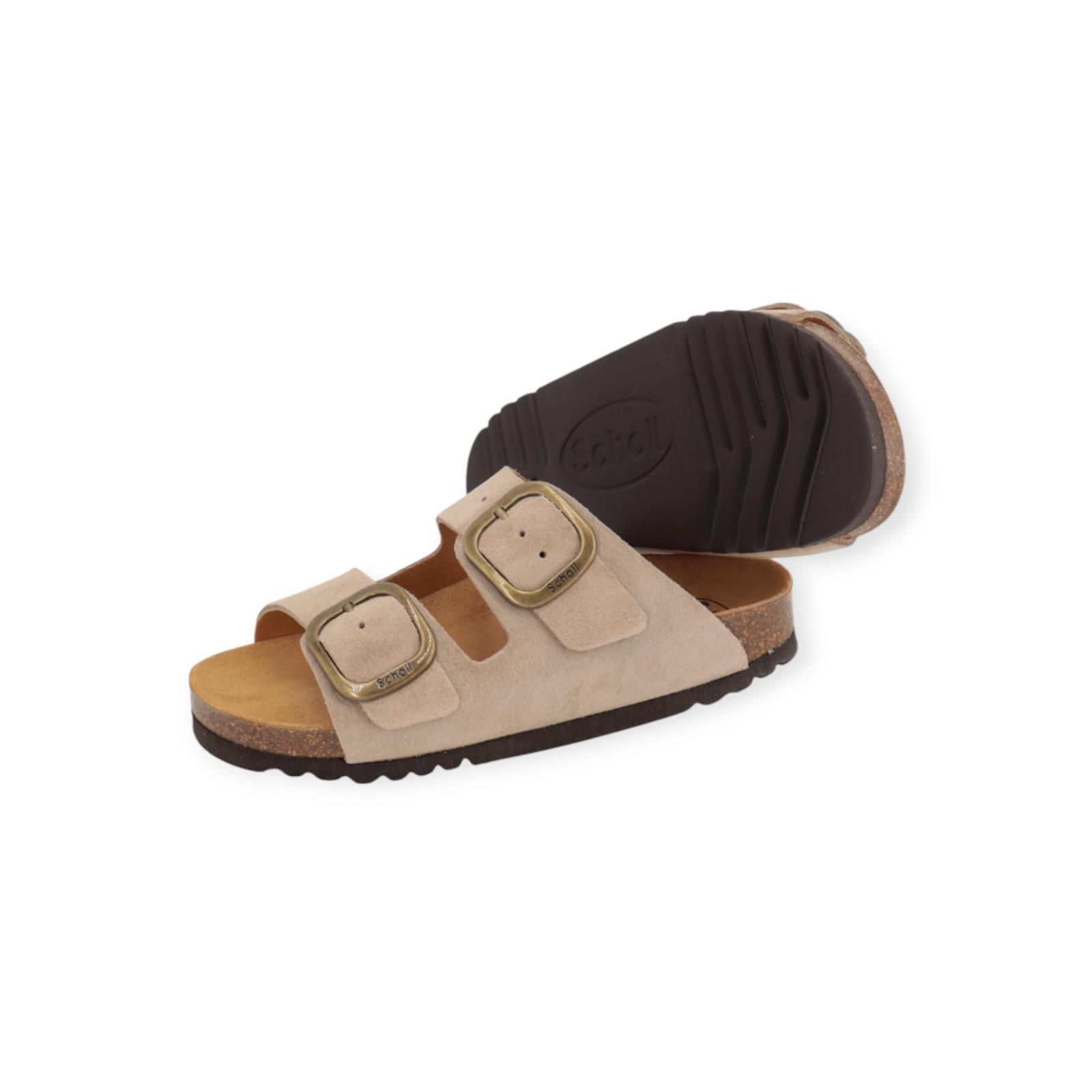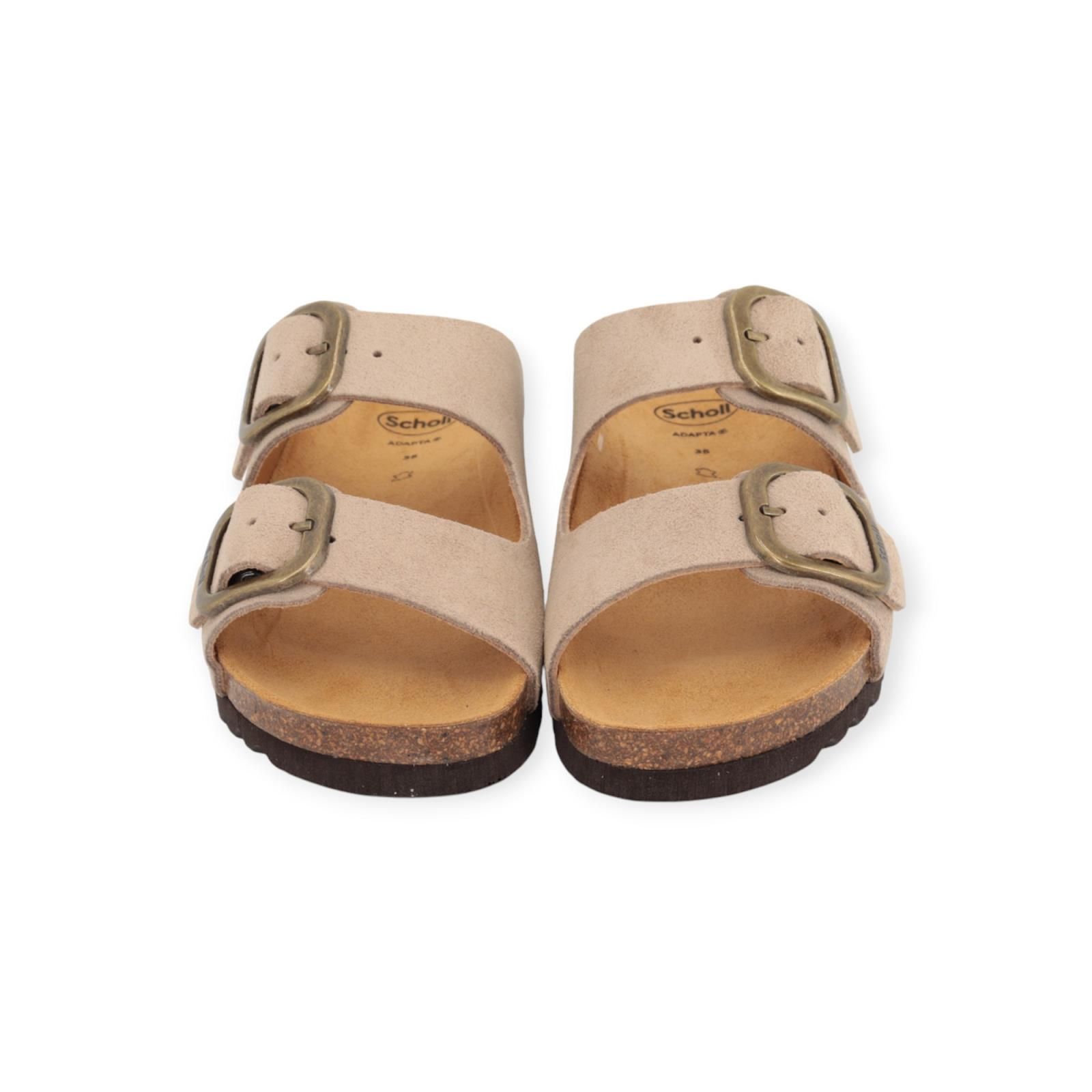 Slipper Noelle van Scholl voor dames. Deze slipper is in beige suède. Dankzij de twee banden met een klassieke Scholl-gesp is de schoen verstelbaar voor optimaal comfort. Het Softstep®-voetbed, met zijn speciale vorm in het voetbooggedeelte, verhoogt het gevoel van comfort en helpt uw gewicht te ondersteunen bij elke stap.