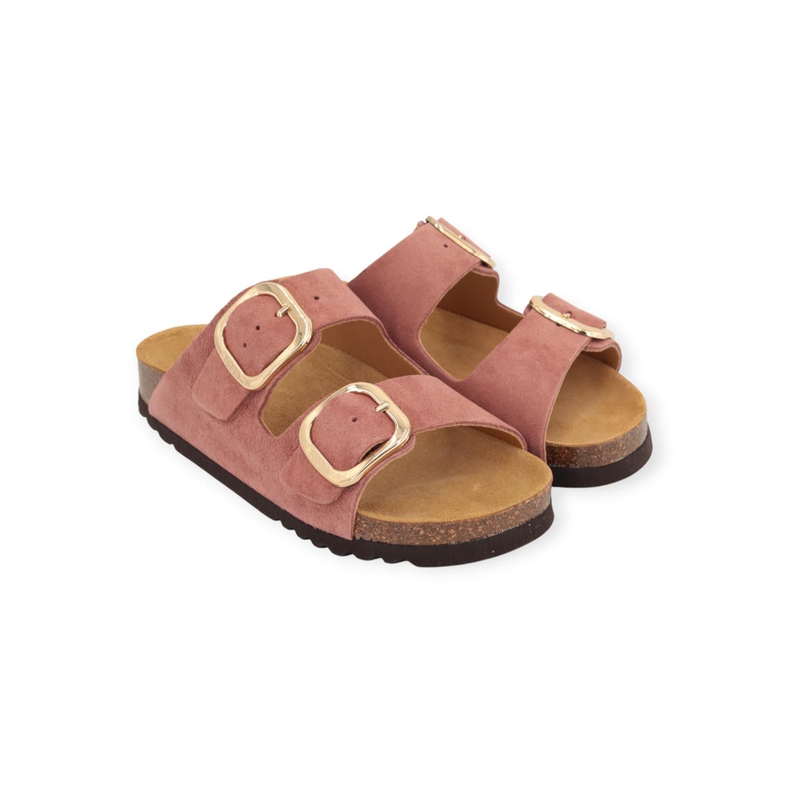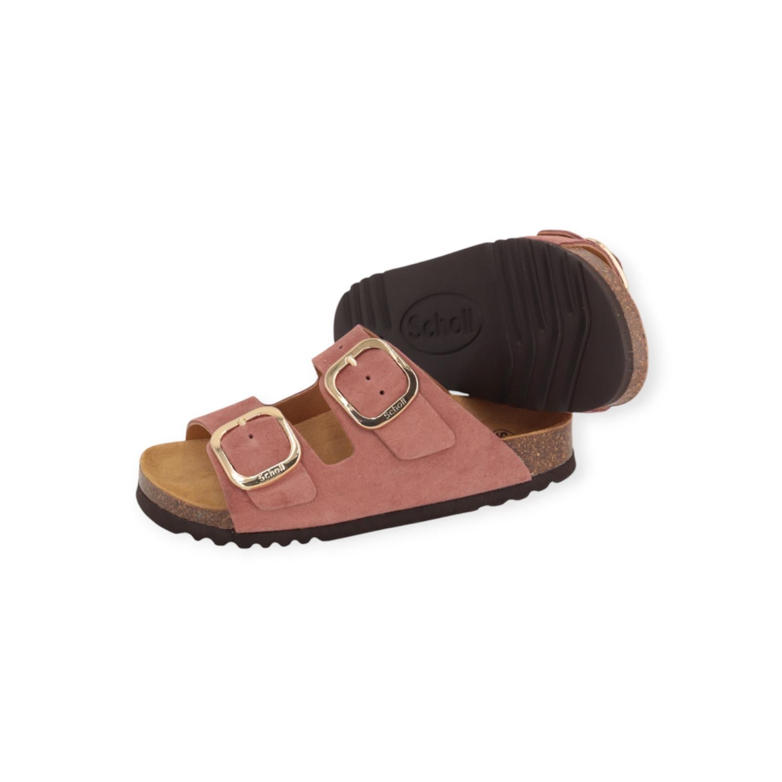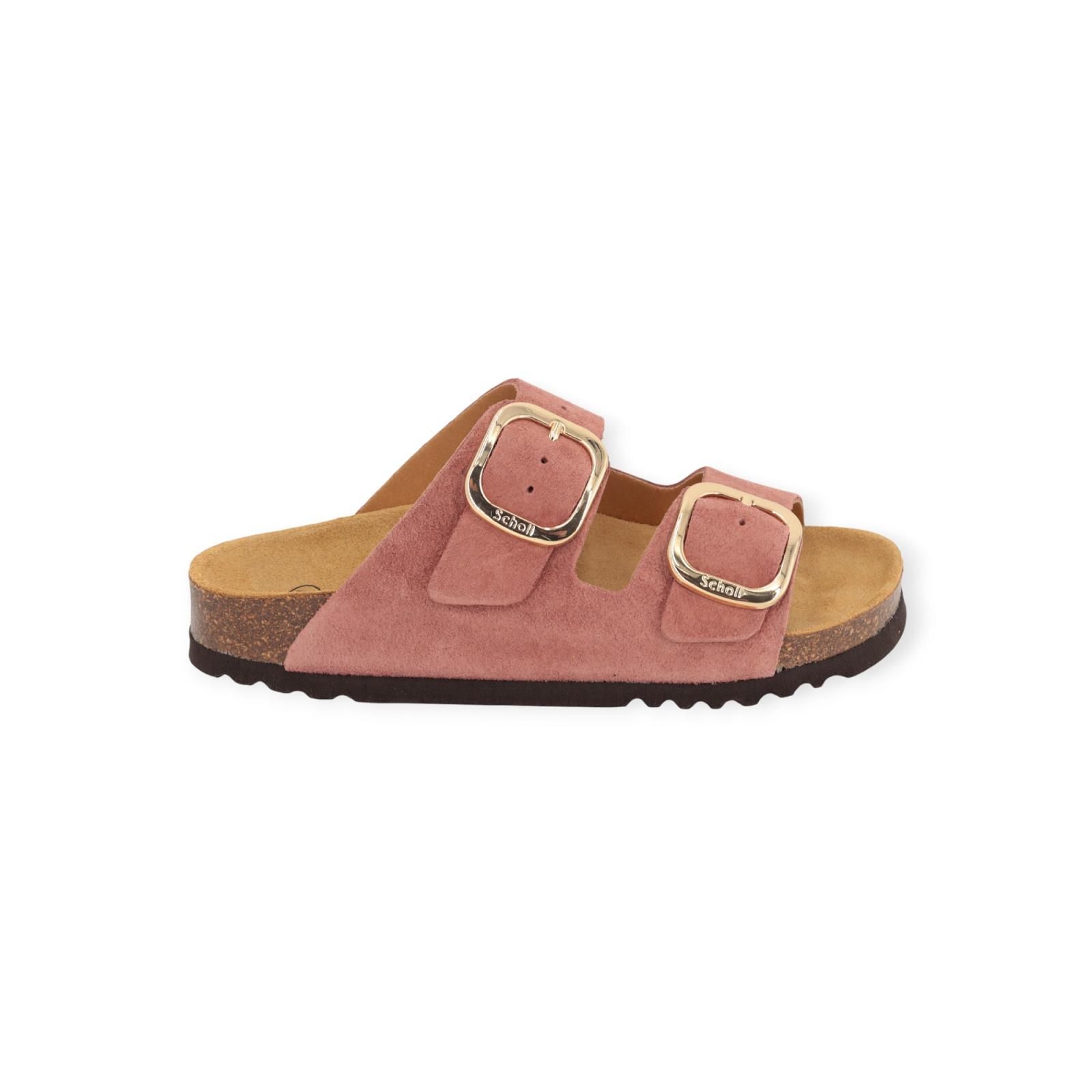 Slipper Noelle van Scholl voor dames. Deze slipper is in donker roze suède. Dankzij de twee banden met een gouden Scholl-gesp is de schoen verstelbaar voor optimaal comfort. Het Softstep®-voetbed, met zijn speciale vorm in het voetbooggedeelte, verhoogt het gevoel van comfort en helpt uw gewicht te ondersteunen bij elke stap.