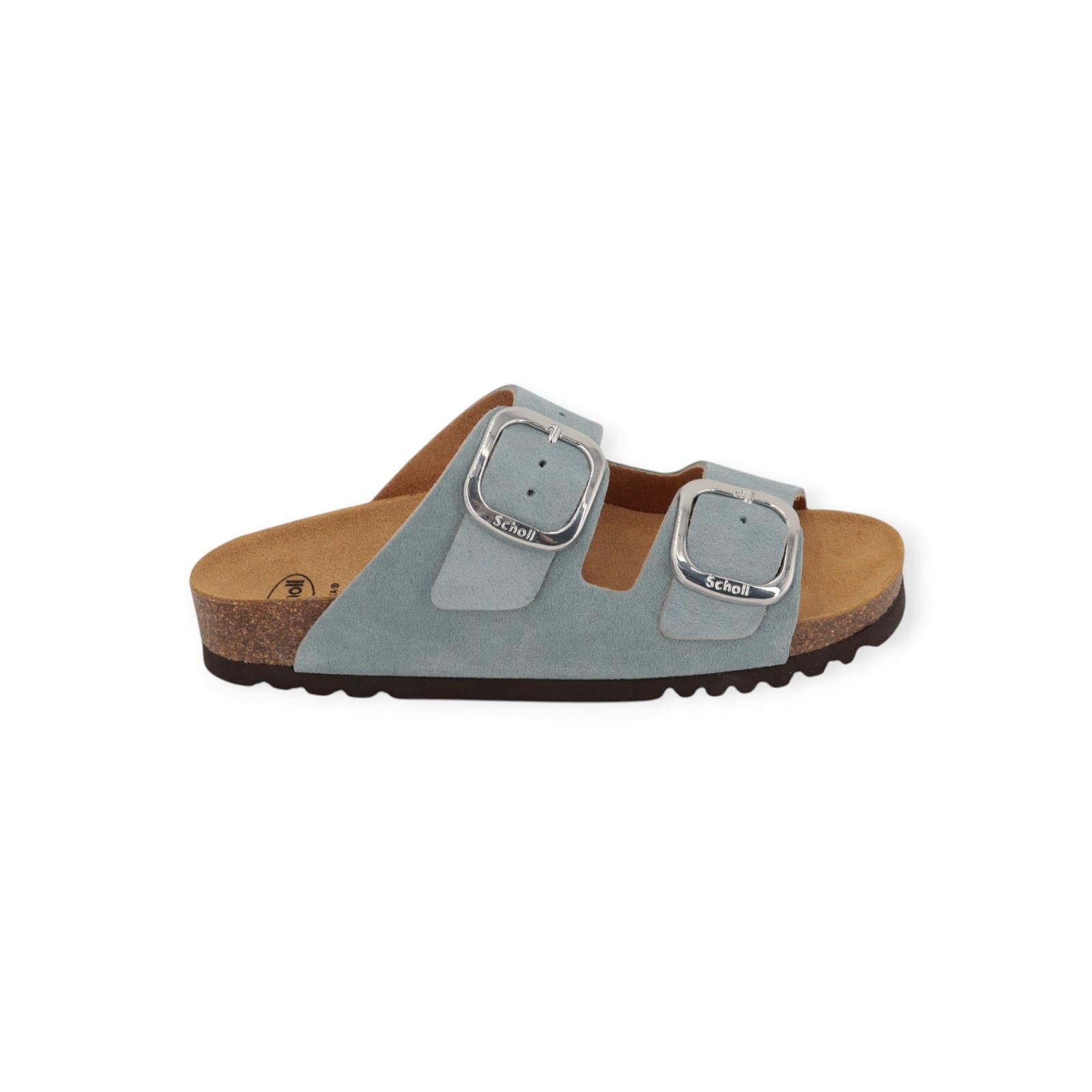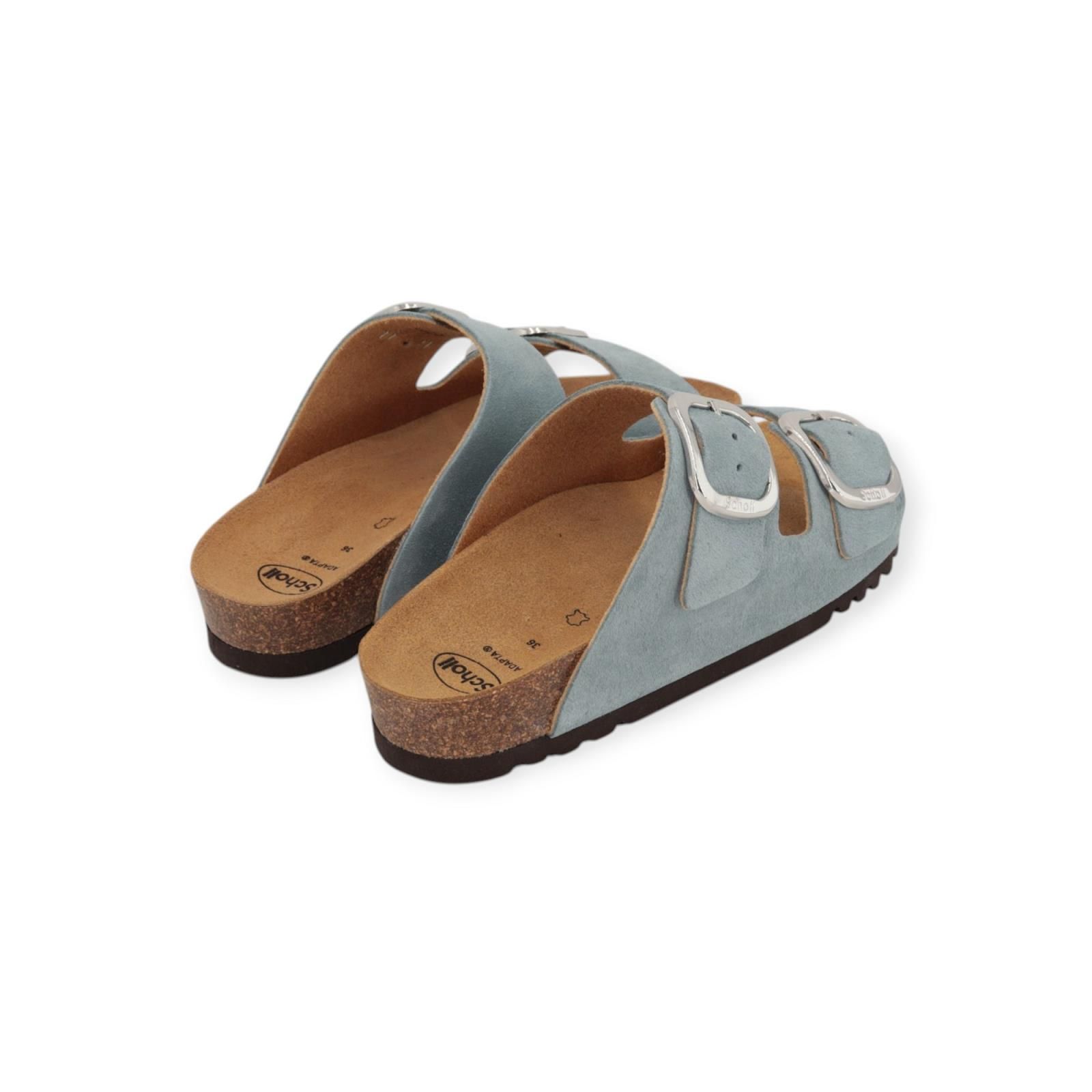 Slipper Noelle van Scholl voor dames. Deze slipper is in lichtblauw ‘denim’ suède. Dankzij de twee banden met een klassieke Scholl-gesp is de schoen verstelbaar voor optimaal comfort. Het Softstep®-voetbed, met zijn speciale vorm in het voetbooggedeelte, verhoogt het gevoel van comfort en helpt uw gewicht te ondersteunen bij elke stap.