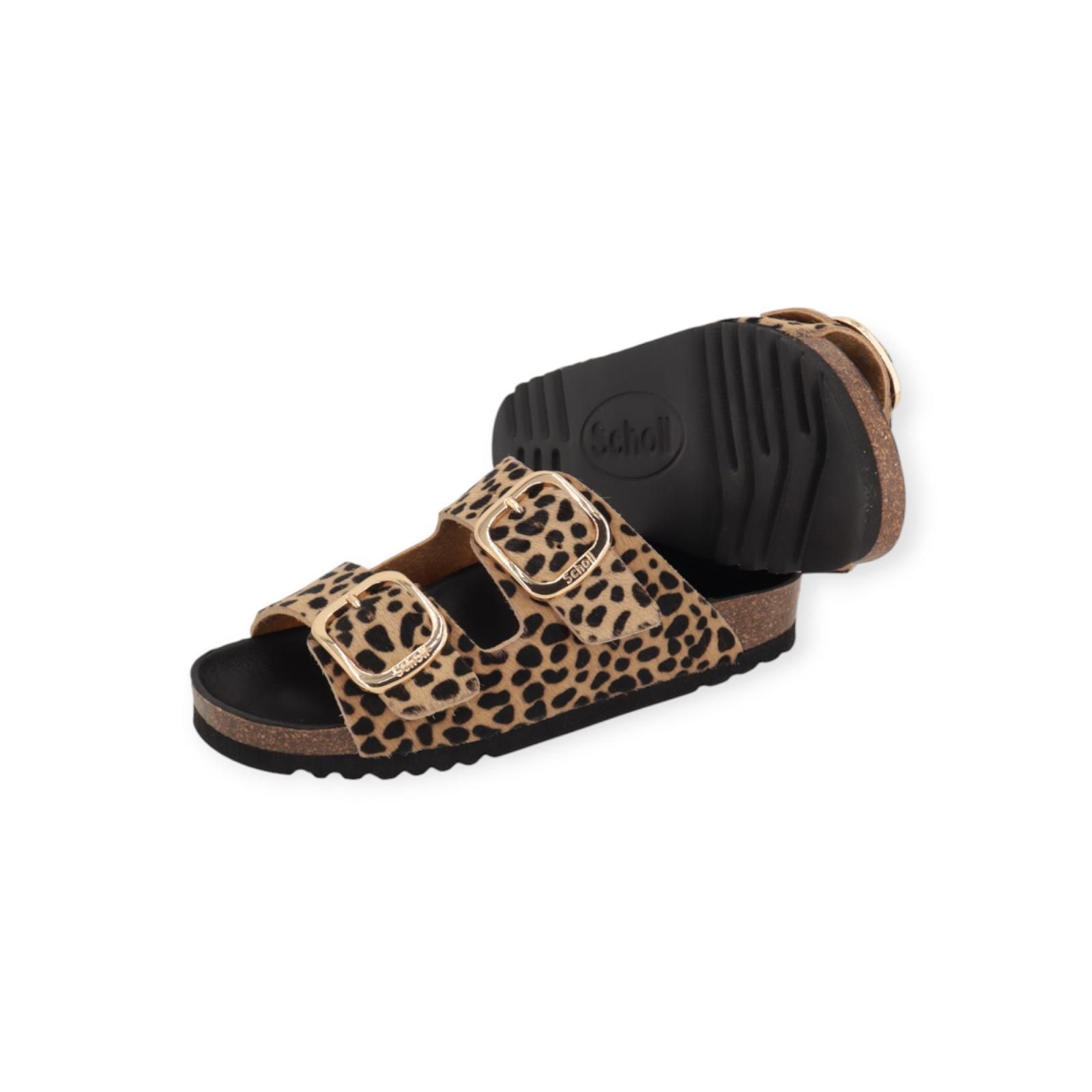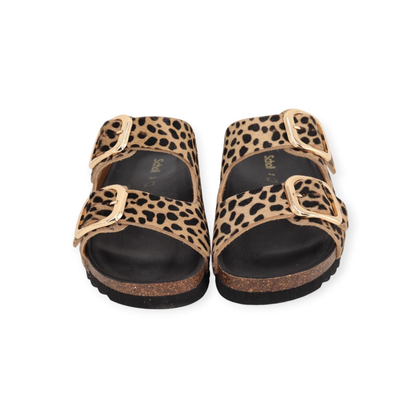 Slipper Noelle van Scholl voor dames. Deze slipper is in leopard pony. Dankzij de twee banden met gouden Scholl-gesp is de schoen verstelbaar voor optimaal comfort. Het Softstep®-voetbed, met zijn speciale vorm in het voetbooggedeelte, verhoogt het gevoel van comfort en helpt uw gewicht te ondersteunen bij elke stap.