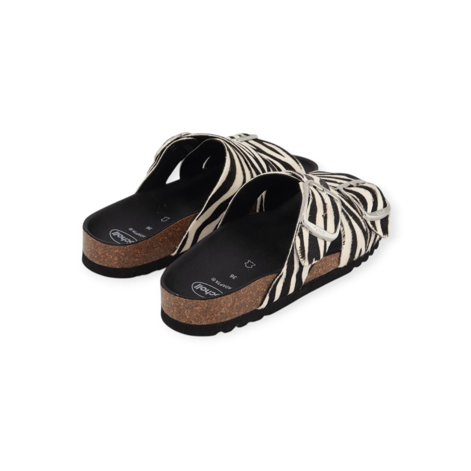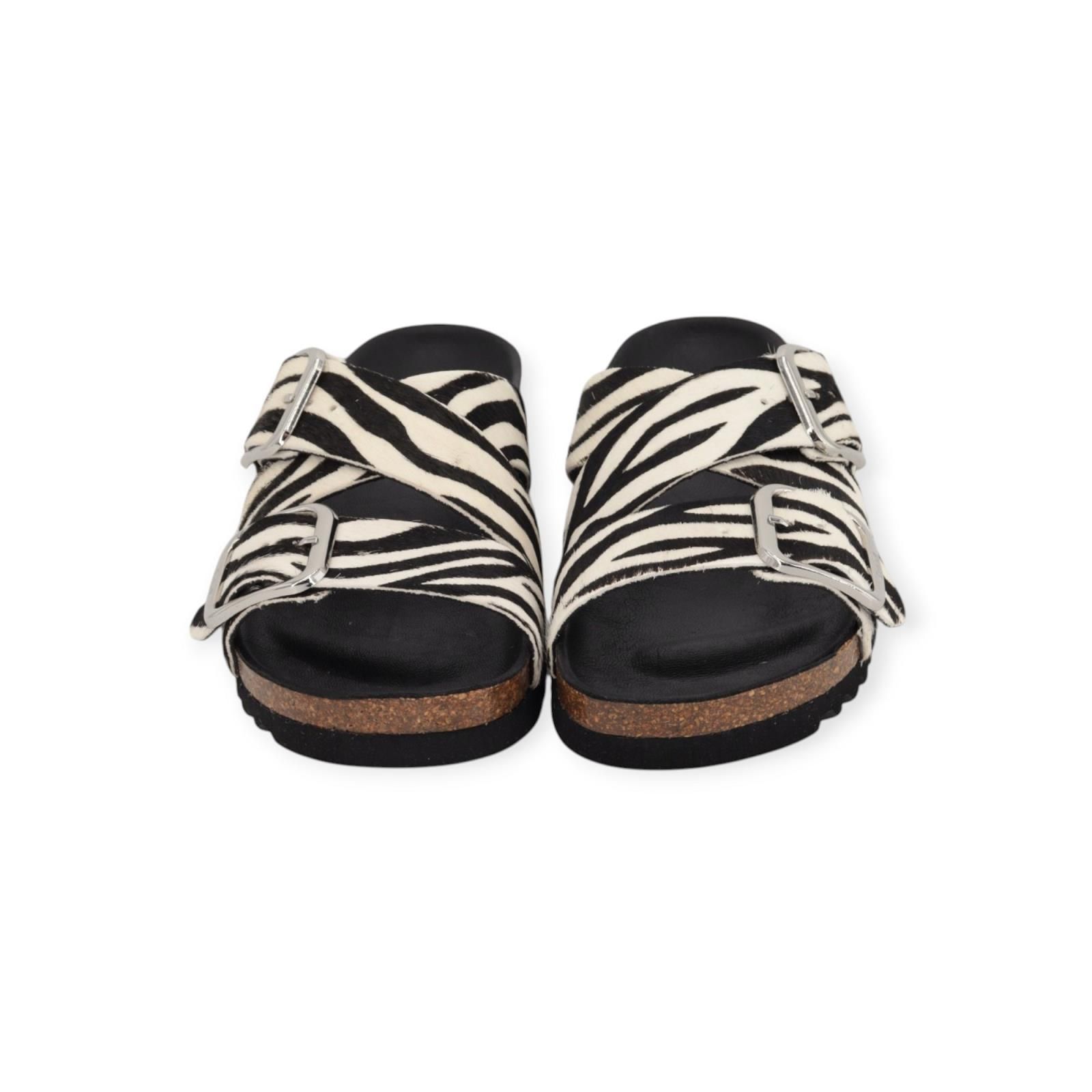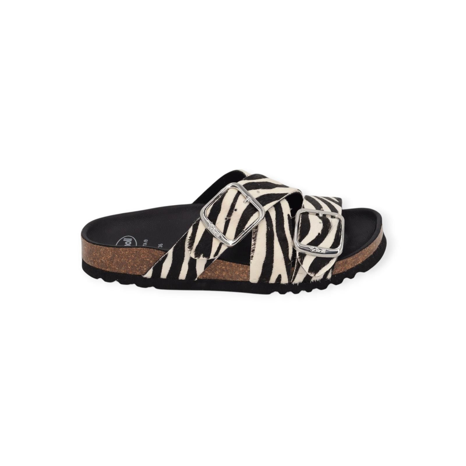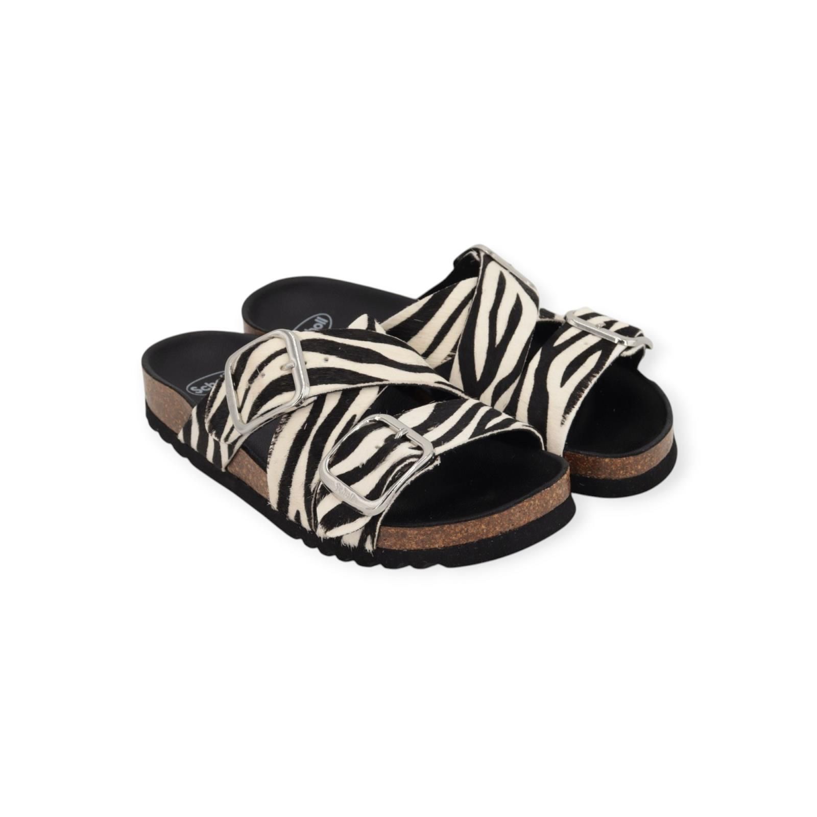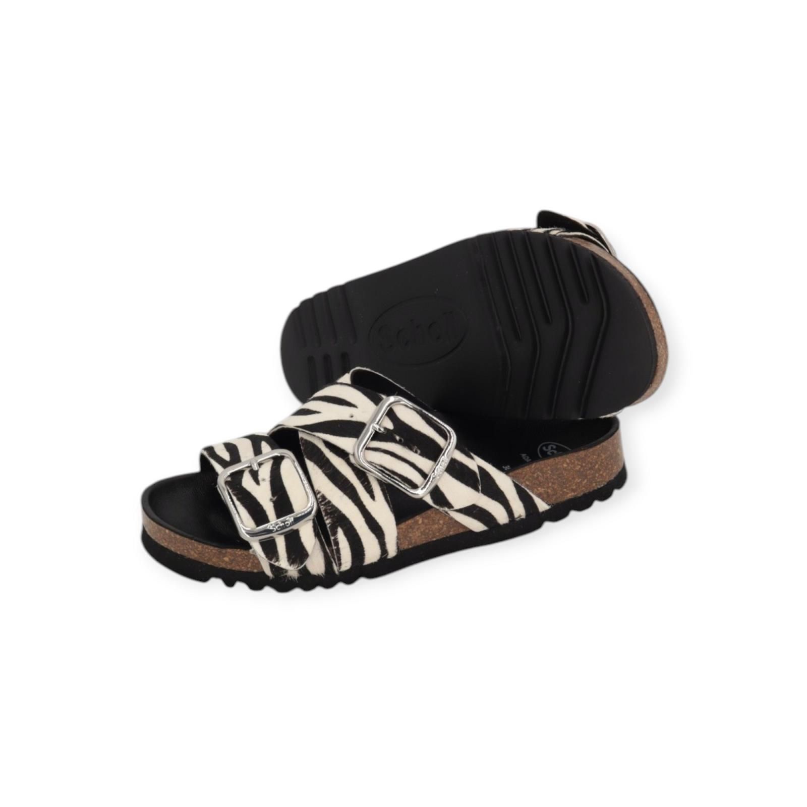 Slipper Selene van Scholl voor dames. Deze slipper is in zebra ponyvel. Is met gekruiste banden over de wreef en verstelbare gespen. Het Softstep®-leren voetbed helpt uw gewicht te ondersteunen bij elke stap
