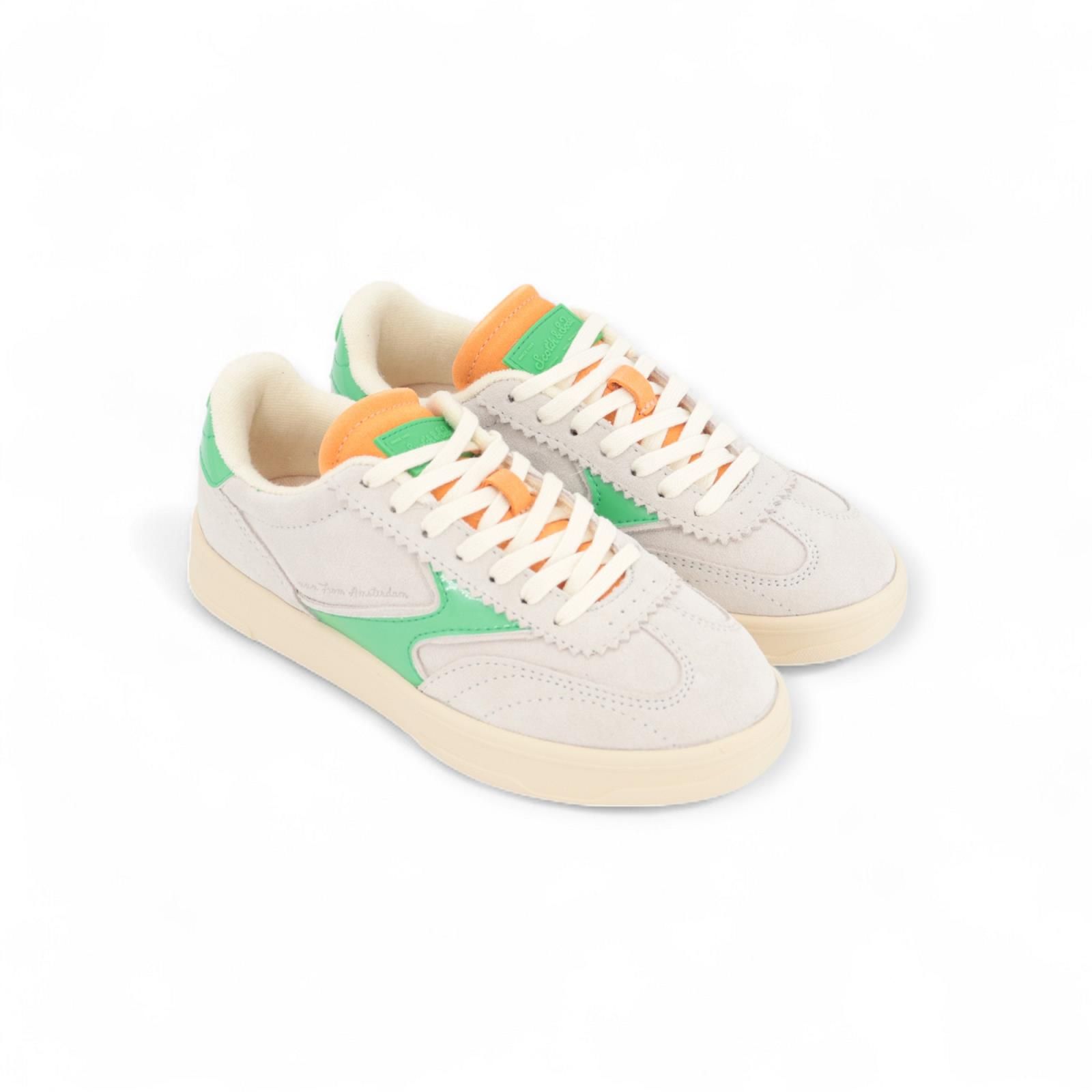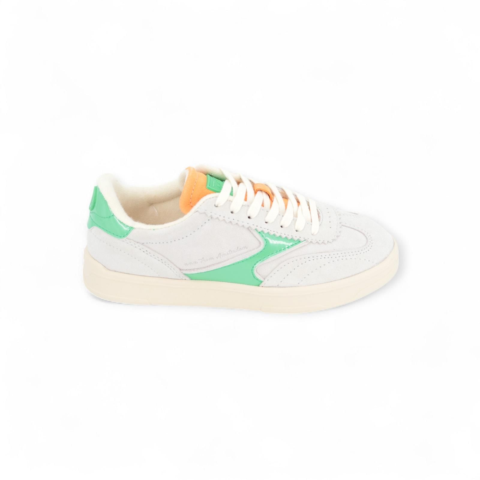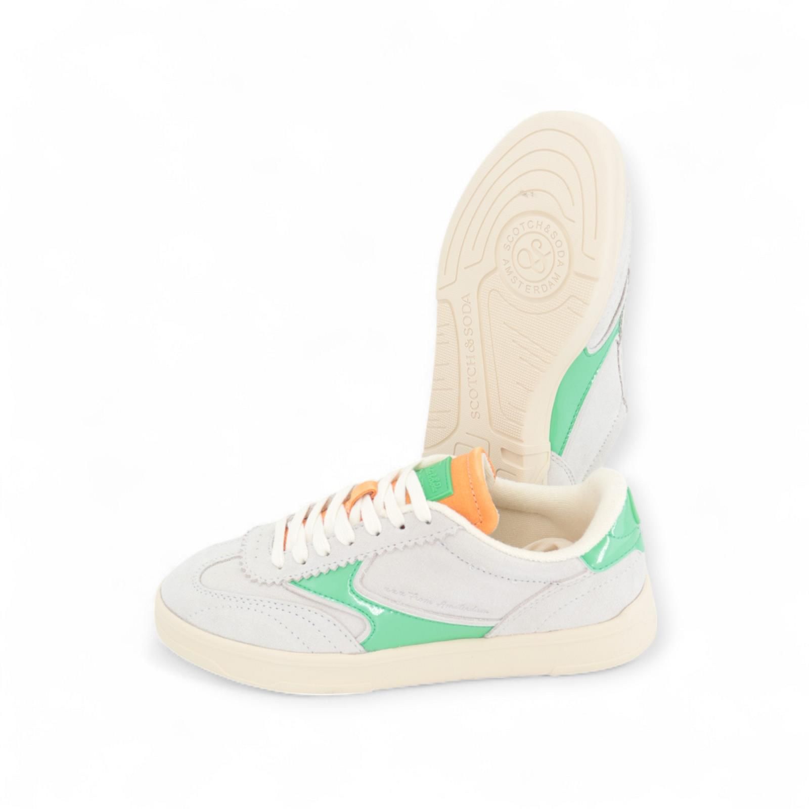Sneaker Nixie van Scotch&Soda voor dames. Deze sneaker is in grijs suède met groen lakleder. Is op een gummy bruine zool en heeft een uitneembare binnenzool.