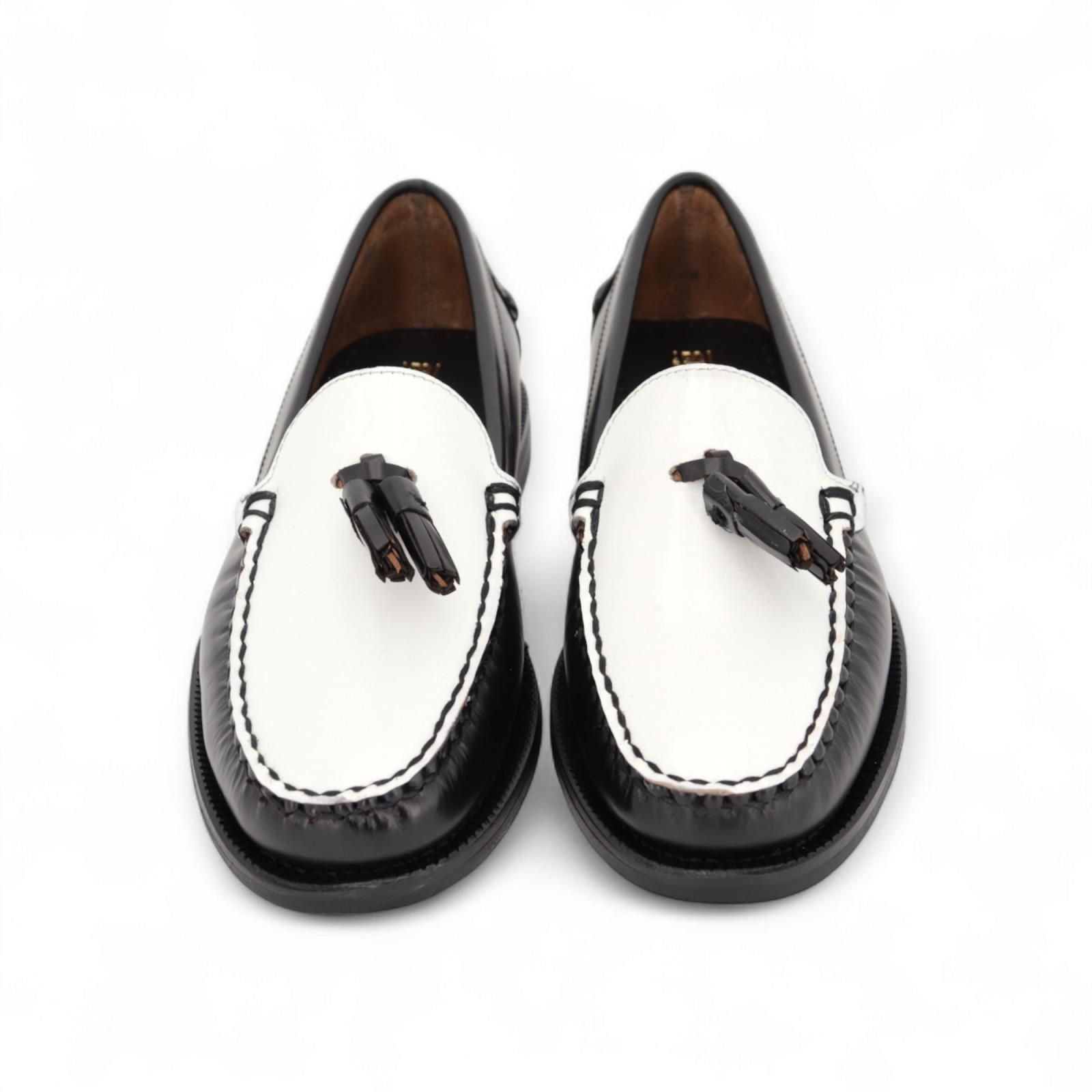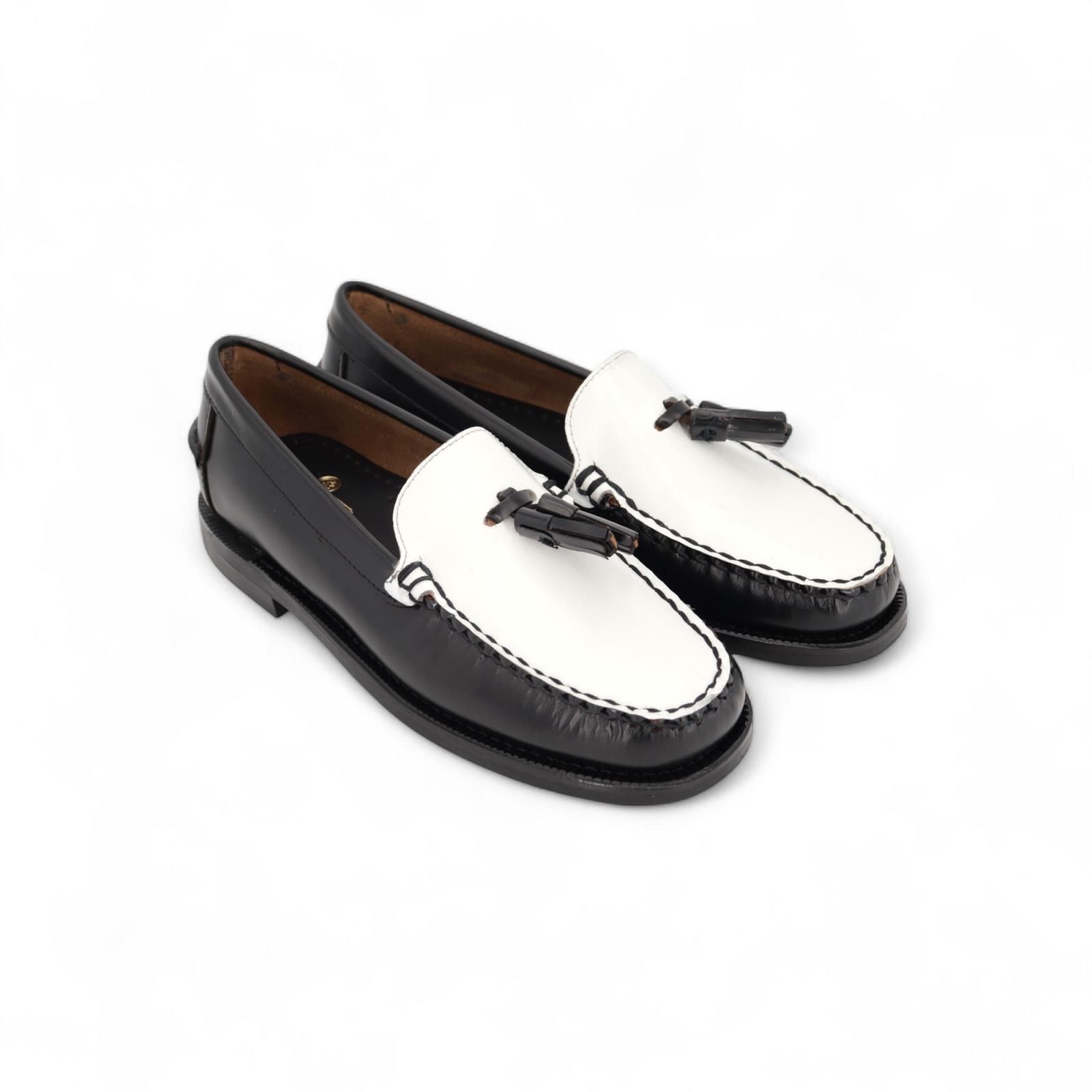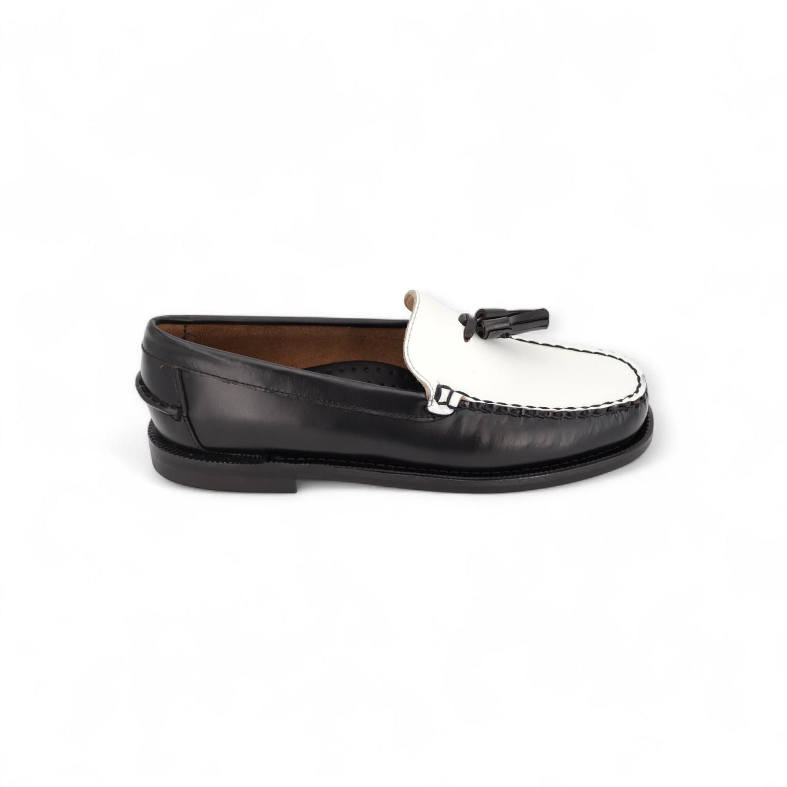 De Sebago citysides Classic Will loafers zijn vervaardigd uit fijn gepolijst, duurzaam leer. De zijkanten zijn in het zwart met flosh en de bovenkant in wit. Deze handgemaakte schoenen hebben een mocassin-geïnspireerde neus met franjes en is een klassiek ontwerp. De bovenkant is ademend en zonder voering, met stevige leren zolen, aangevuld met een rubberen hak voor extra grip. De Will loafer is een tijdloze, comfortabele schoen die nooit uit de mode raakt en perfect is voor elke gelegenheid.