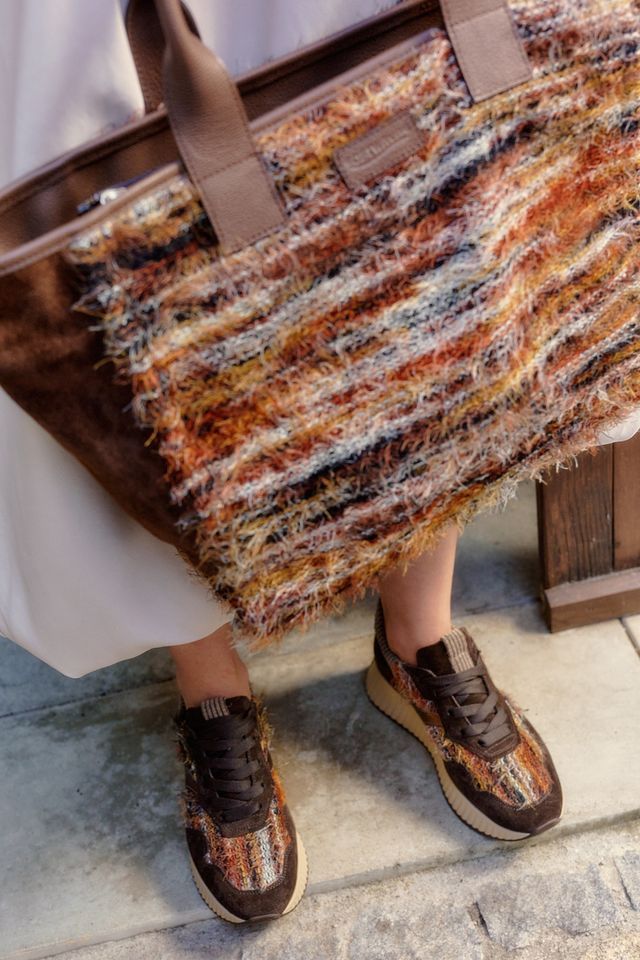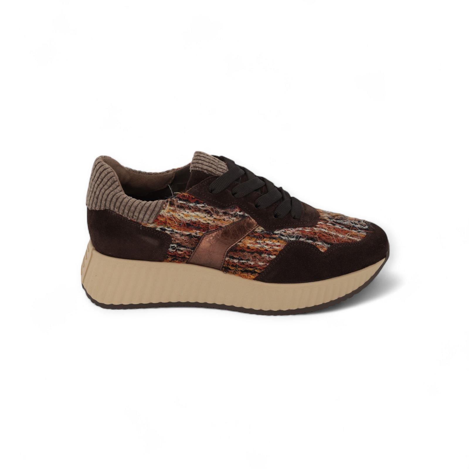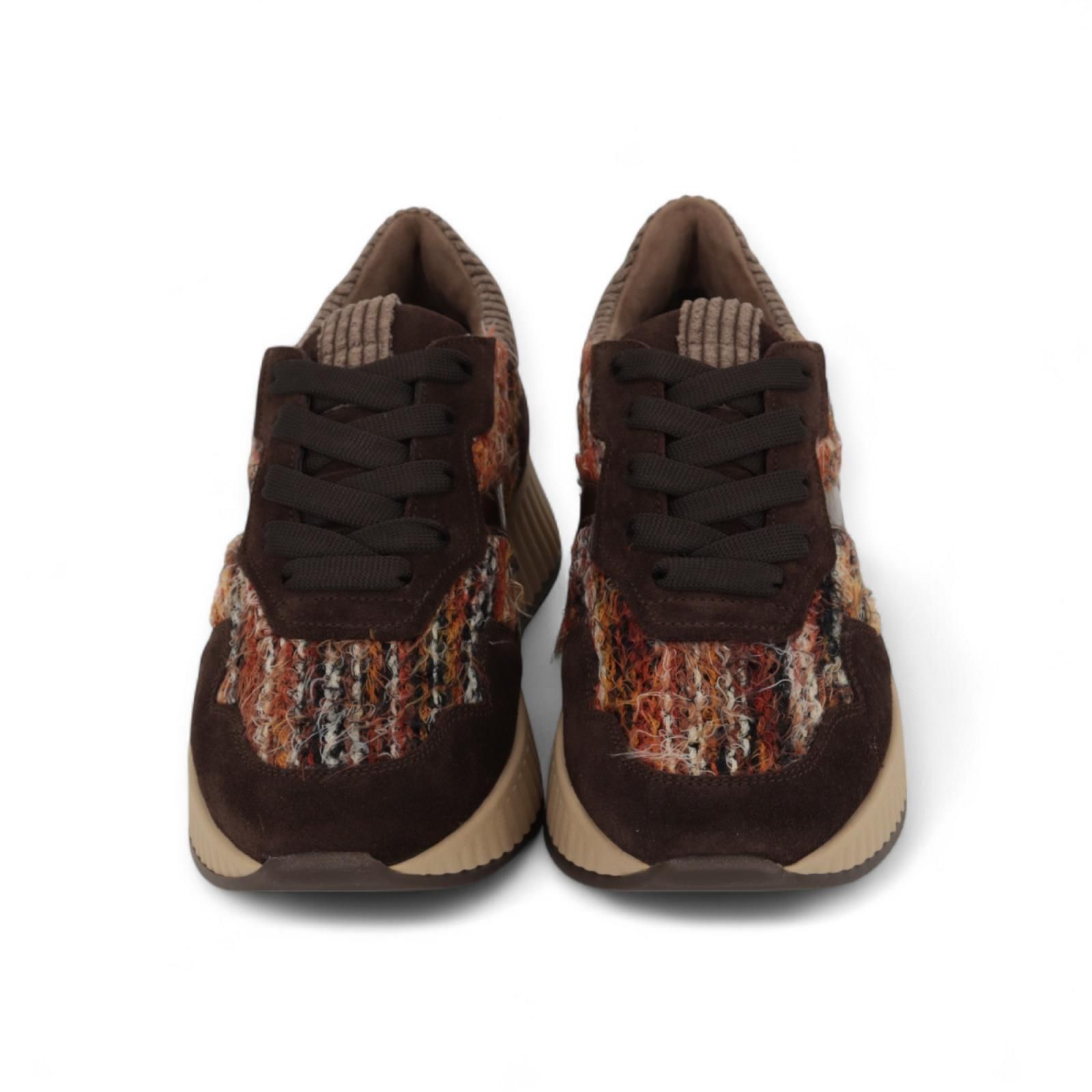 Sneaker Alana van Softwaves voor dames. Deze sneaker is in bruin suède met taupe hielflap in geribd stof . Afgewerkt met multi kleuren mesh in stof aan de wreef en zijkanten met een goud shining stiksel. Is op een dikke zool die voor aangenaam comfort zorgt. De binnenzool is steeds uitneembaar bij softwaves.