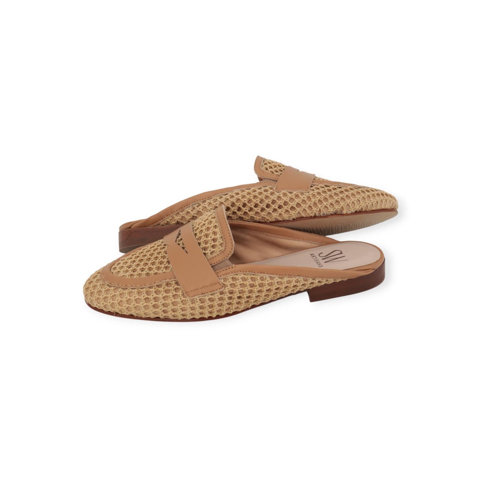 Slipper Sinclair van Softwaves voor dames. Dit elegant muiltje is in cognac leer met raffia. Heeft een rekker aan de wreef zodat het model mooi aan de voet blijft. Is op een leren buitenzool.