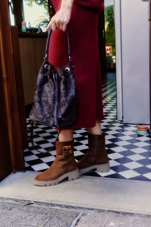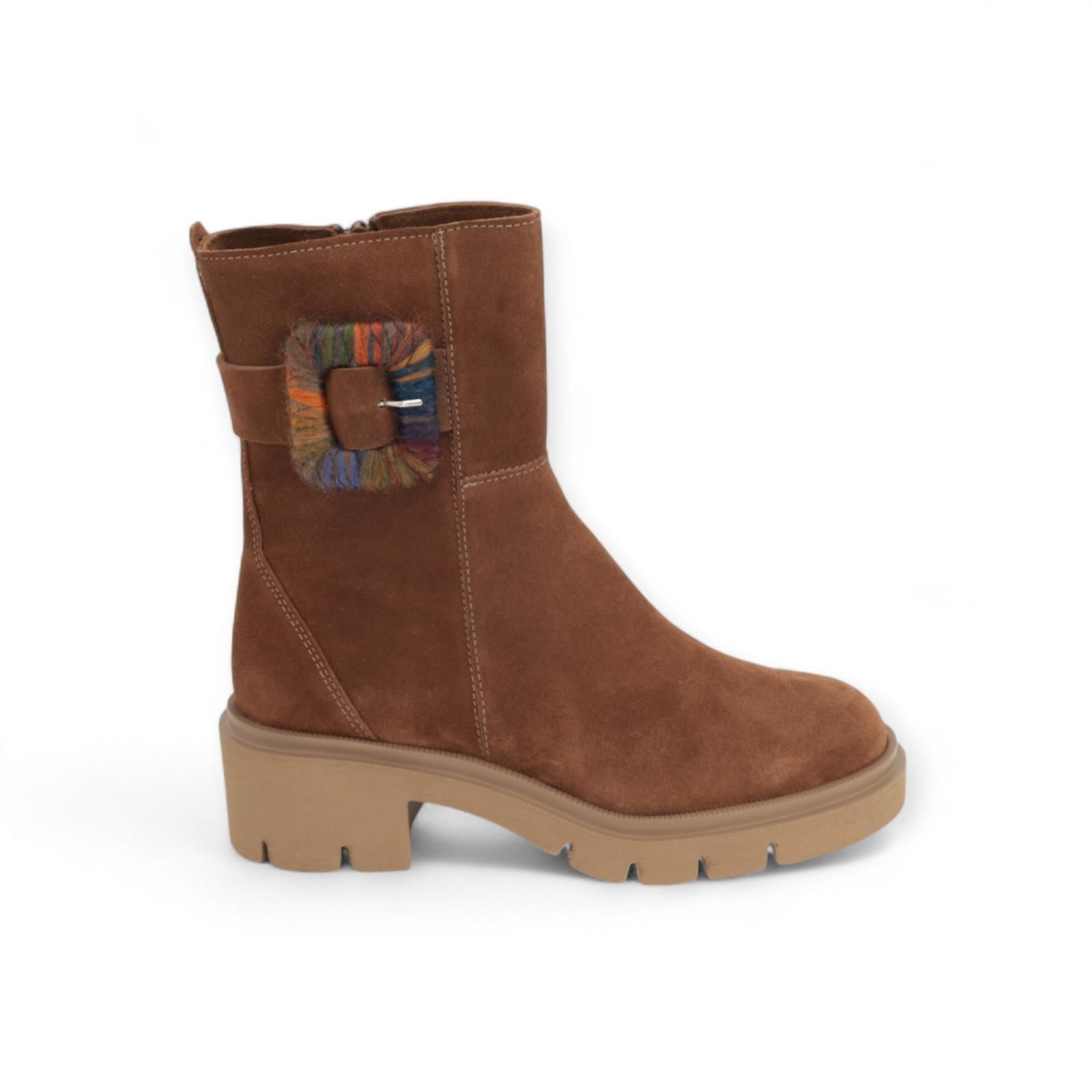 Enkellaars Valeria van Softwaves voor dames. Deze enkellaars is in cognac suède met een volledige ritssluiting. Is mooi afgewerkt met een gekleurde boekel aan de zijkant als accessoire. Heeft een ronde neus en een beige antislipzool met een blokhakje van 2cm hoog. De binnenzool is uitneembaar, ontdek het comfort van deze laars.