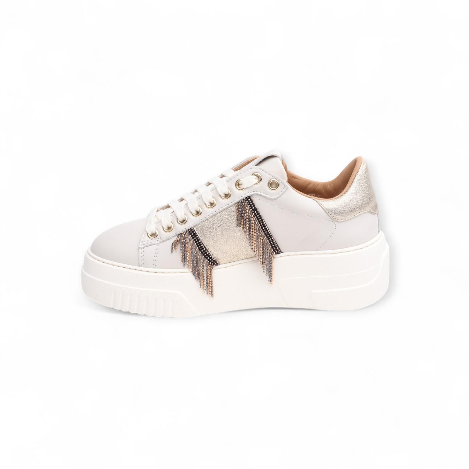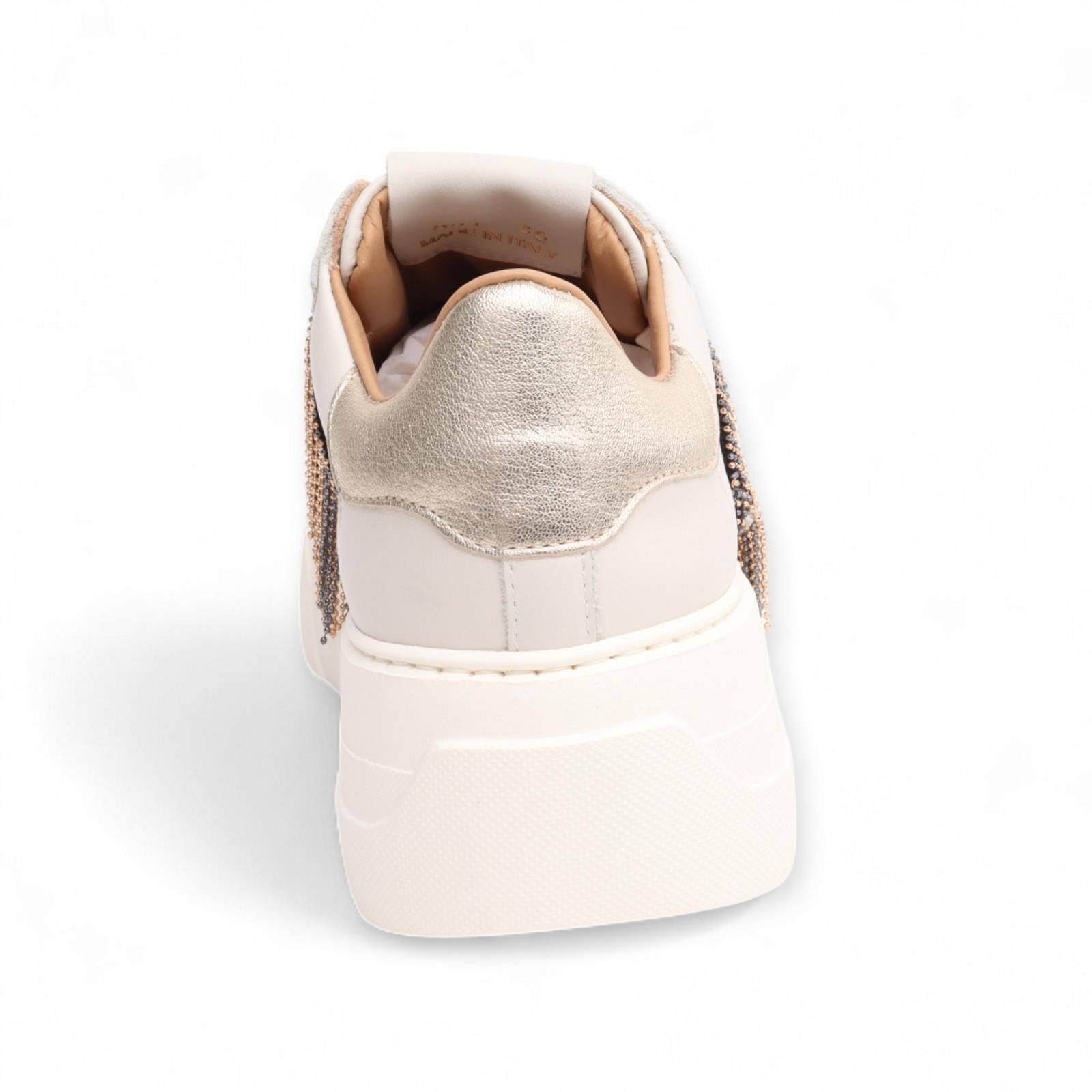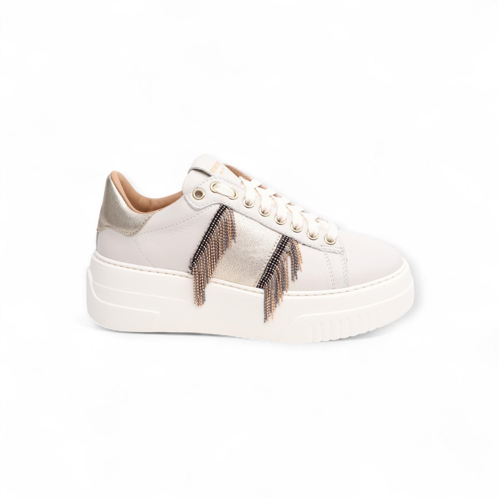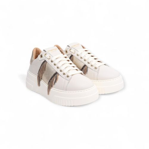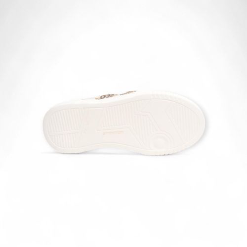 Brand Pendant Chains Stokton sneaker voor dames. Prachtige sneaker in beige met gouden afwerking aan de hiel en aan de zijkant. Aan de zijkant ook stijlvolle accessoires die jou sneaker laat opvallen. Is op een plateauzool met een uitneembare binnenzool.