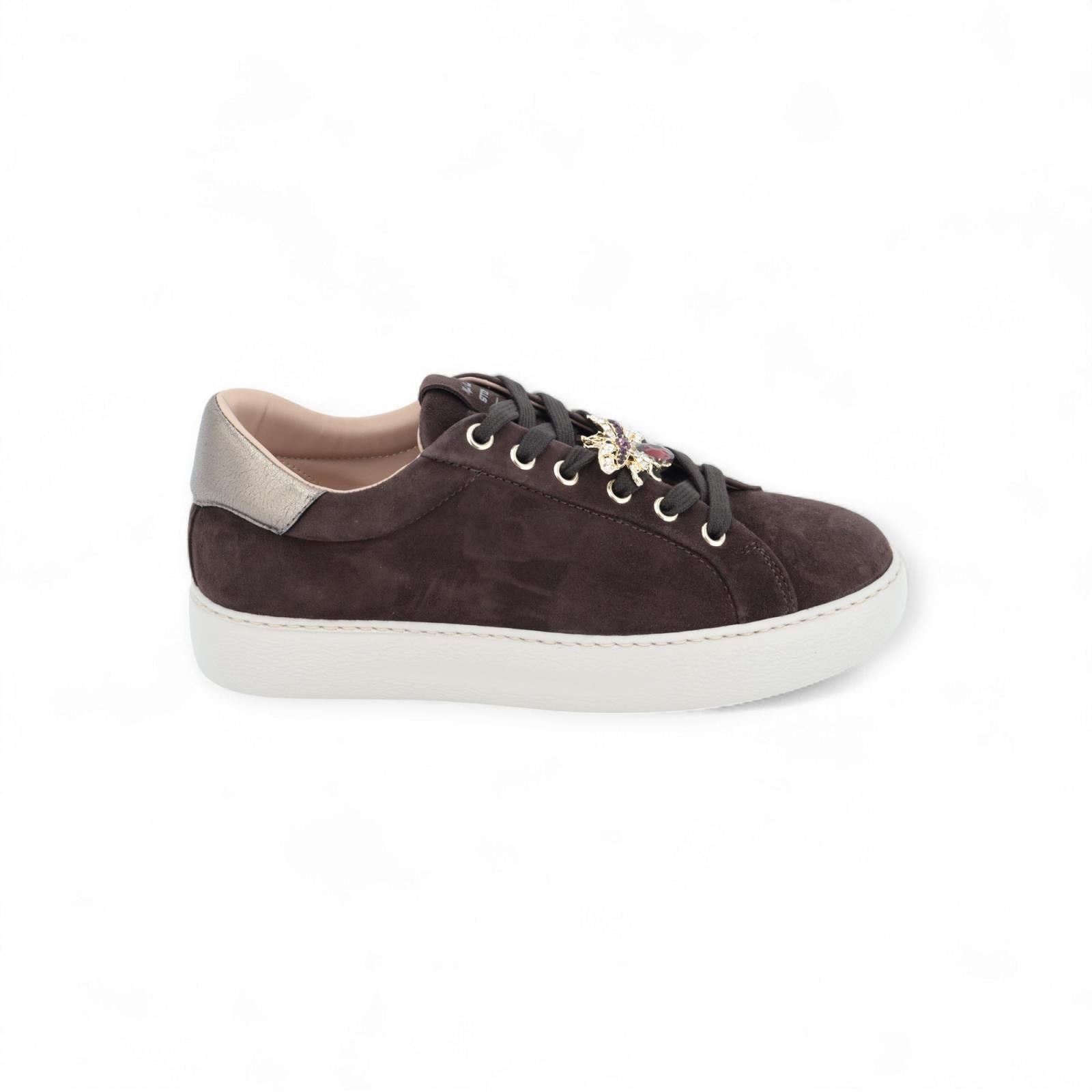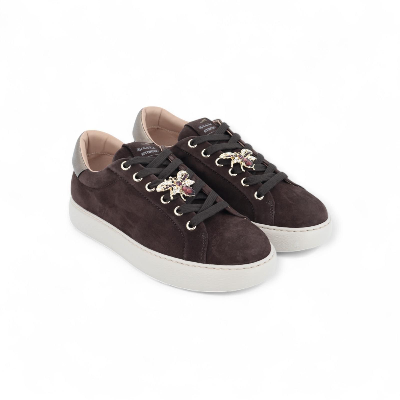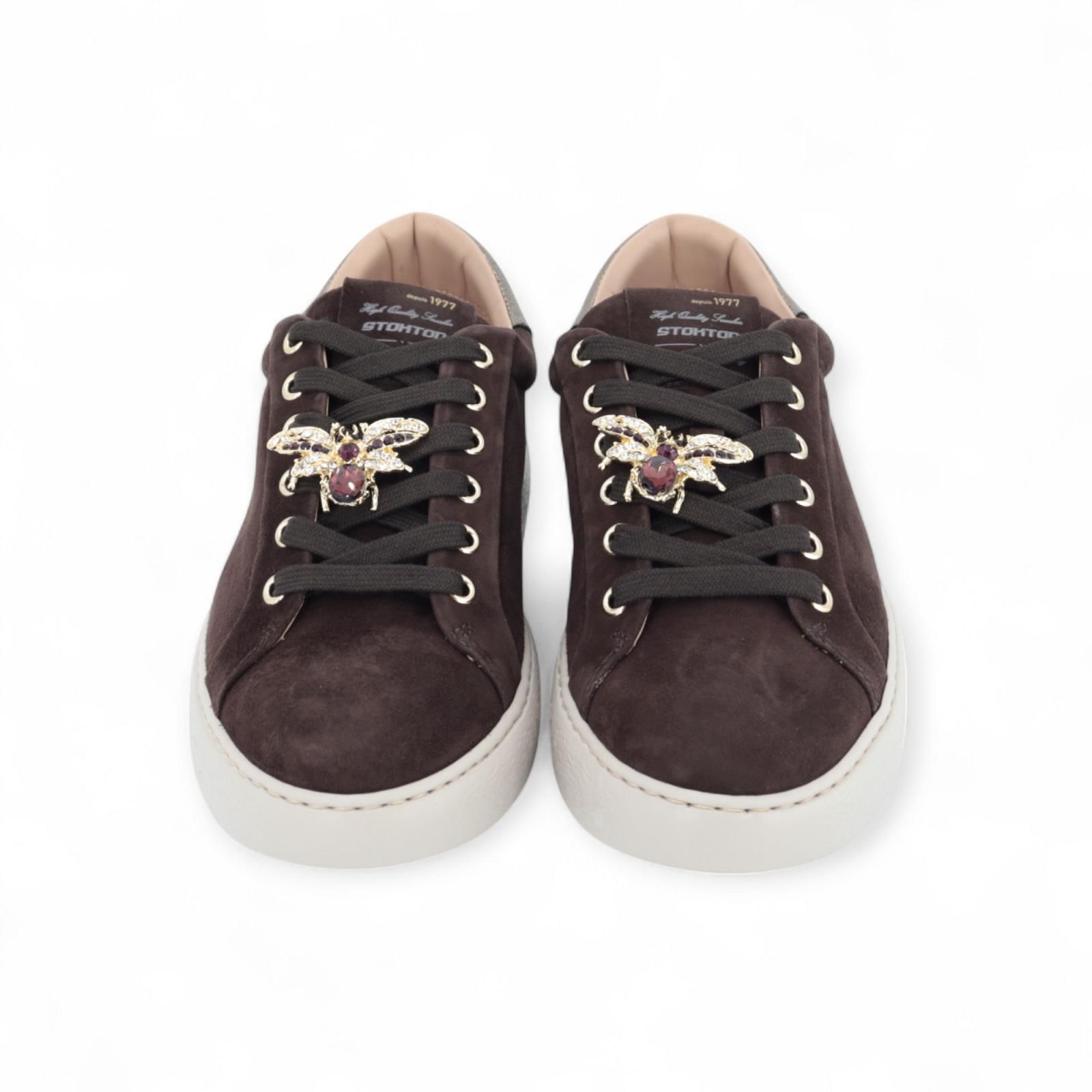 Sneaker Charming van Stokton voor dames. Deze sneaker is in donkerbruin suède met een gouden hielflap. Is afgewerkt met en een prachtig ‘bij’ accessoire op de veters met strassteentjes in goud, zwart en bordeaux. Is op een witte rubberen zool en de binnenzool is uitneembaar.