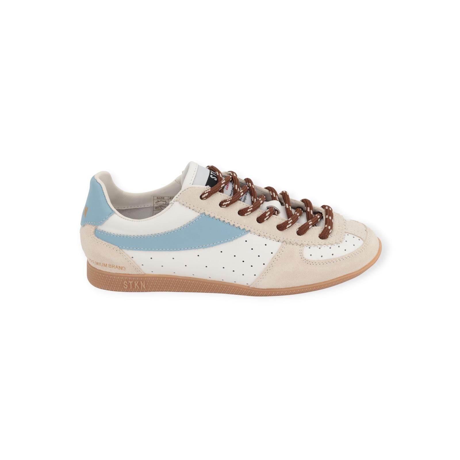 Sneaker Curry D-07 van Stokton voor dames. Deze lage sneaker is in wit geperforeerd leer met zand suède. Aan de zijkant en hielflap vind je mooie stukken lichtblauw leer. Is afgewerkt met opvallend bruin met wit gestreepte veters. Heeft een aangename gummyzool met een uitneembare binnenzool. Dit model is uit de STKN collectie van Stokton.