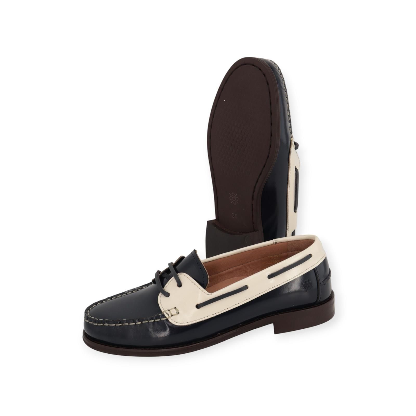 Mocassin The Elise van TOC – Playboy voor dames. Deze mocassin is in blauw leer met off wit. Is de typische old school bootschoen stijl met vetersluiting en veters langs de zijkant. Dé trend voor deze zomer. Heeft een lage rubberen buitenzool met een dempende microbinnenzool die voor aangenaam comfort zorgt.