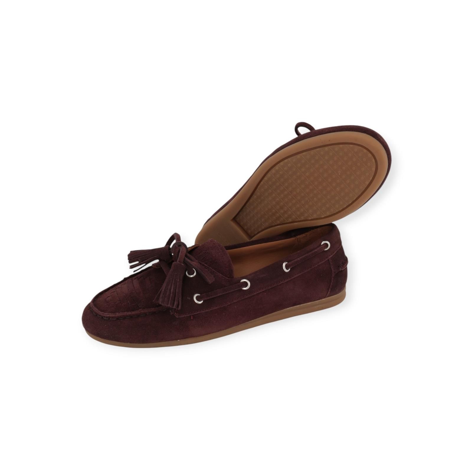 Mocassin Shima van Toral voor dames. Deze mocassin is in bordeaux zacht suède met een relaxt, tijdloos design. De klassieke kwastjes en contrasterende stiksels voegen een subtiele touch elegantie toe aan deze dagelijkse look. Licht, comfortabel en super makkelijk! Deze Toral is een typische bootschoen door de typerende veters langs de zijkant: dé trend voor deze zomer.