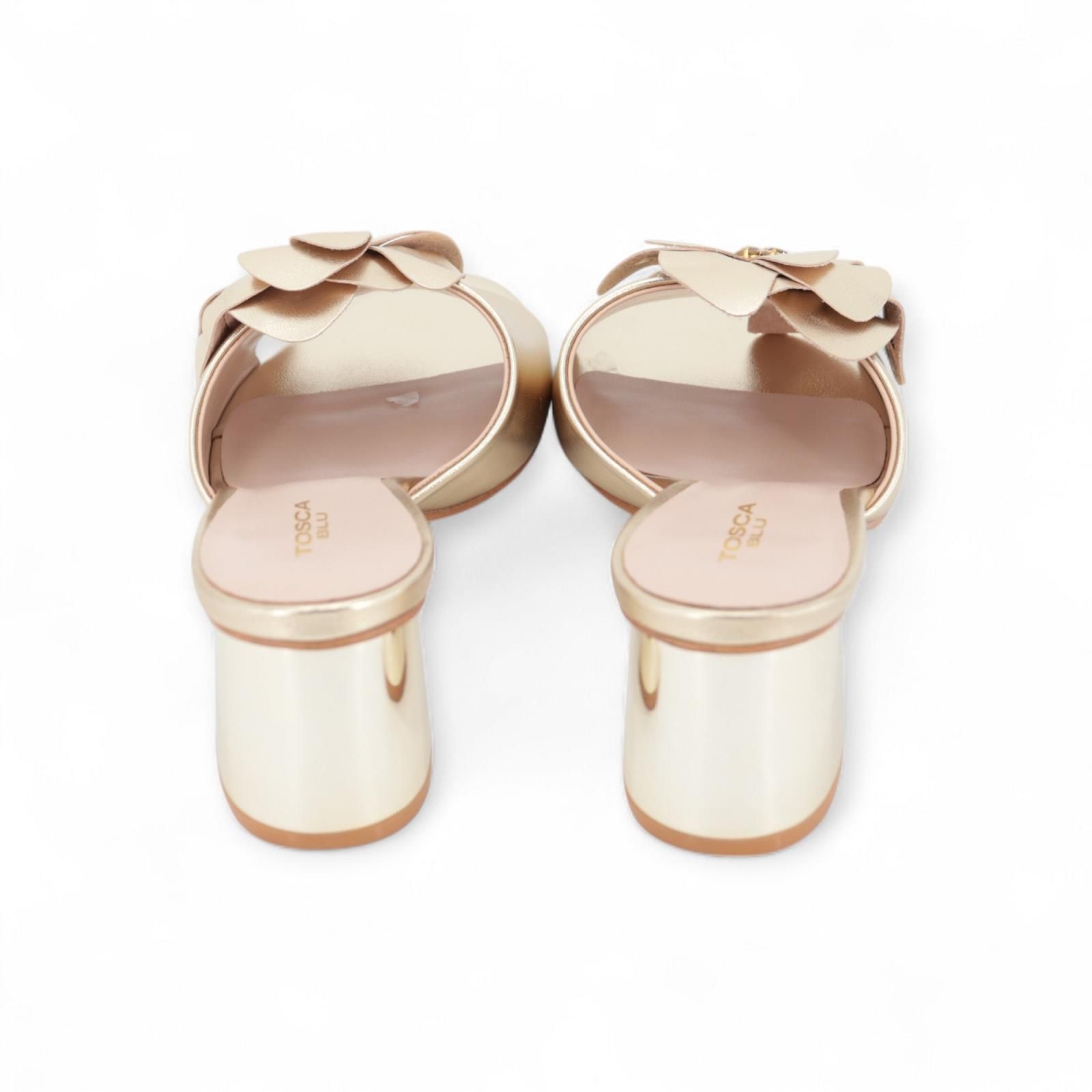 Slipper Peony van Tosca Blu in goud. Deze slipper is in shining goud leder met een mooie bloem met steentjes als detail. Is op een gouden hakje van 5 cm hoog.