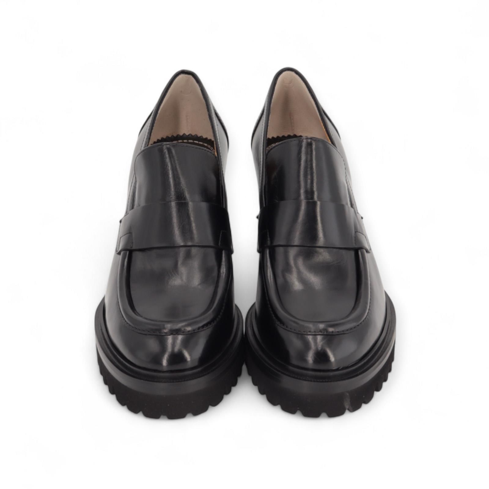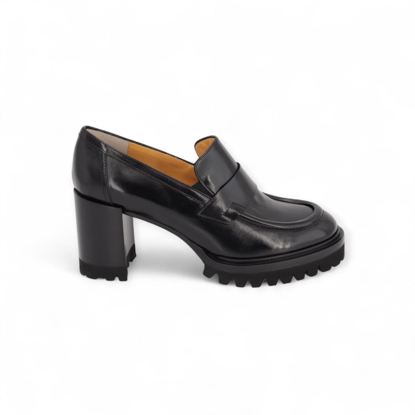 Mocassin 4271 van Truman’s voor dames. Deze mocassin is in zwart leer. Is mooi afgewerkt met een dikke stekking vooraan en een band over de wreef. Blijft mooi aan de voet door de elastieken aan de wreef. Heeft een licht verhoogde gekartelde zool en een blokhak van 7-7.5cm hoog.