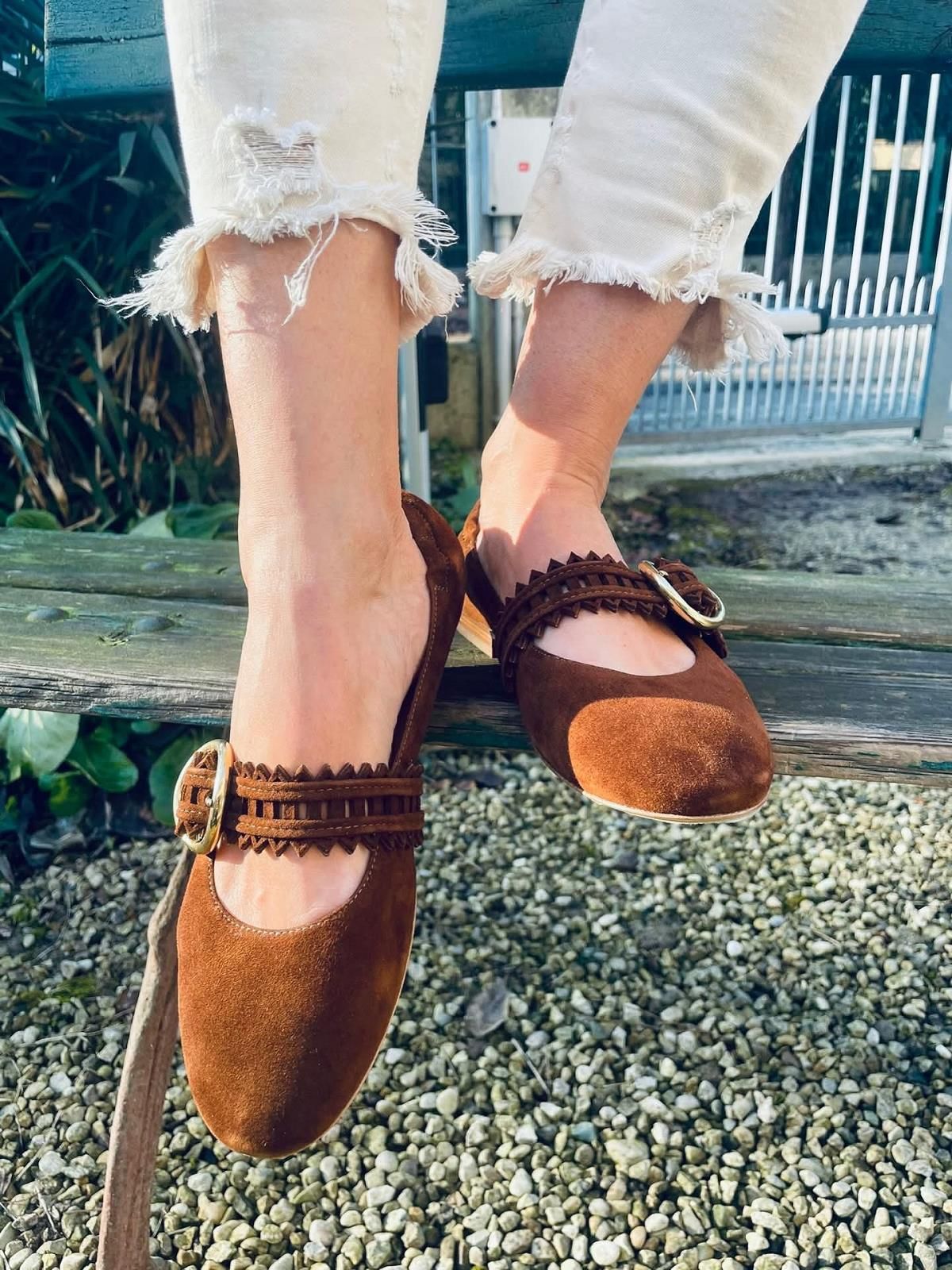 Ballerina 4354 van Truman’s voor dames. Deze elegante ballerina is in donker cognac suède. Heeft een ronde neus met een bandje over de wreef die de blikvanger is van deze ballerina; Is mooi geperforeerd en gekarteld afgewerkt met een gouden ronde gespsluiting. De hielflap is achteraan klein beetje elastisch zodat het model mooi aan de voet blijft.