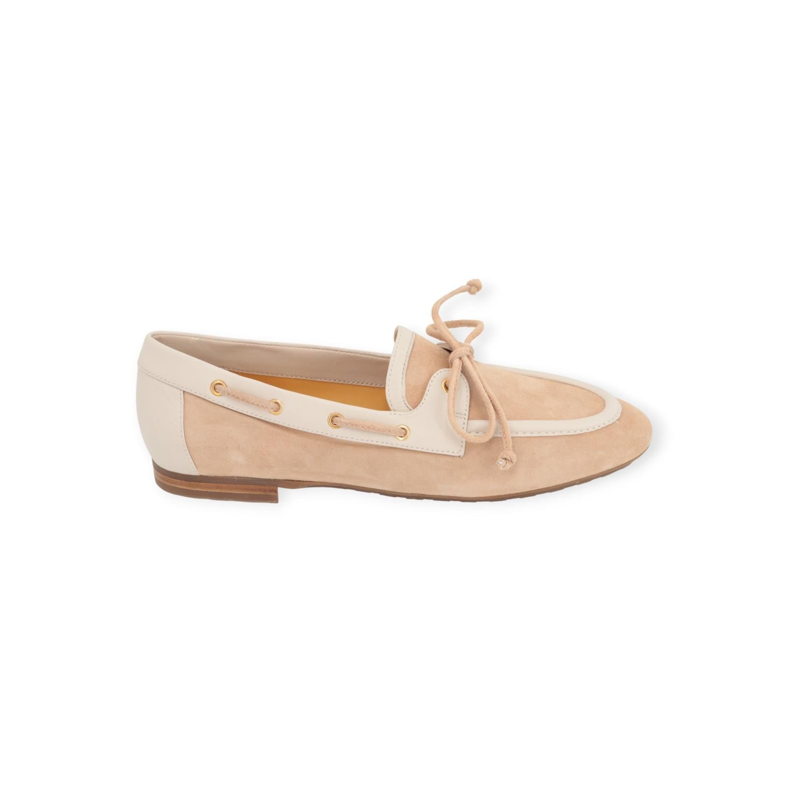 Mocassin 4355 van Truman’s voor dames. Deze elegante mocassin is in beige suède met off wit leer. Is afgewerkt met veters en gouden oogjes vooraan en langs de zijkant. Dit model typeert aan dé trend voor deze zomer. Is op een elegant bruin antislipzooltje.