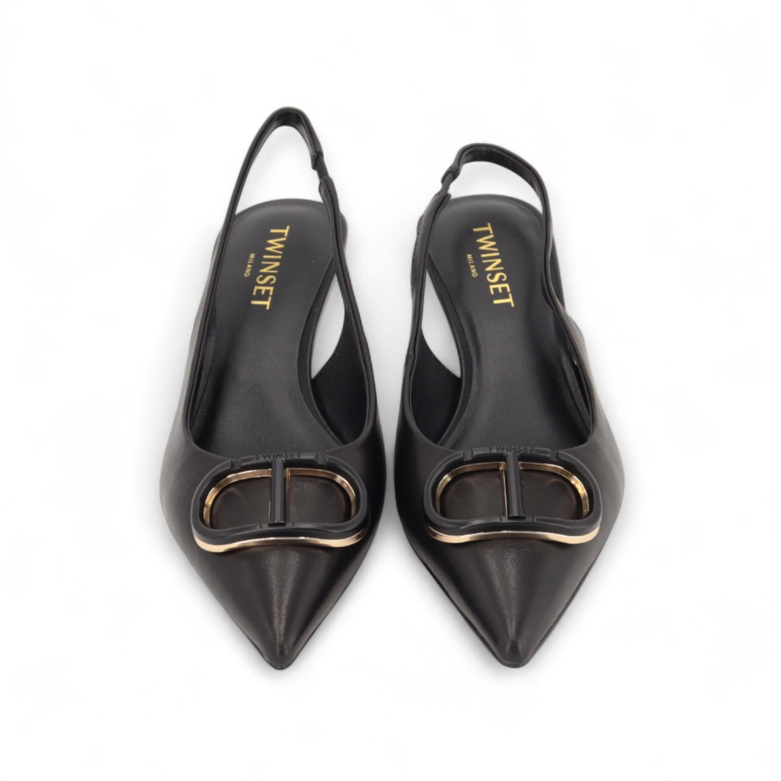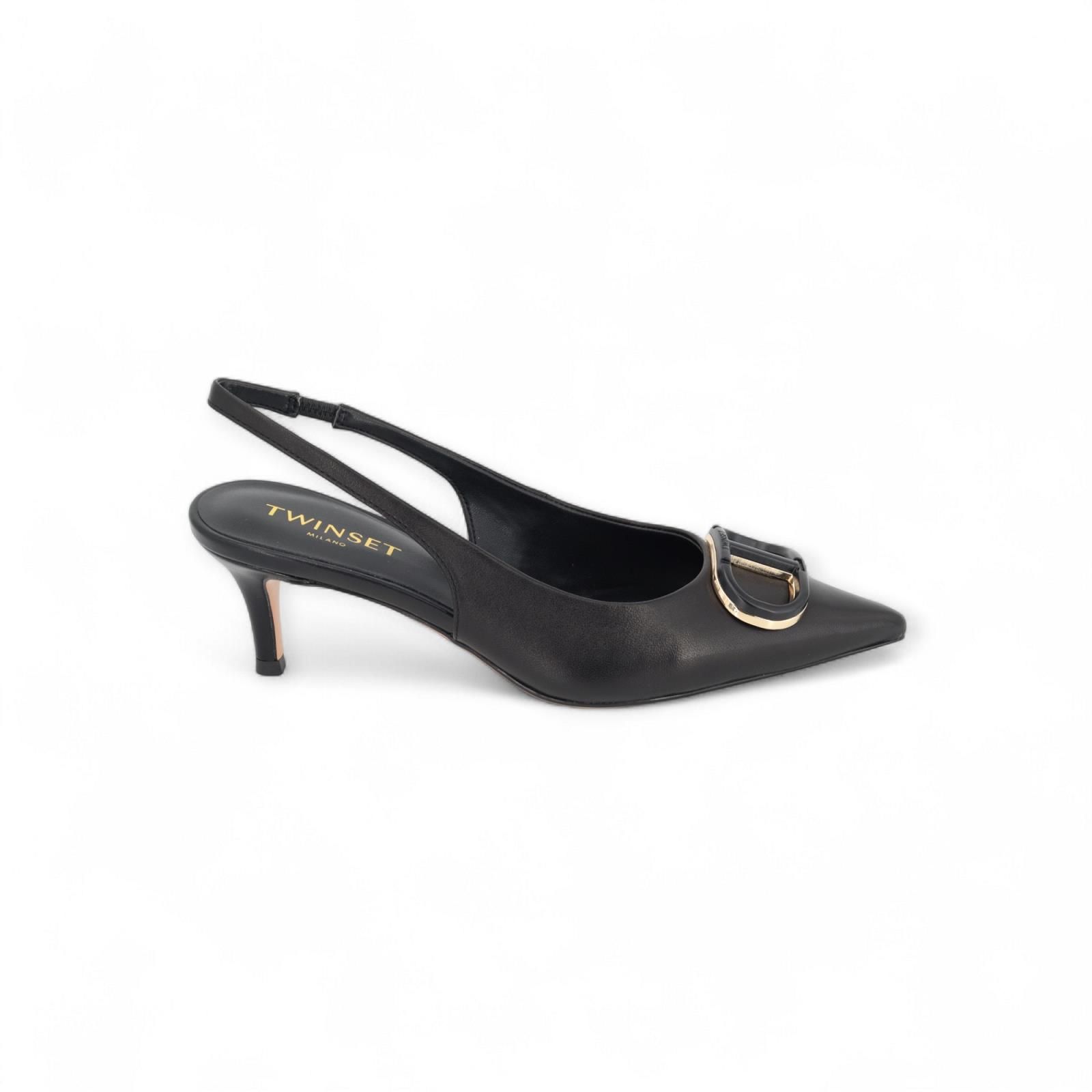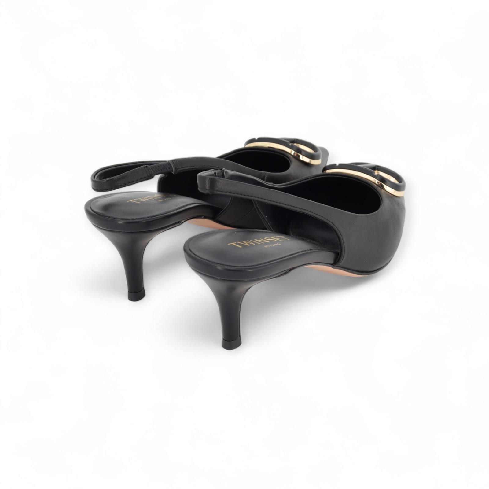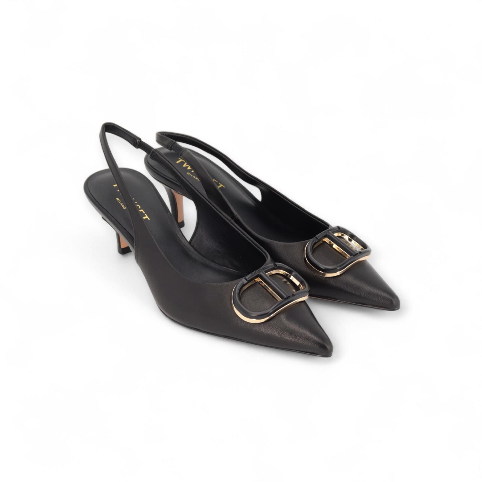 Pump van Twinset voor dames. Dit slingback model is in zwart leer. Heeft een scherpe neus en een open hiel. Is mooi afgewerkt met het iconisch ovalen T logo in goud accent vooraan. Is op een fijn hakje van 5-5.5cm hoog en is met een elastiekje zodat het model mooi aan de voet blijft.