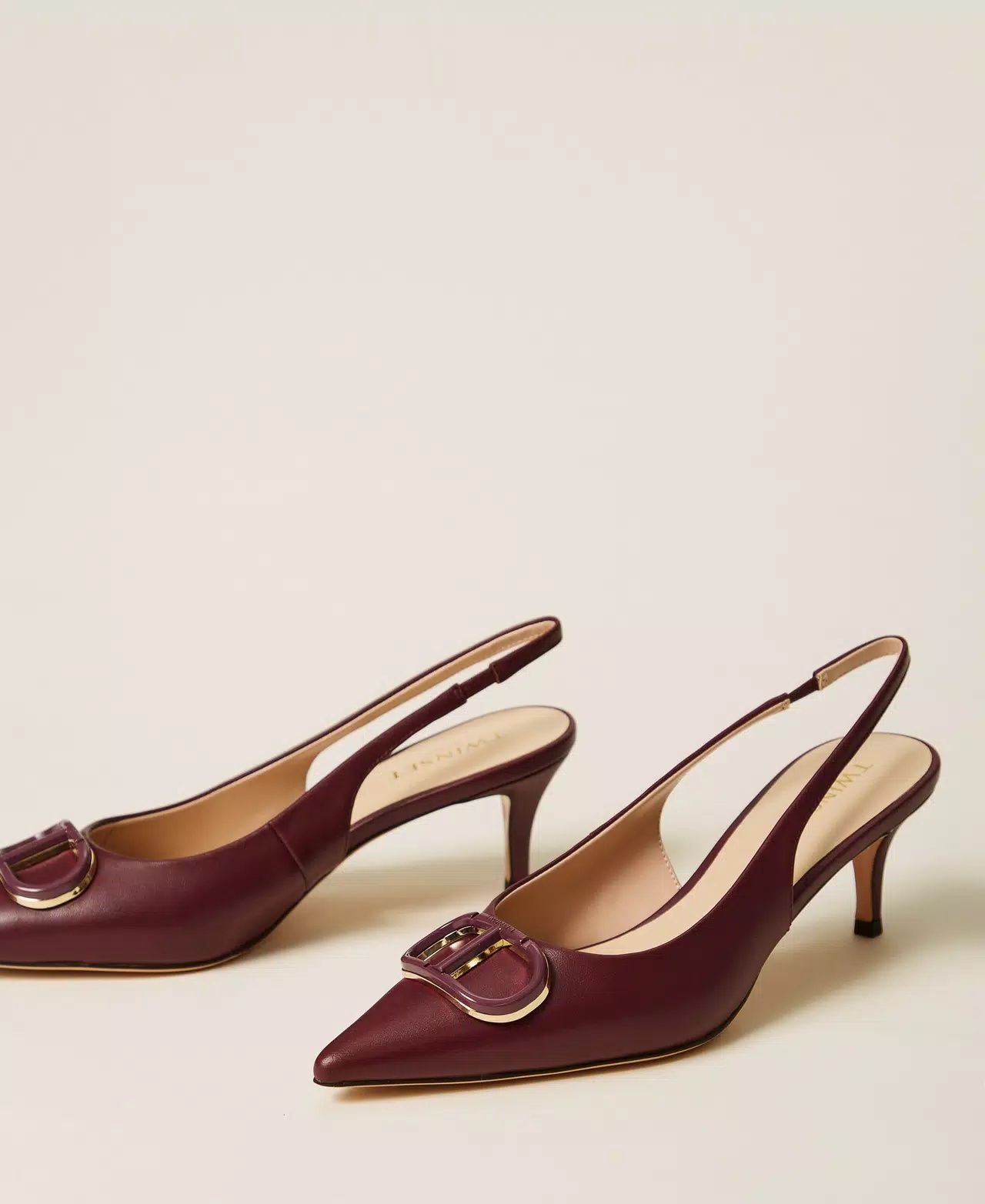 Pump van Twinset voor dames. Dit slingback model is in bordeaux leer. Heeft een scherpe neus en een open hiel. Is mooi afgewerkt met het iconisch ovalen T logo in goud accent vooraan. Is op een fijn hakje van 5-5.5cm hoog en is met een elastiekje zodat het model mooi aan de voet blijft.