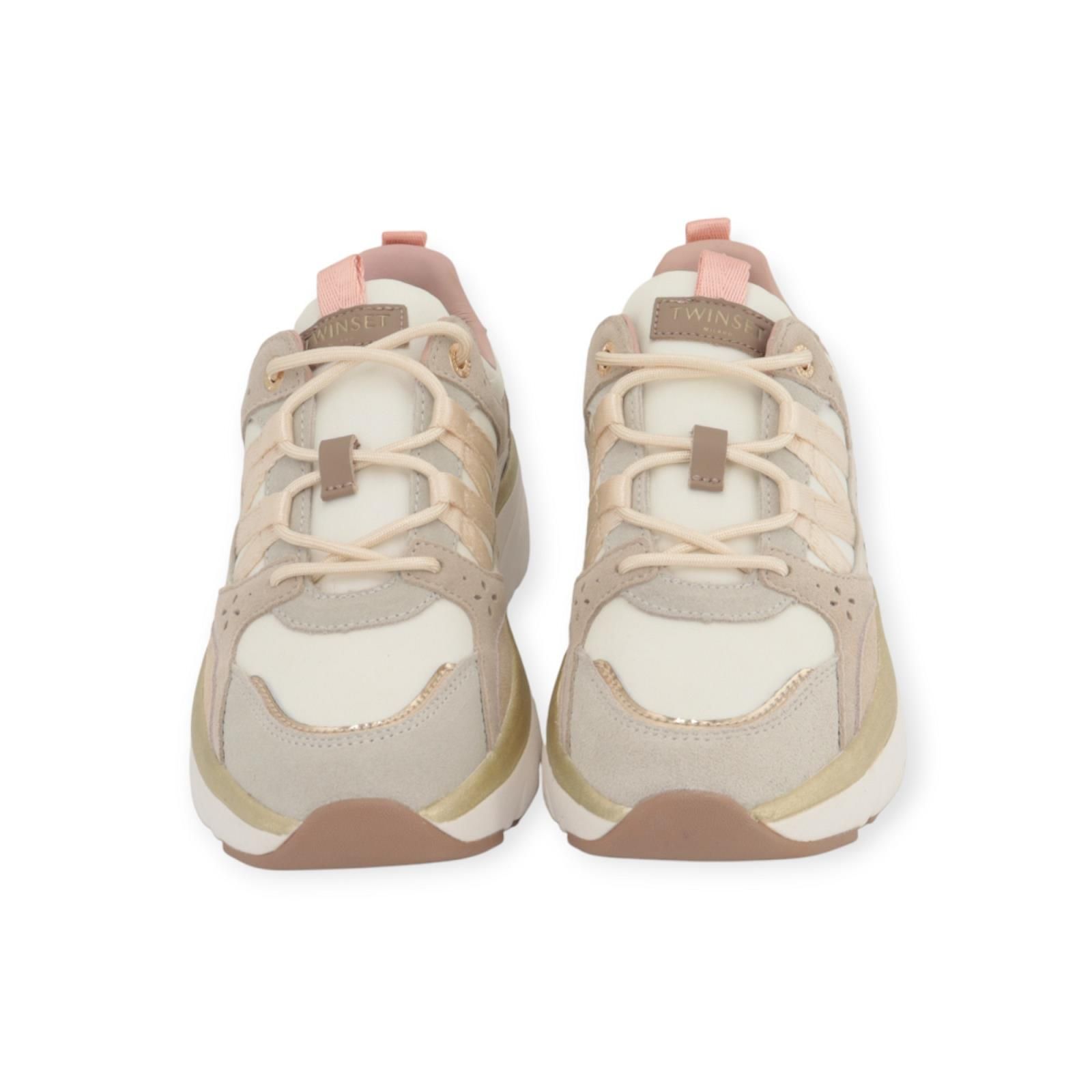 Sneaker van Twinset voor dames. Deze runner is in off wit nylon met verschillende materialen en texturen beige en roze tinten. Heeft een dikke zool omrand met goud kleur,twinse de binnenzool is uitneembaar.