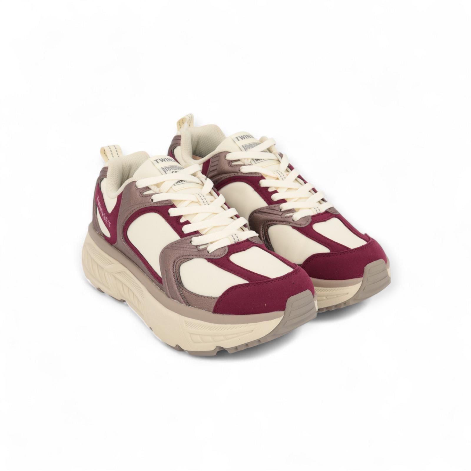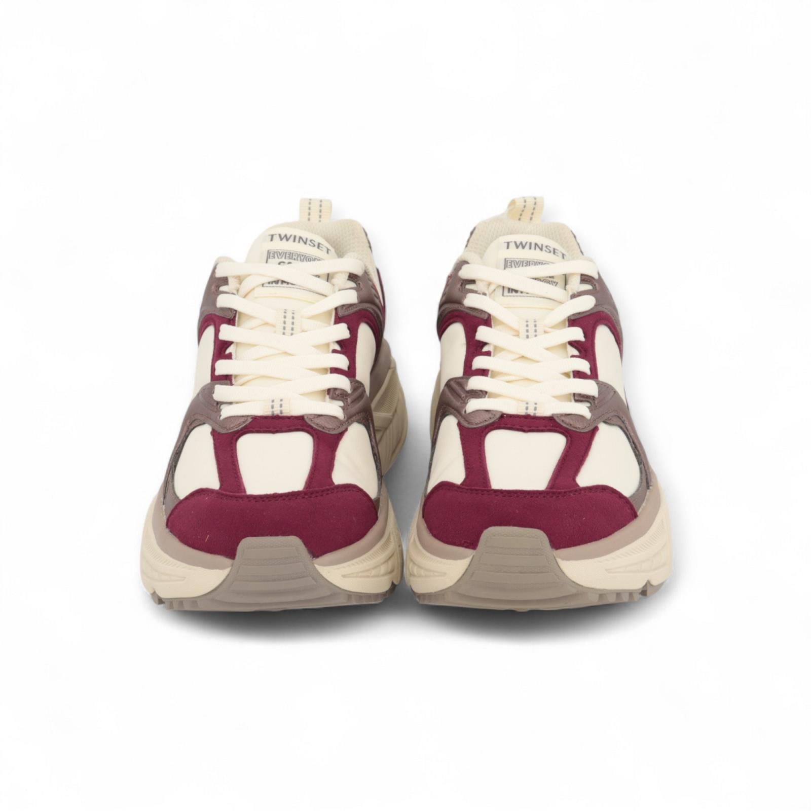 Sneaker van Twinset voor dames. Dit runnermodel is in off wit nylon met suède bordeaux en gelamineerde inzetstukken in brons . Het logo staat aan de zijkant. Heeft een dikke rubberen zool met een uitneembare binnenzool.