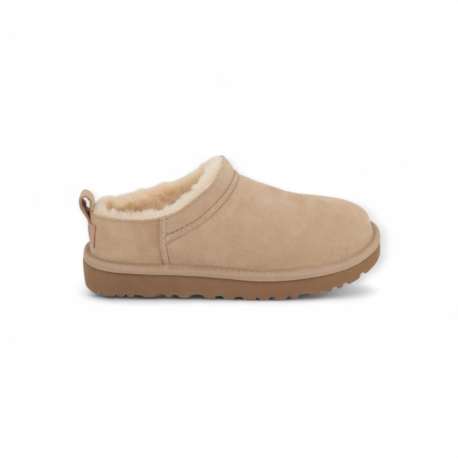 Classic Micro van UGG voor dames in zand. Is een nieuwe interpretatie van onze populaire Classic-laars met een met laag profiel (en hoogwaardig comfort). Het bovenstuk is gemaakt in chestnut suède en gevoerd met superzachte sheepskin die op natuurlijke wijze de temperatuur reguleert, zodat je ze met of zonder sokken kunt dragen binnen als buiten.