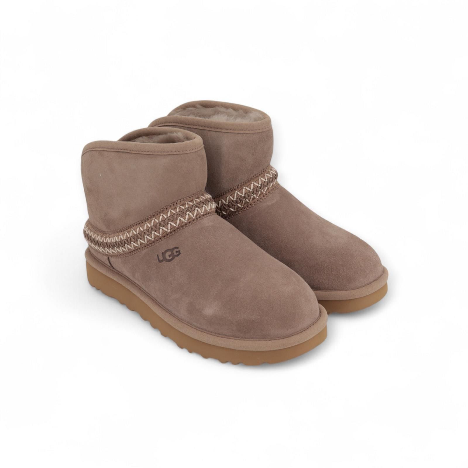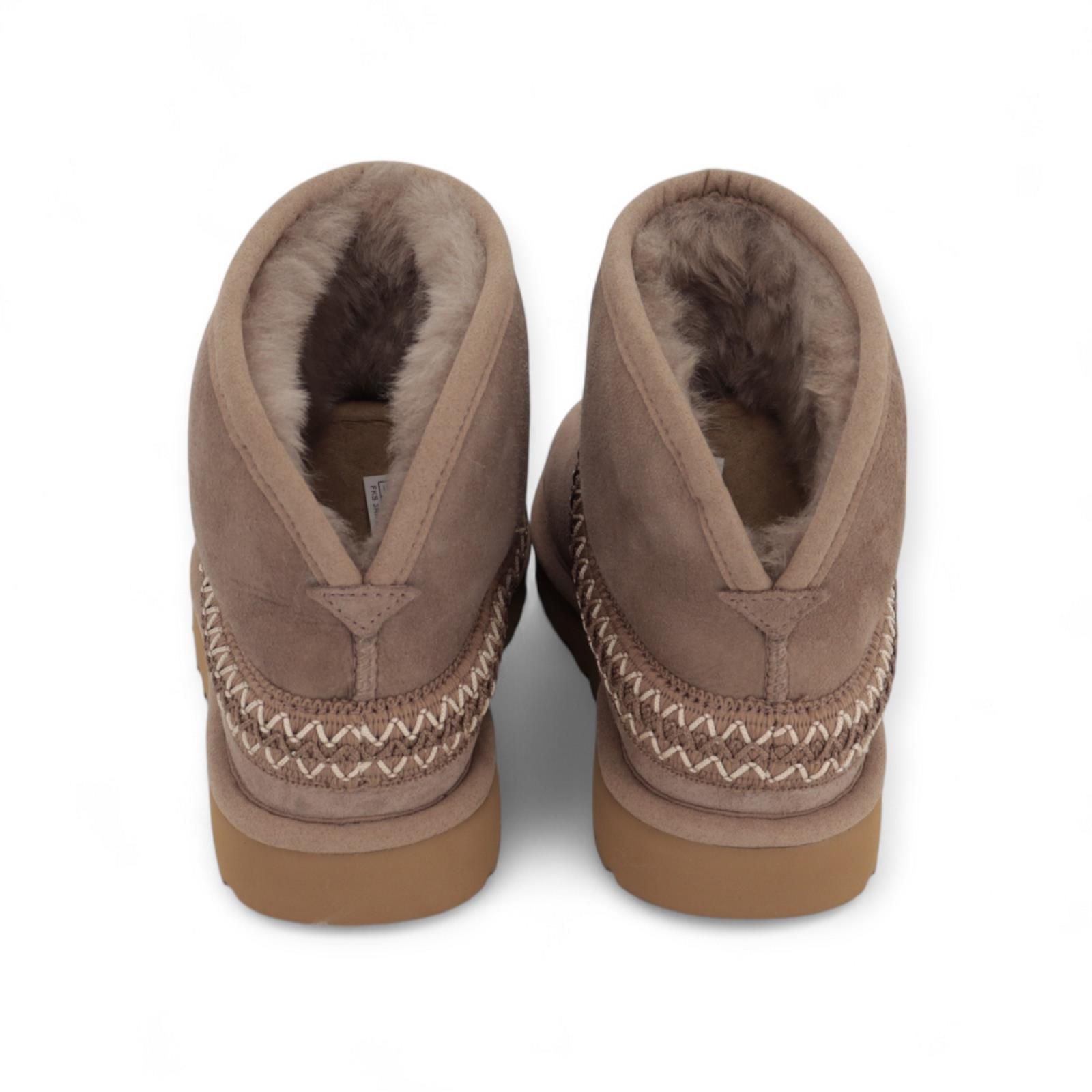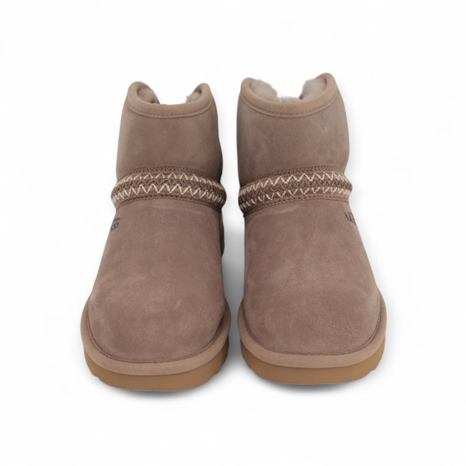 Mini Crescent van UGG voor dames in taupe. De Classic Mini Crescent-laars is in “chestnut” suède. Heeft een gebogen schacht die kan worden omgevouwen om de UGGplush-voering te laten zien, terwijl het UGGbraid-detail op de buitenkant pronkt. De Classic Mini Crescent is comfortabel en behaaglijk, terwijl hij door de classic buitenzool van suikerriet uiterst licht is.