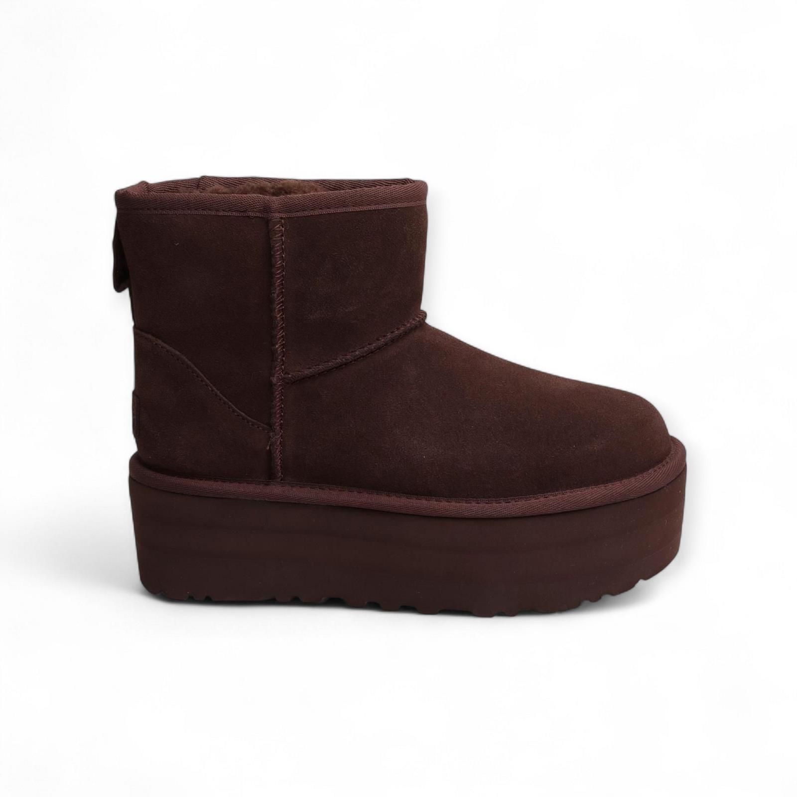 Enkellaars Classic Mini Platform van UGG voor dames. Deze populaire Ugg boots zijn in bruin suède met een coole plateauzool. Is aan de binnenkant gevoerd met wol en de buitenzool is in antislip en een goeie grip met demping.