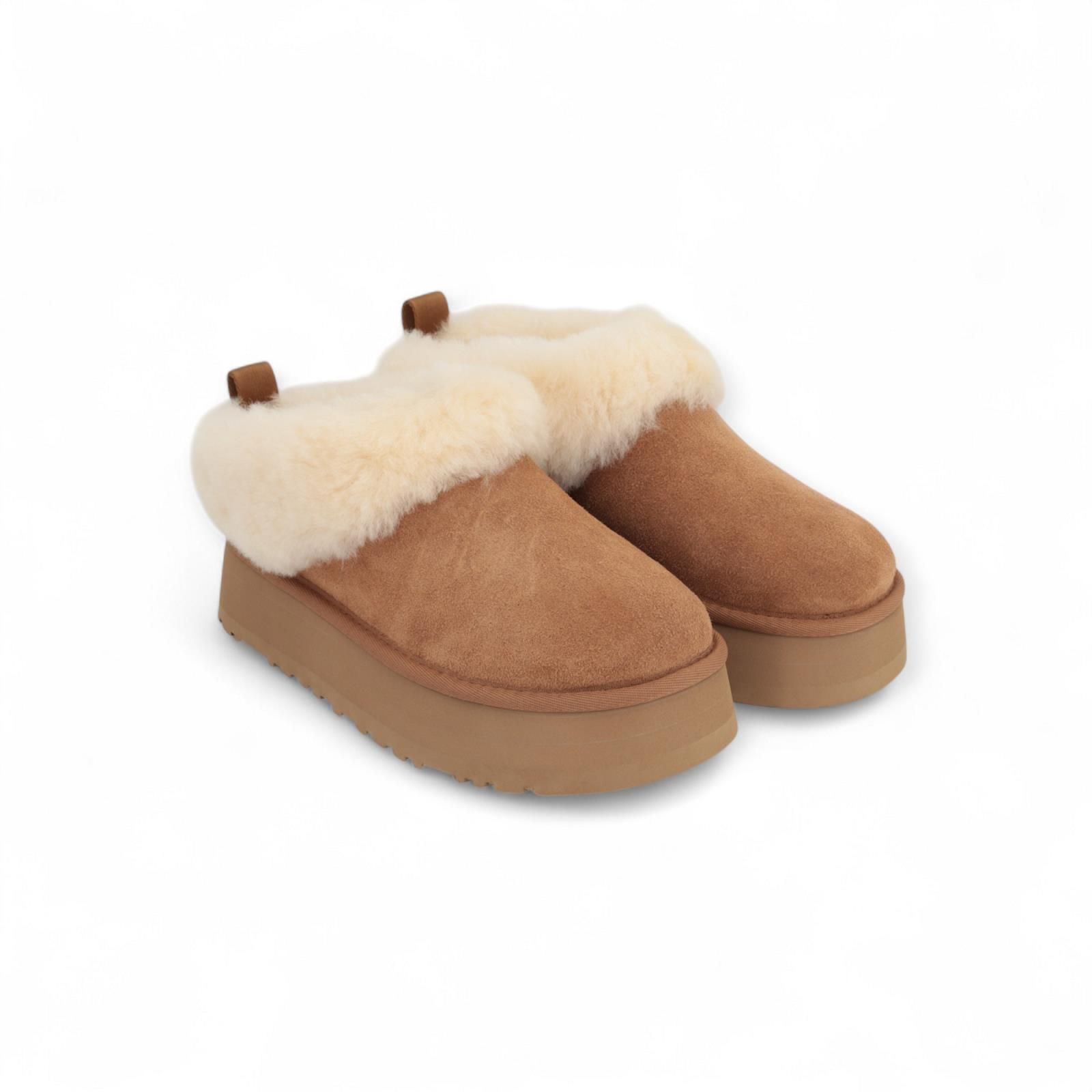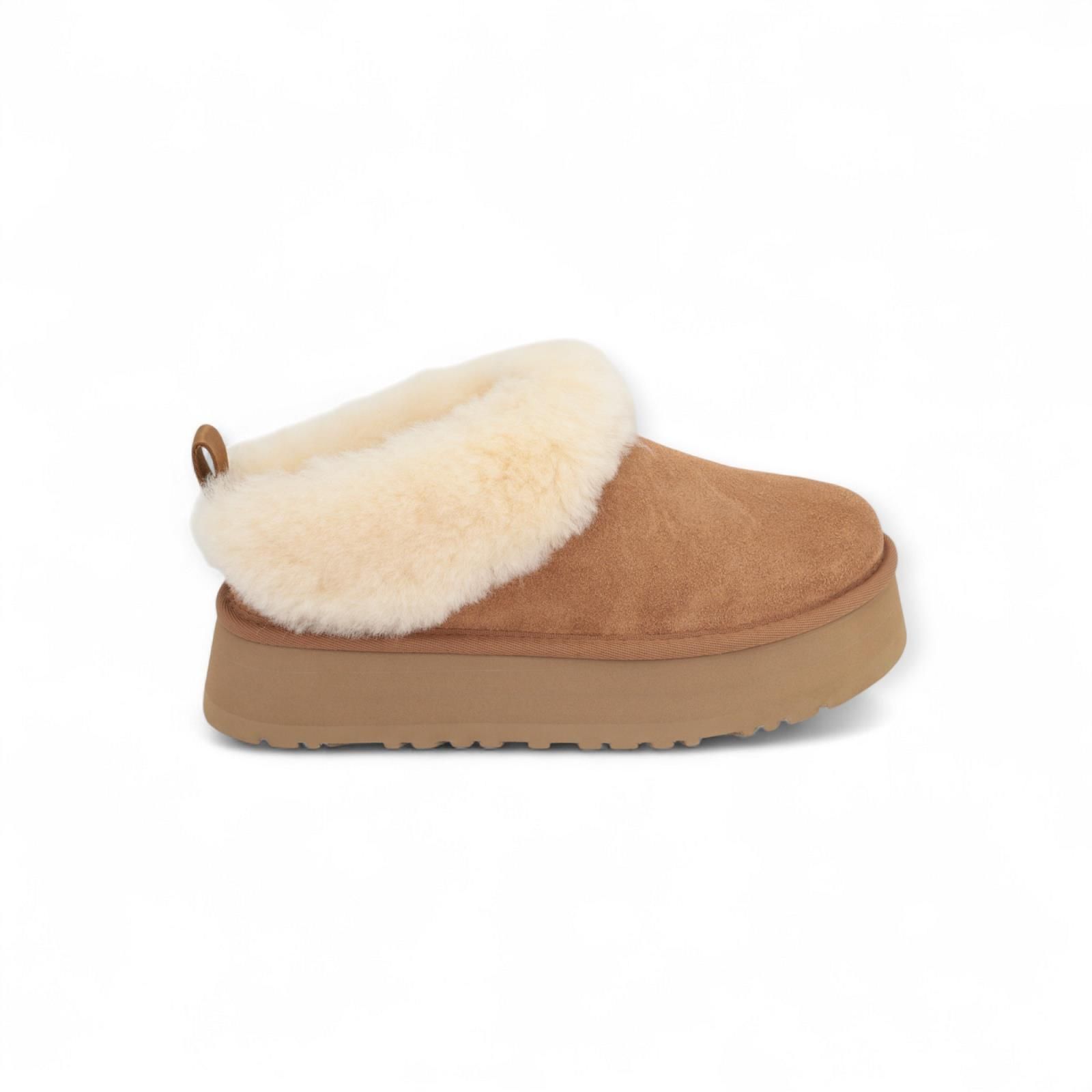 Pantoffel Tazzelle van Ugg voor dames. Deze nieuwe pantoffel van UGG is de Tazz versie met nog meer UGG wol comfort. Deze ultrazachte pantoffels voor binnen en buiten zijn gemaakt in cognac ‘chestnut’ suède en hebben een lichtgewicht plateauzool van 4,4 cm, De binnenkant is bekleed met wol, dat doorloopt tot aan de prachtige, vaste omslagboord, zodat je deze pantoffels met of zonder sokken kunt dragen.