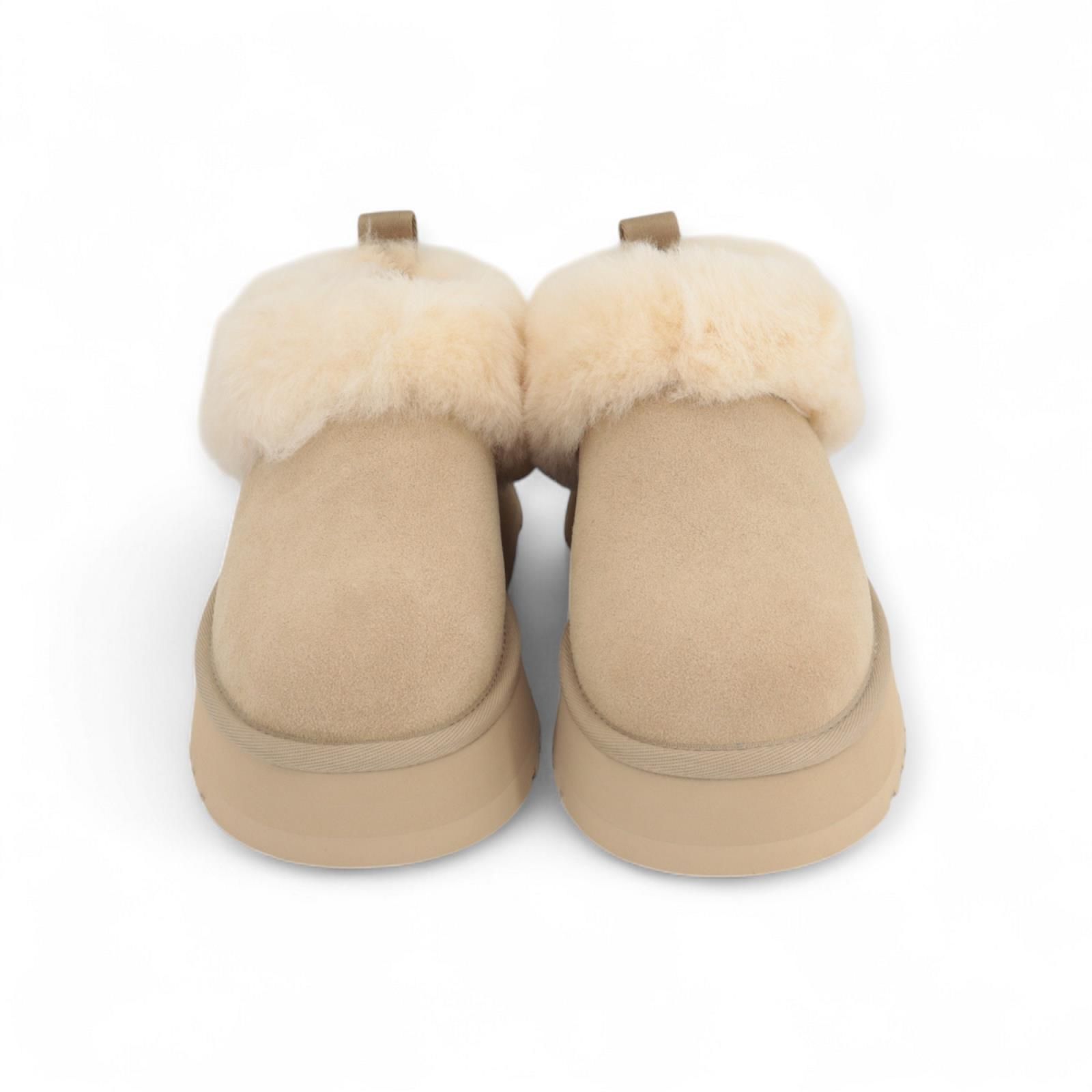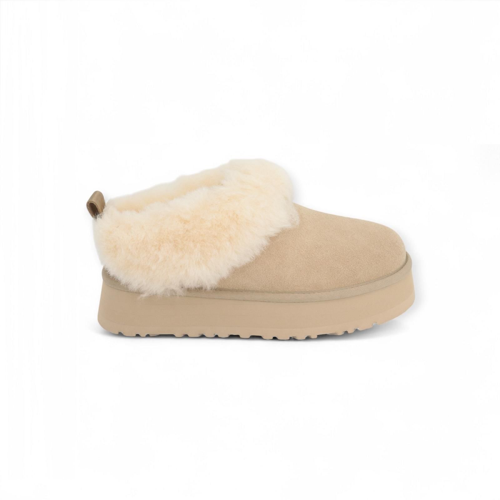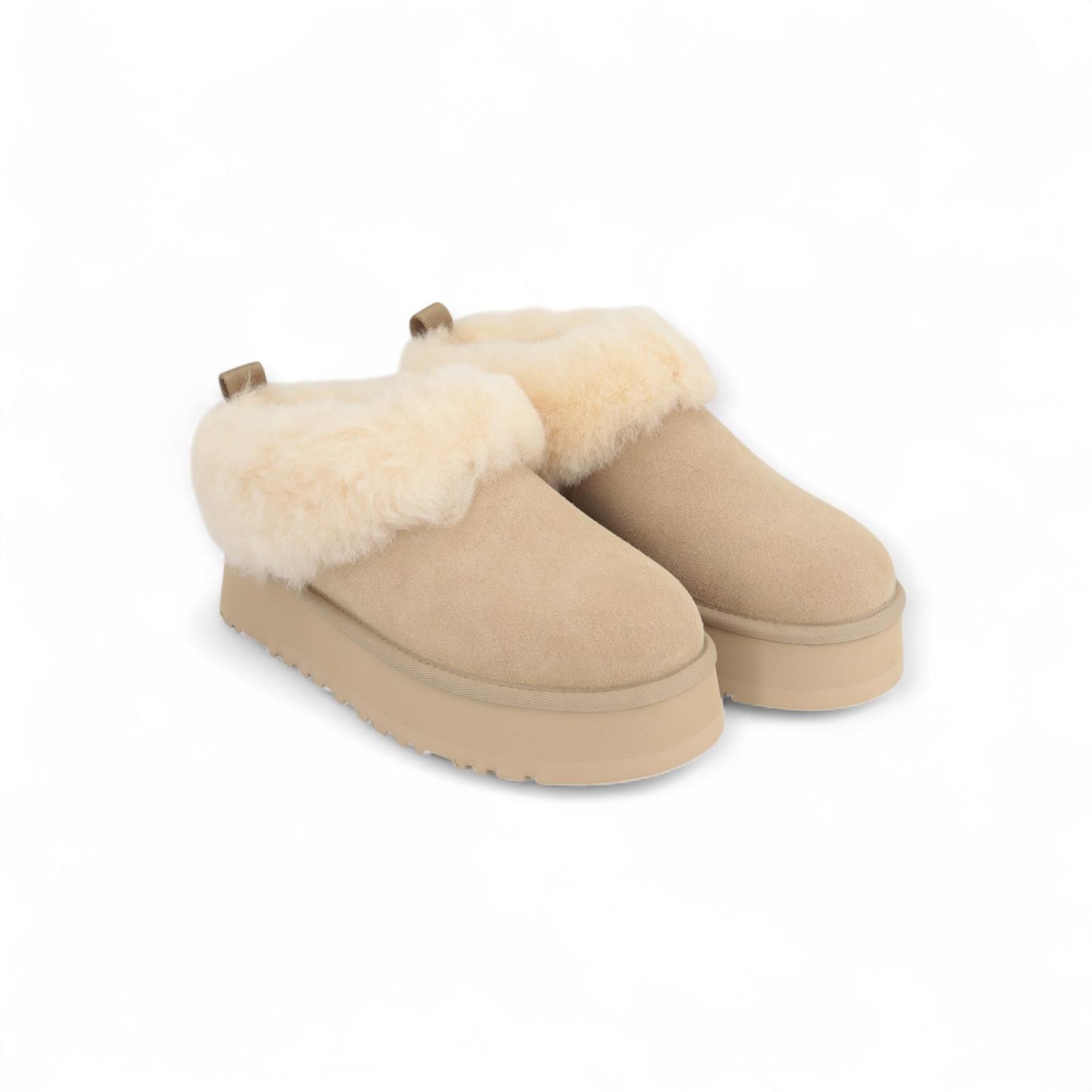 Pantoffel Tazzelle van Ugg voor dames. Deze nieuwe pantoffel van UGG is de Tazz versie met nog meer UGG wol comfort. Deze ultrazachte pantoffels voor binnen en buiten zijn gemaakt in zand suède en hebben een lichtgewicht plateauzool van 4,4 cm, De binnenkant is bekleed met wol, dat doorloopt tot aan de prachtige, vaste omslagboord, zodat je deze pantoffels met of zonder sokken kunt dragen.