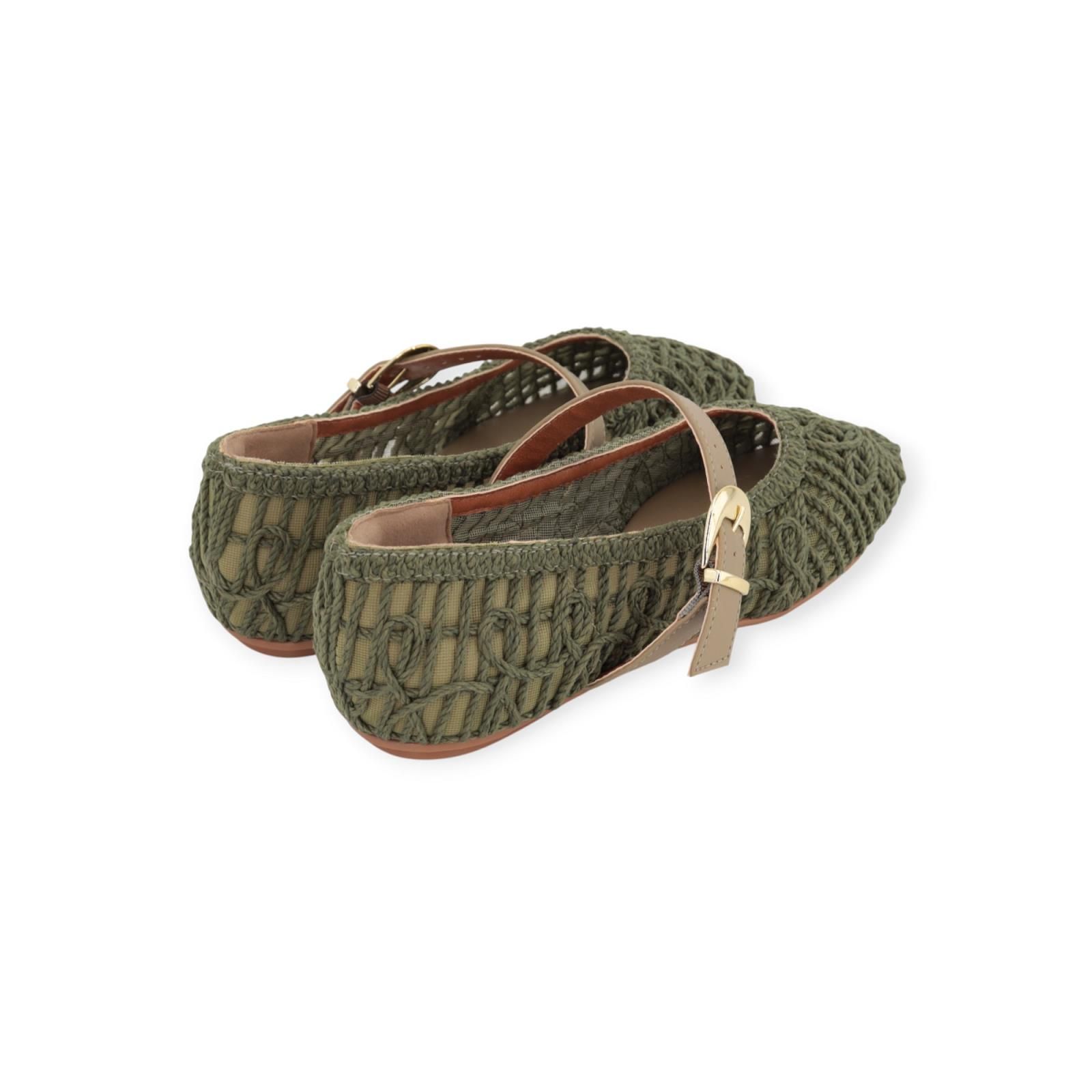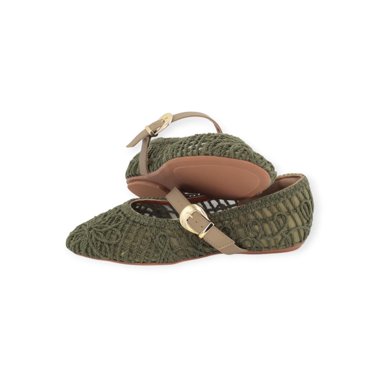 Ballerina van Valentina voor dames. Deze elegante ballerina is in groen geweven / tressée raffia met gaas. Heeft een groen leren bandje over de wreef met gouden gespsluiting met een ronde neus. Heeft een antislip buitenzooltje.