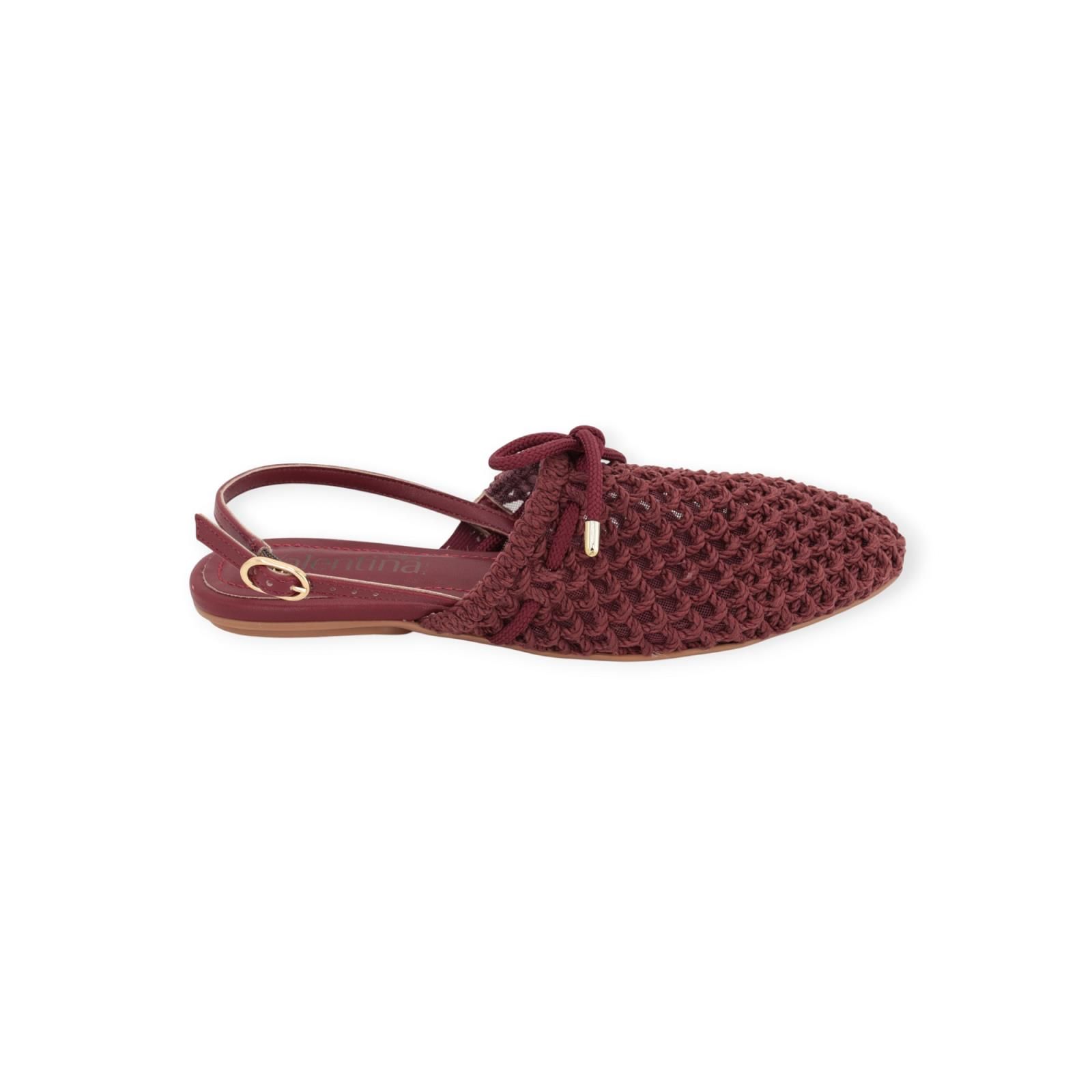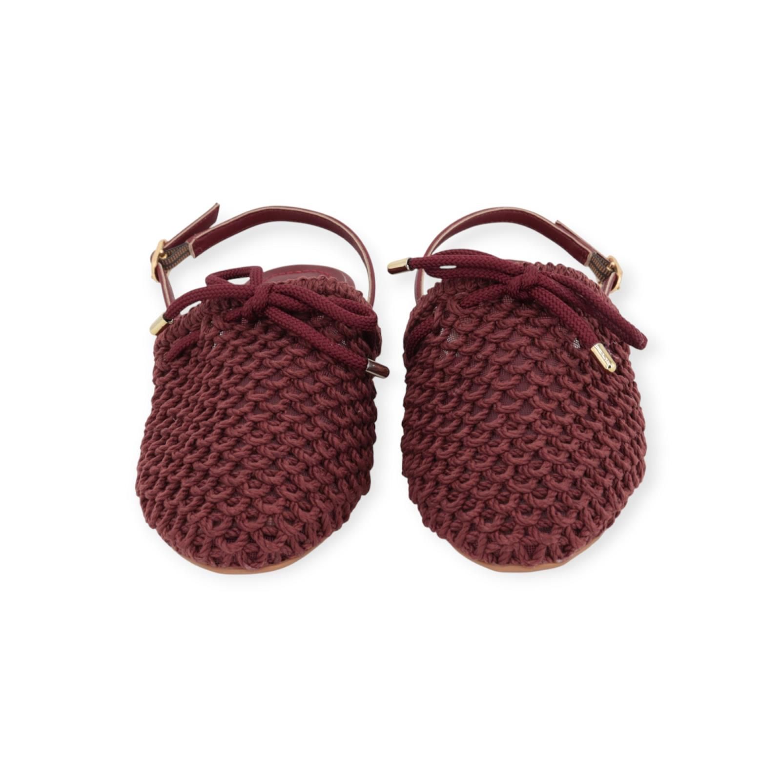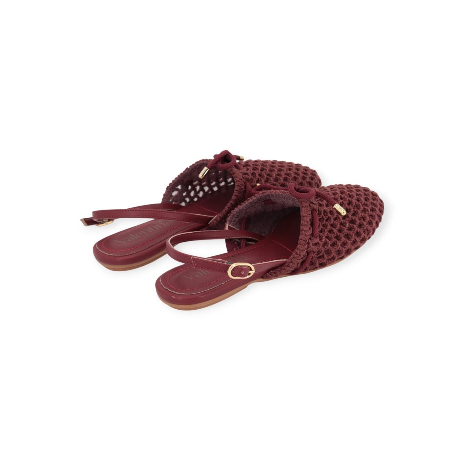 Ballerina van Valentina voor dames. Deze elegante ballerina is in bordeaux geweven / tressée raffia met gaas. Heeft een bordeaux leren bandje over de wreef met gouden gespsluiting. Heeft een open hieltje met een gesloten voorkant; die mooi is afgewerkt met een veter waarmee je het model wat kan toestroppen. Heeft een antislip buitenzooltje.
