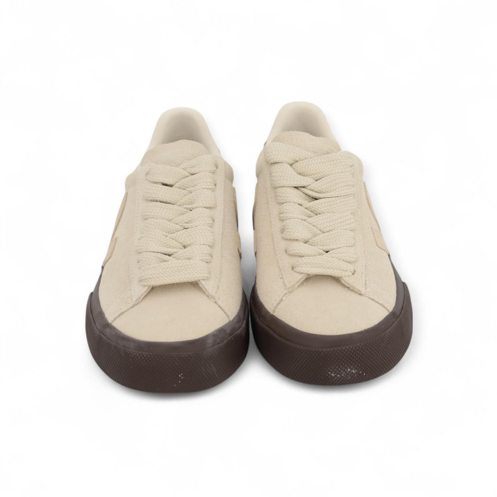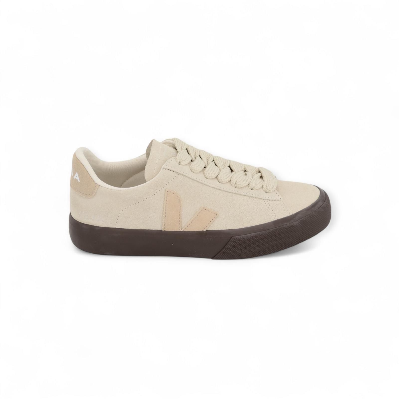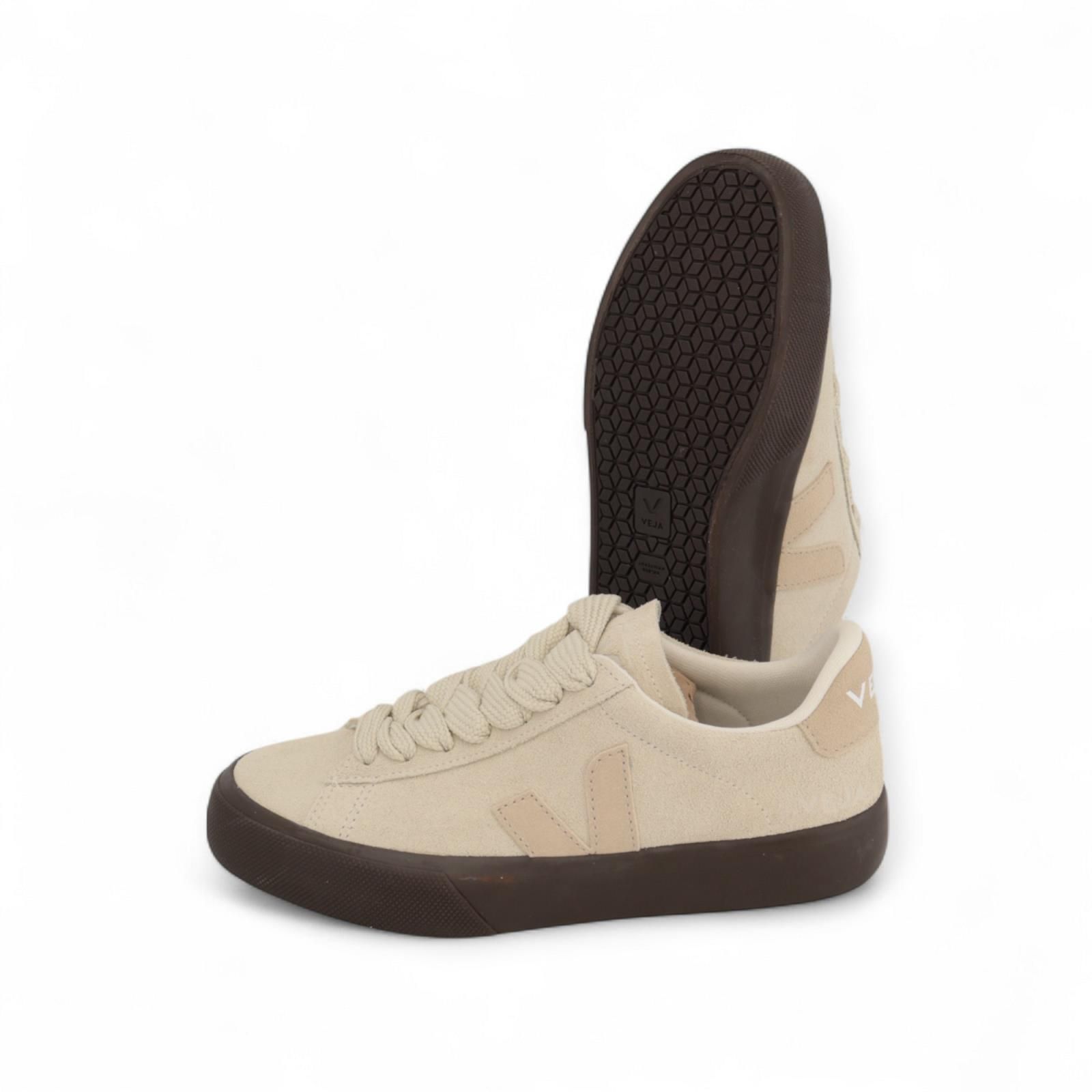 Sneaker CAMPO van Veja voor dames. Deze toffe sneaker is in zand suède met een donker bruine zool die voor nog meer cachet zorgt. Afgewerkt met een iets donkere hielflap VEJA en de bekende V aan de zijkanten. Is zeer soepel en de binnenzool is uitneembaar.