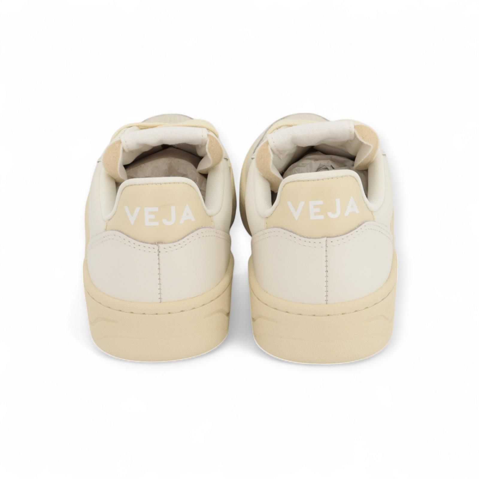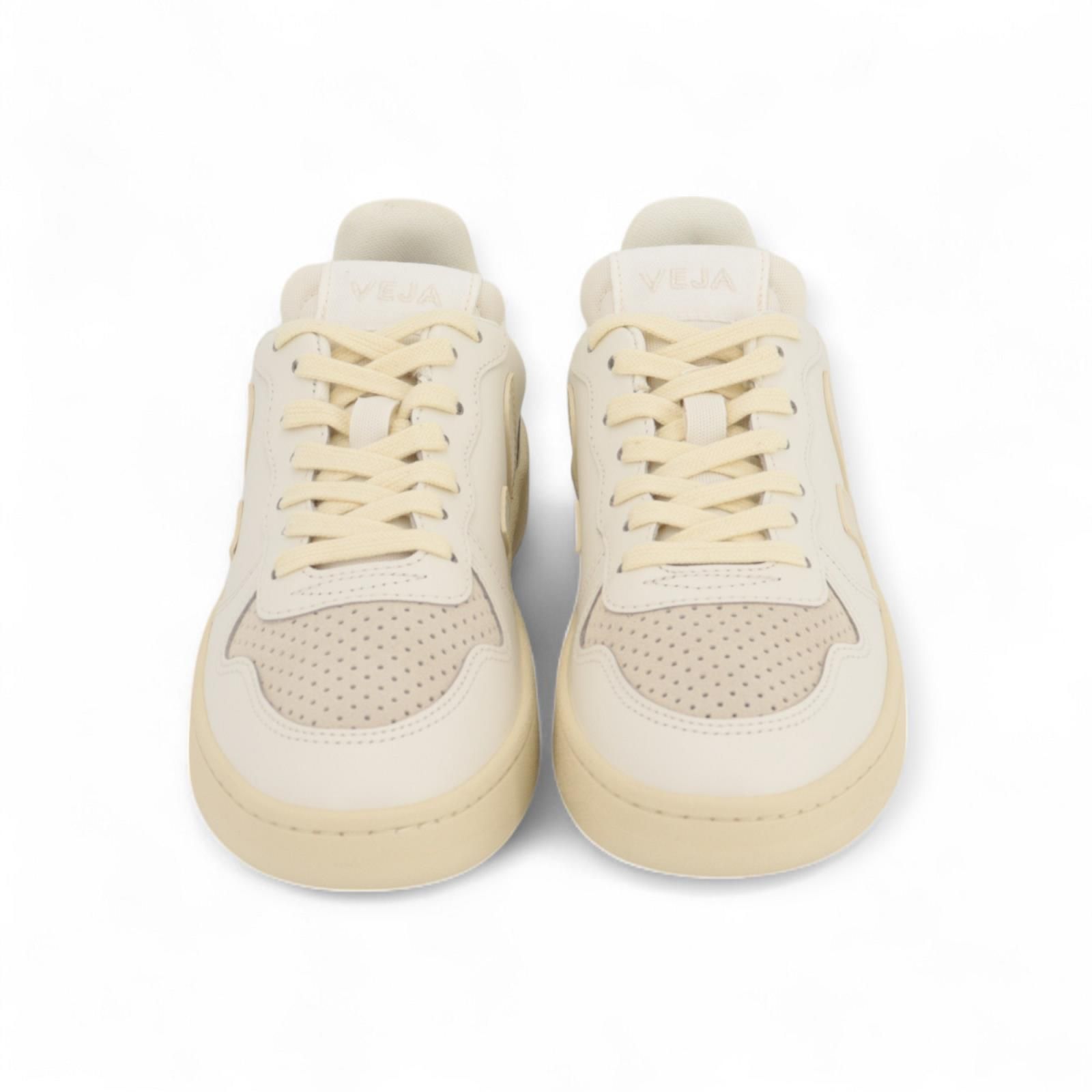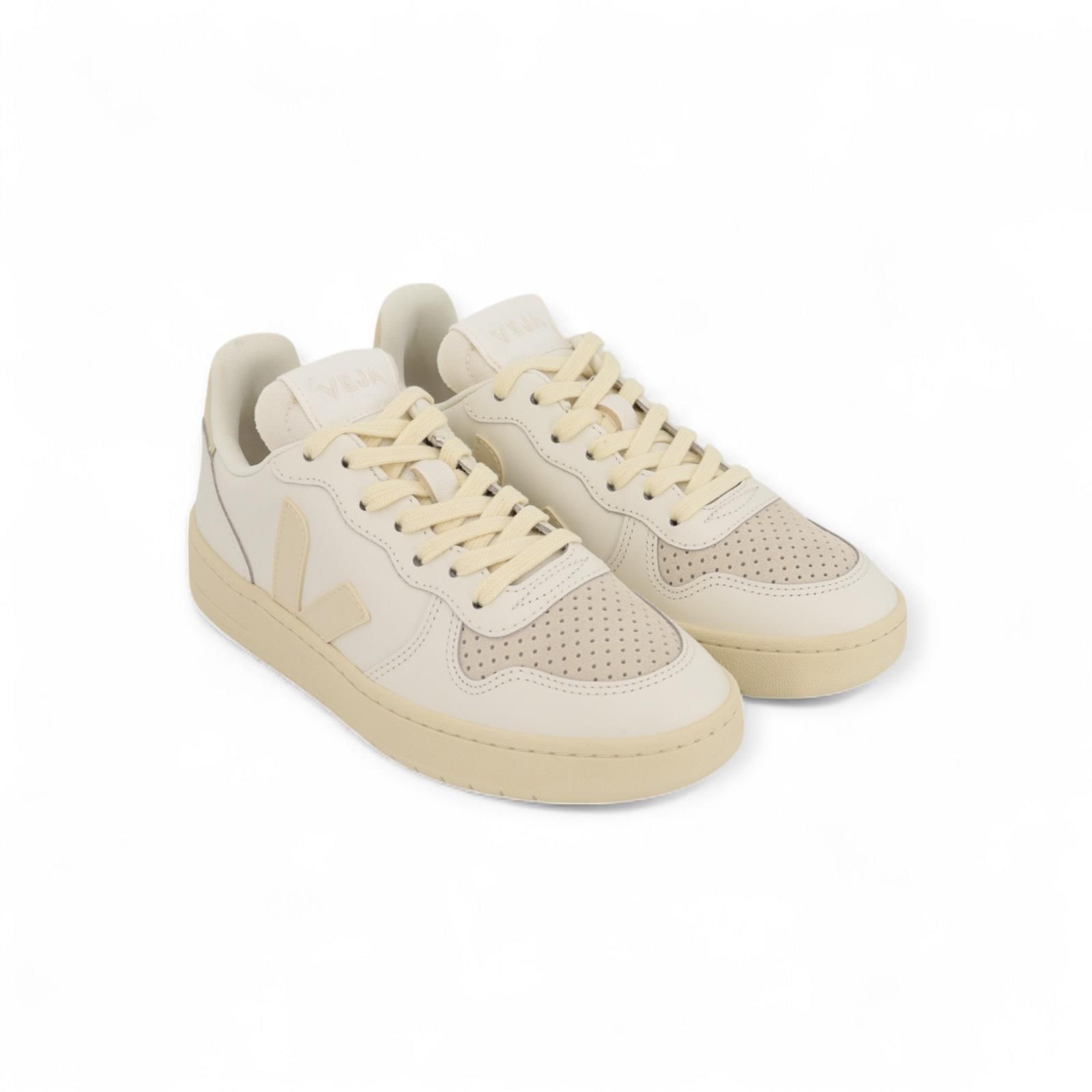 Veja V-10 in wit voor dames is de nummer 1 onder alle Veja modellen wereldwijd. De sneaker is in wit leer met een beige hiellip en de V aan de zijkanten. De bovenkant is in beige geperforeerd suède. De voering in de schoen is van biologisch katoen en gerecycled polyster. De binnenzool van deze schoen is uitneembaar en de buitenzool is gemaakt van wild rubber.