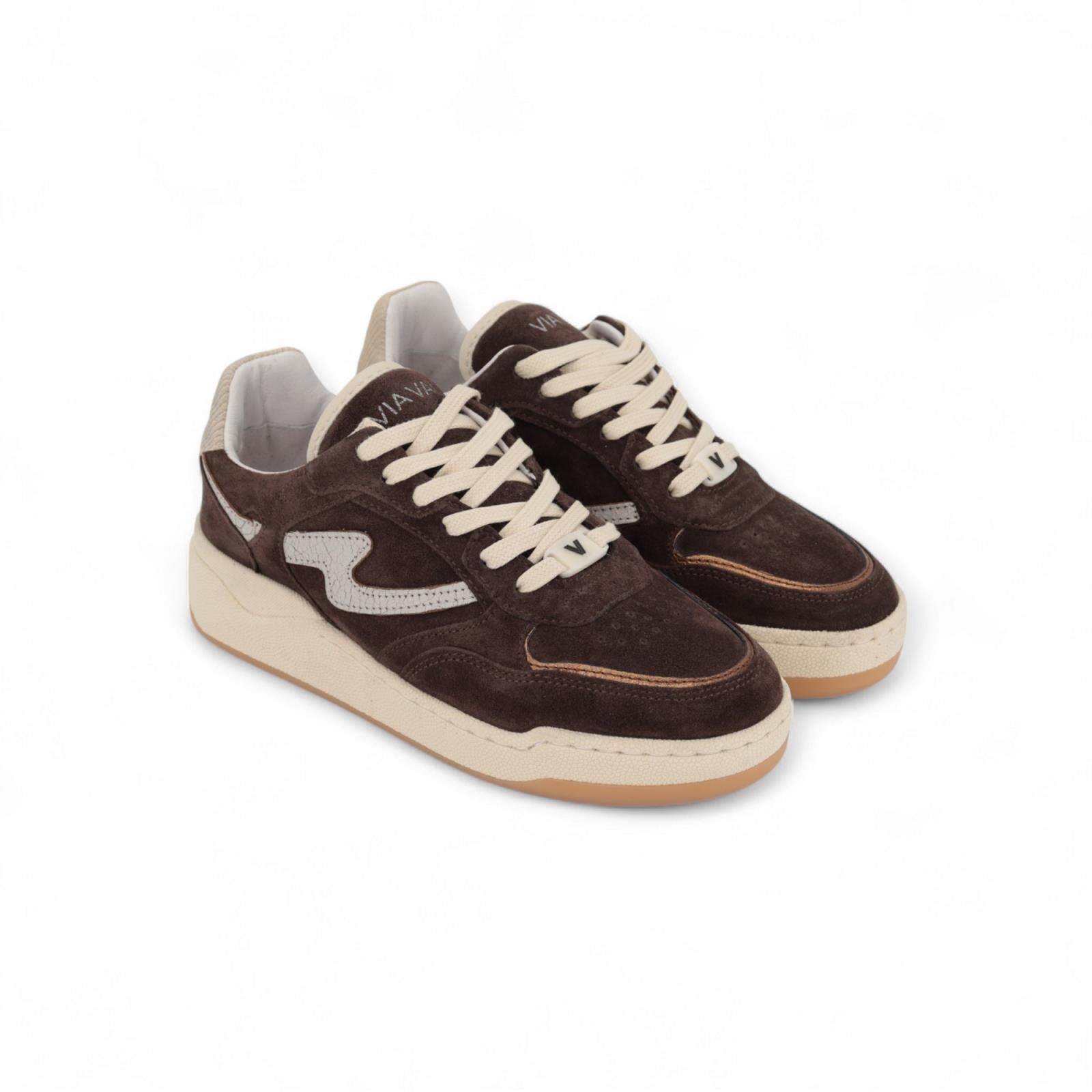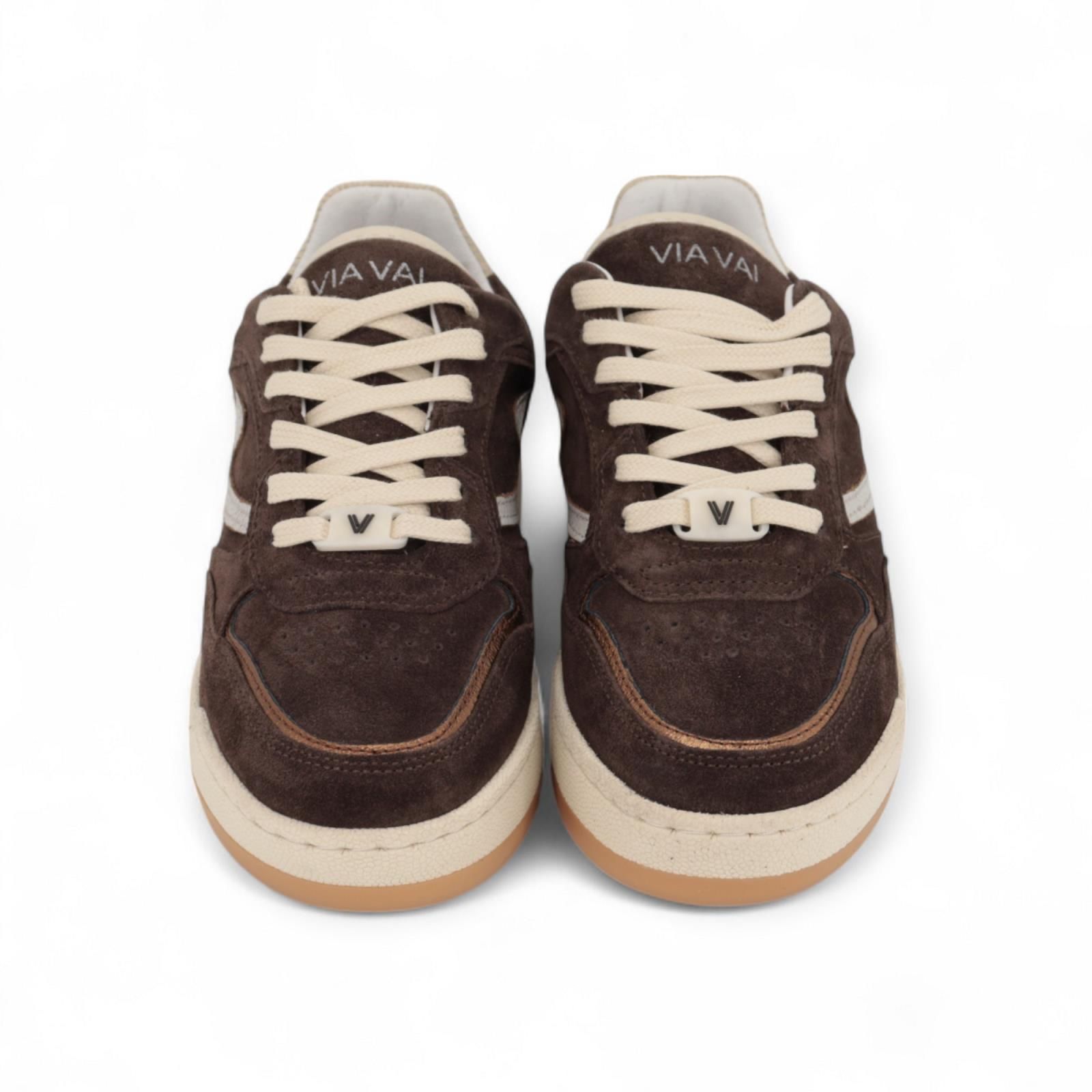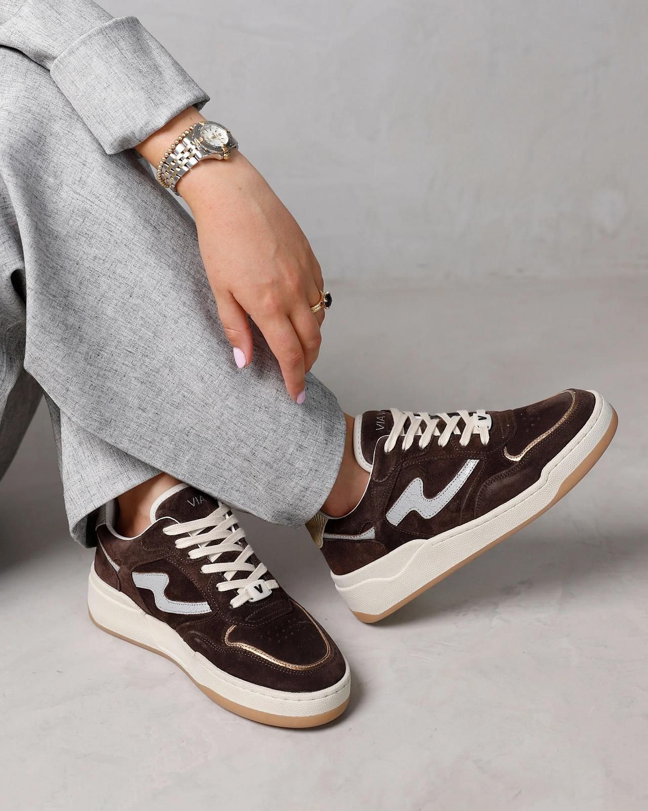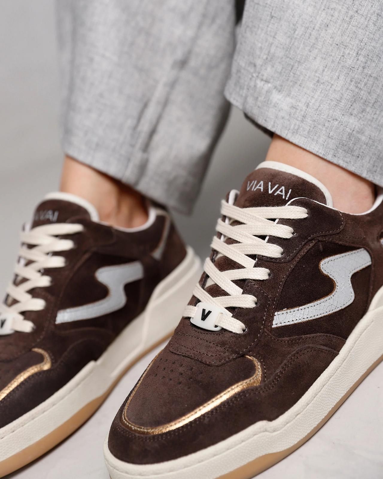 Sneaker Sam Levi van Via Vai voor dames. Deze taupe/ bruine sneaker met een gouden randje. De combinatie van verschillende kleuren en materialen geeft Sam Levi een zacht randje met een vrouwelijke touch. De binnenzool is uitneembaar.