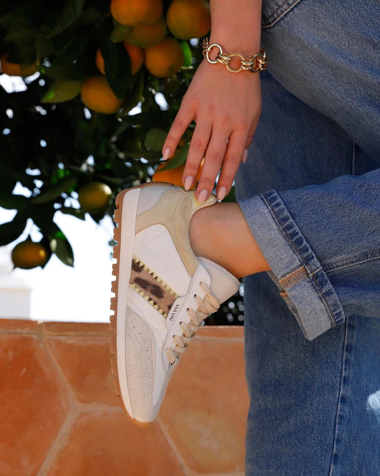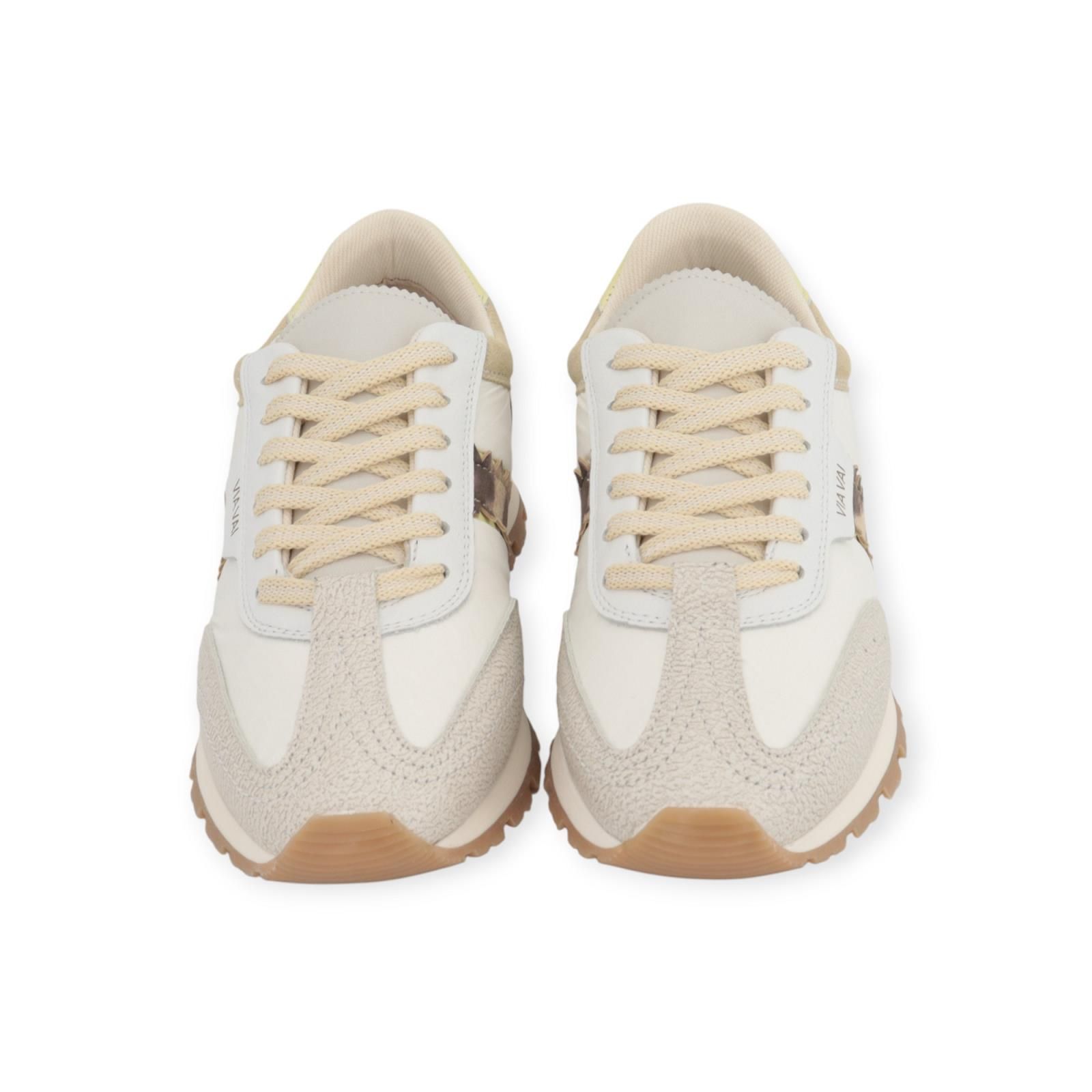 Sneaker Scott Sara van Via Vai voor dames. Deze sneaker is in wit nylon met off wit craquelé leer en beige suède. Is mooi afgewerkt met leopard print aan de zijkant en lichtgeel lakleer aan de hielflap. Heeft een uitneembare binnenzool. Deze comfortabele sneaker is afgewerkt met vintage details, klassieke lijn en frisse details. Combineer deze met eender welke look.