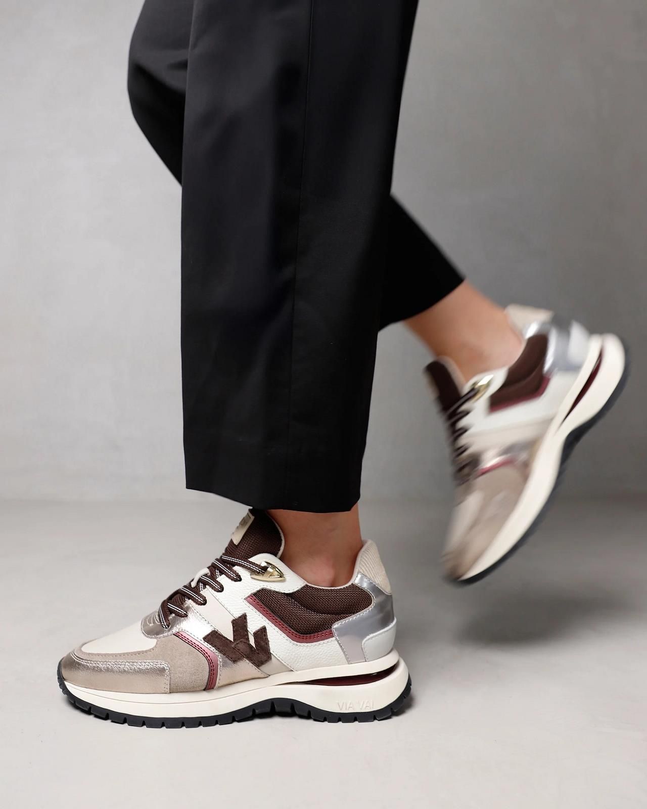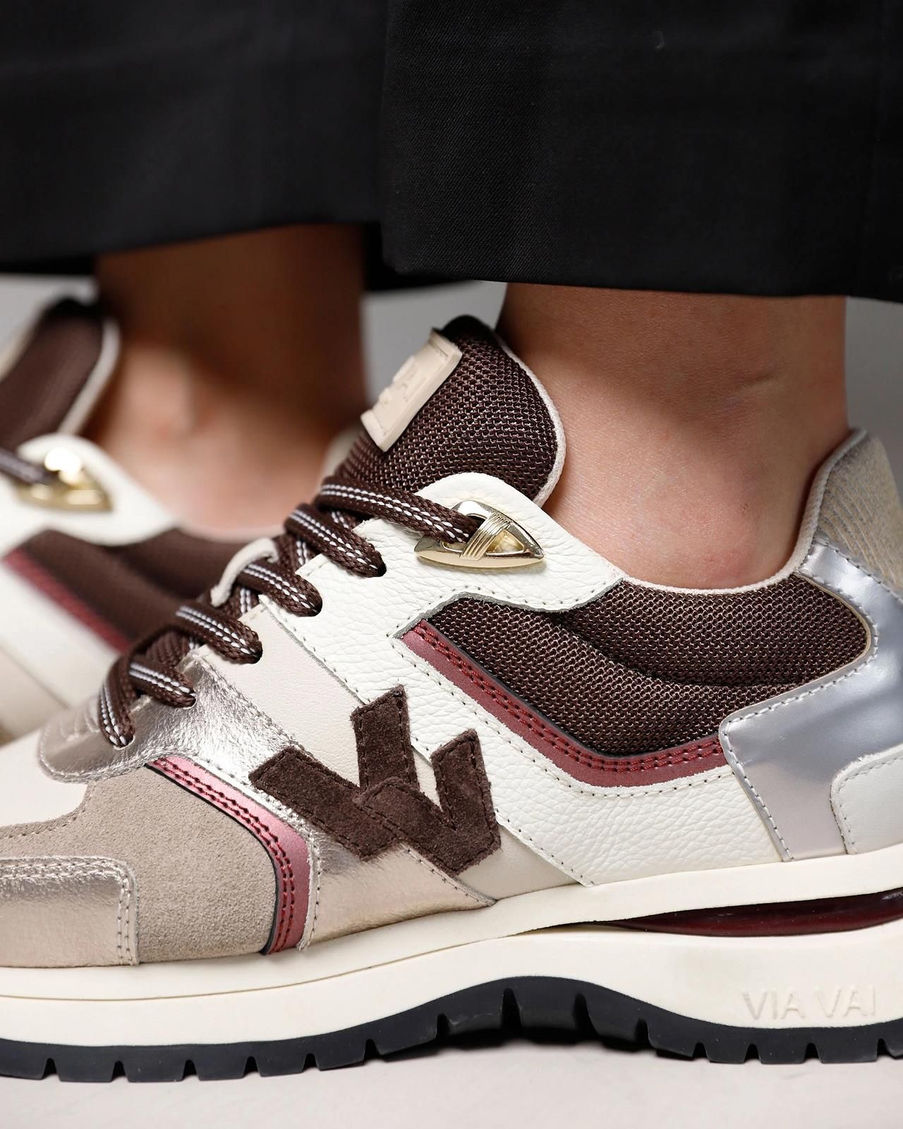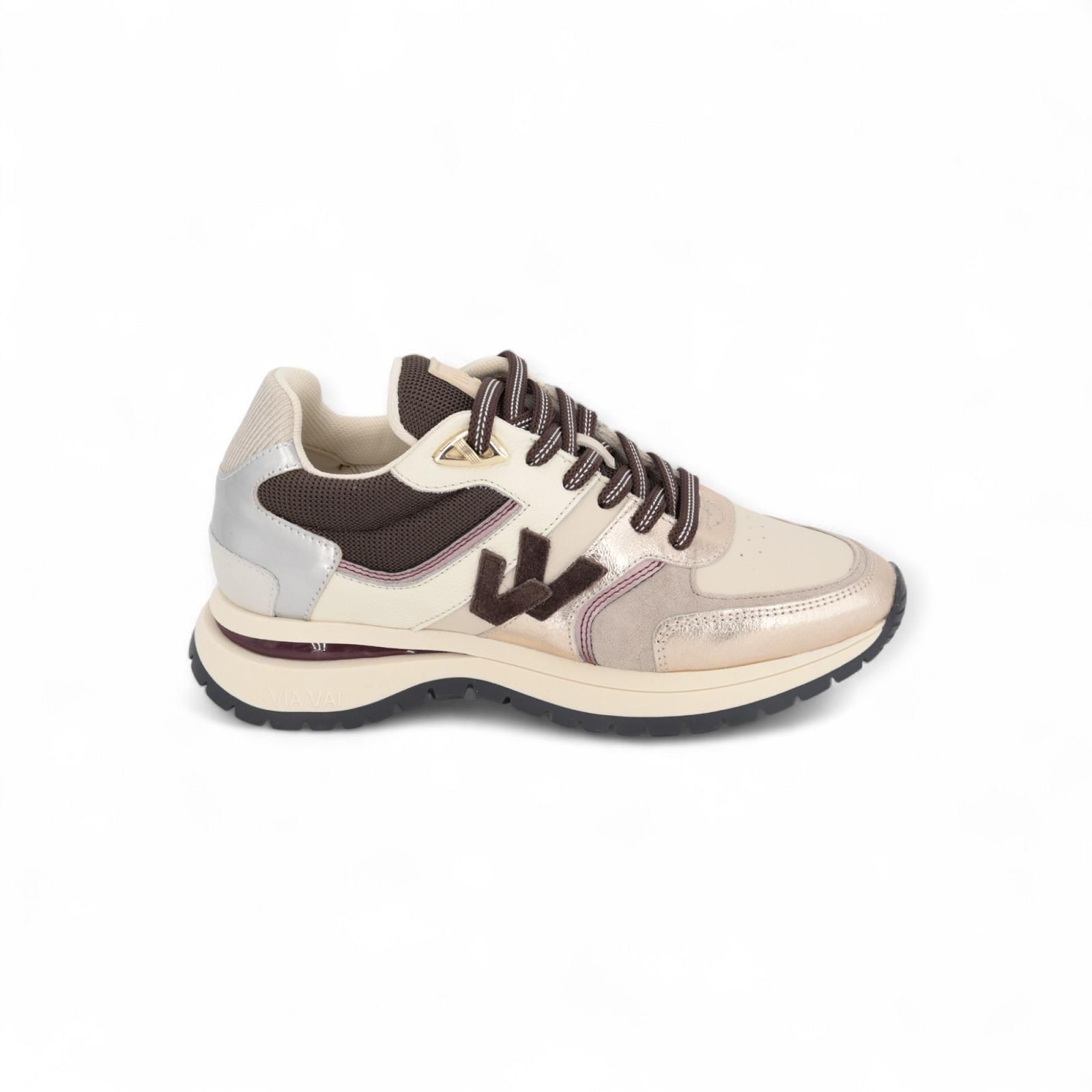 Sneaker Usher Davina van VIA VAI voor dames. Deze sneaker in off wit met zilver heeft het allemaal! Sportief , vrouwelijk en comfy. Is geïnspireerd op de klassieke runner en gecombineerd met verschillende luxe materialen en kleuren voor een elegante look. Usher Davina heeft een sportieve zool met paarse inzet, wat zorgt voor een stoer contrast. Dankzij het foam - dat verwerkt is in de zool - loop je op wolkjes. De dubbele V in kaki groen, kenmerkend voor VIA VAI, maakt de sneaker af. Binnenzool is uitneembaar.