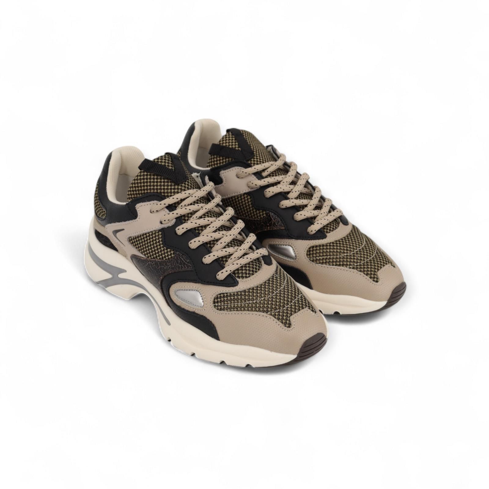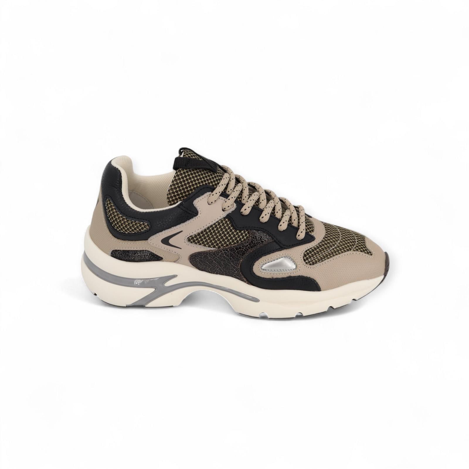 Sneaker Vesper van Via Vai voor dames in taupe met zwart. Deze op-en-top sportieve sneakers trekken direct de aandacht dankzij het unieke design en onmisbare details. Van het grijze accent in de chunky zool tot de glitterende en mesh materialen. De binnenzool is uitneembaar.