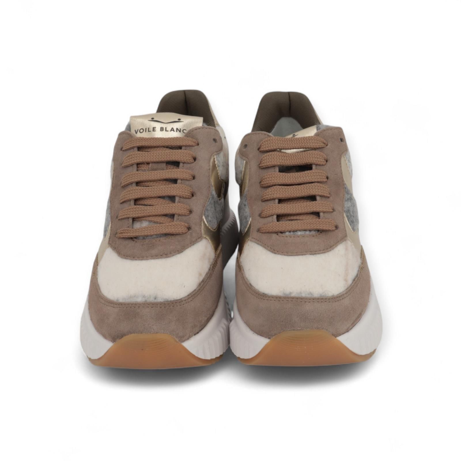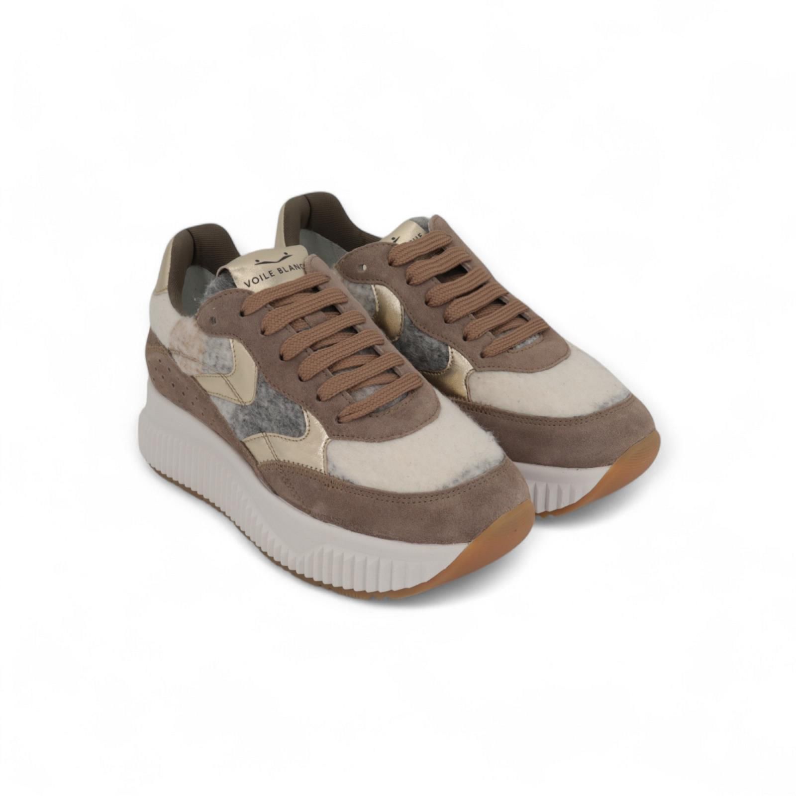 Sneaker Lana Fresh van Voile Blanche voor dames. Deze sneaker is in taupe suède met shining platino. Is mooi afgewerkt met warmte stof aan de zijkanten in off wit en beige/grijze tinten. Heeft een dikke plateauzool en een uitneembare binnenzool.