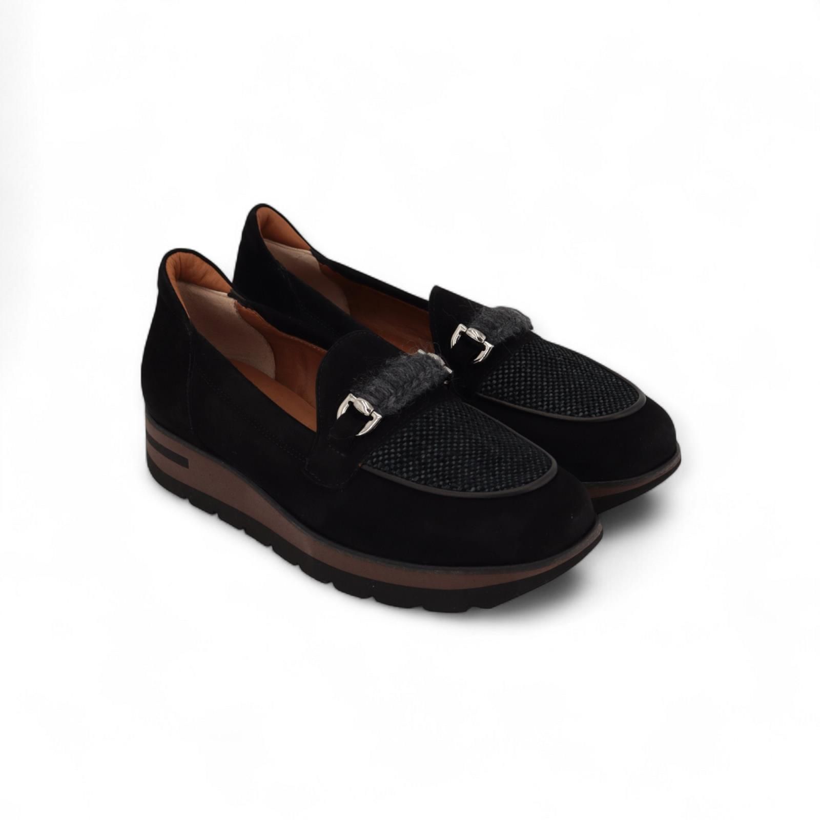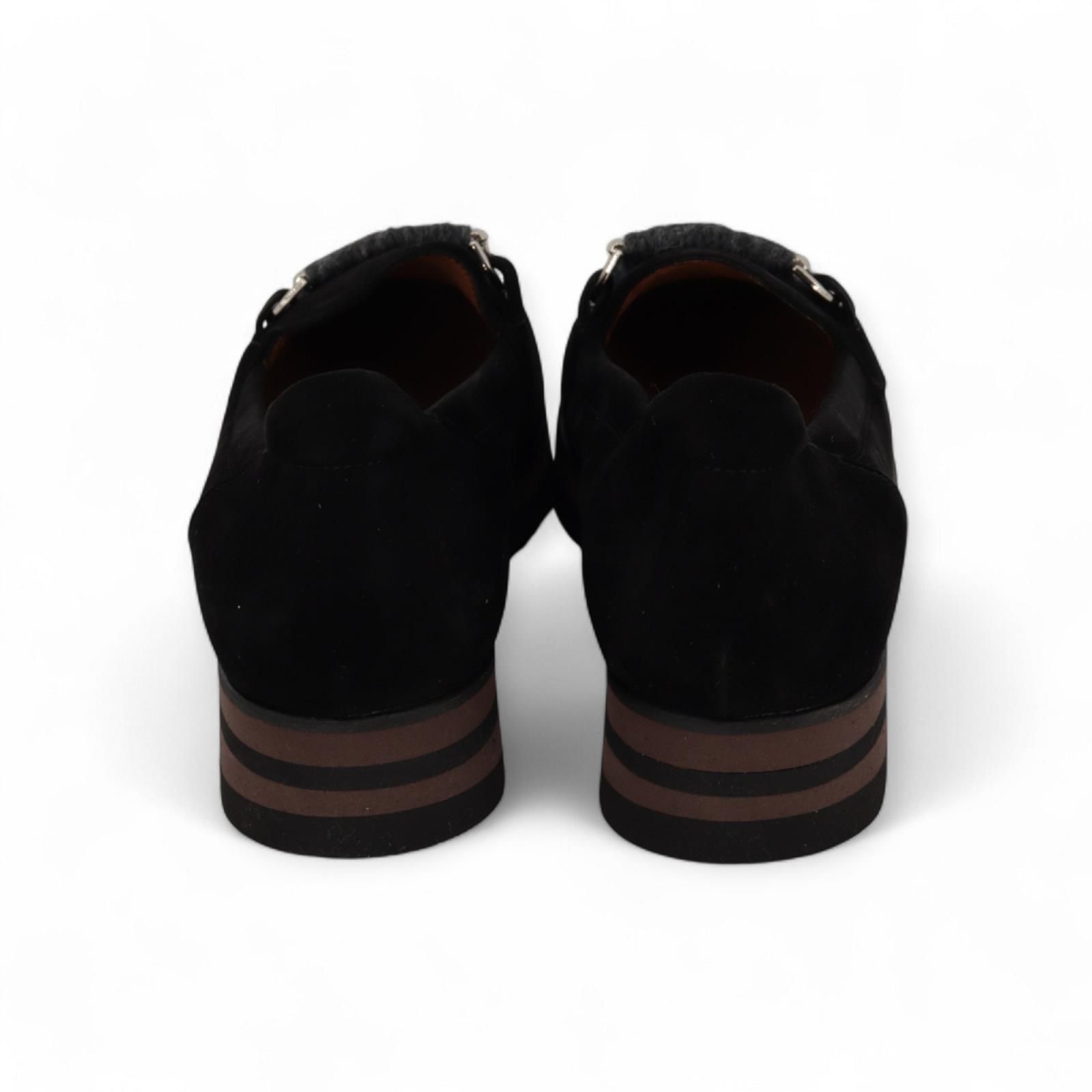 Mocassin van Volpato voor dames. Deze mocassin is in zwart suède van het Italiaanse comfortmerk die zeer zacht aanvoelen. Is afgewerkt met een boekel en mesh op de wreef. Is op een dikke aangename zool.