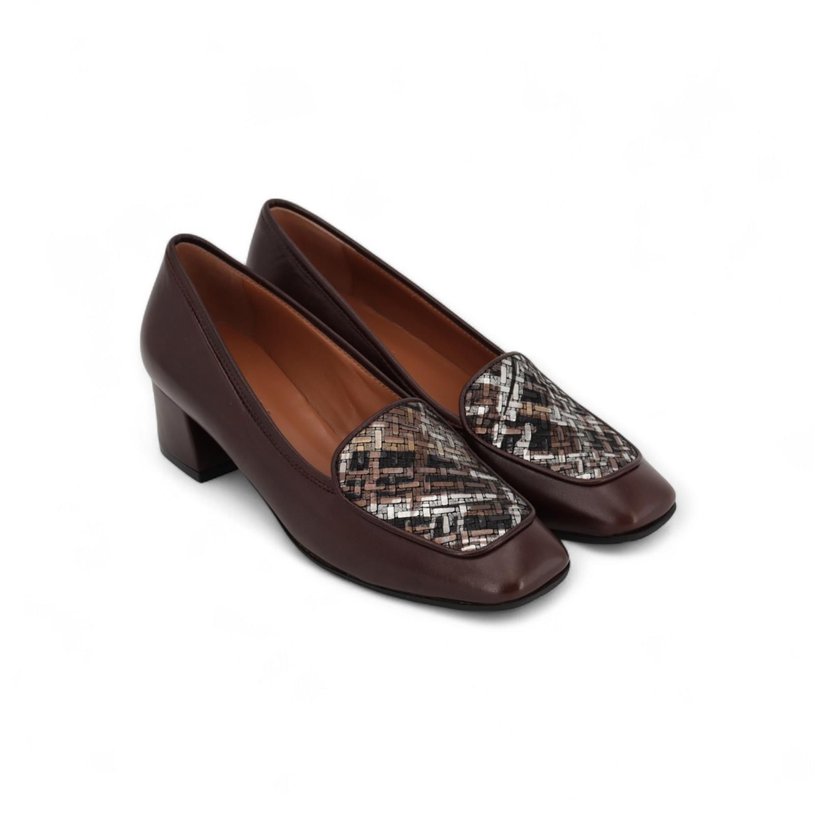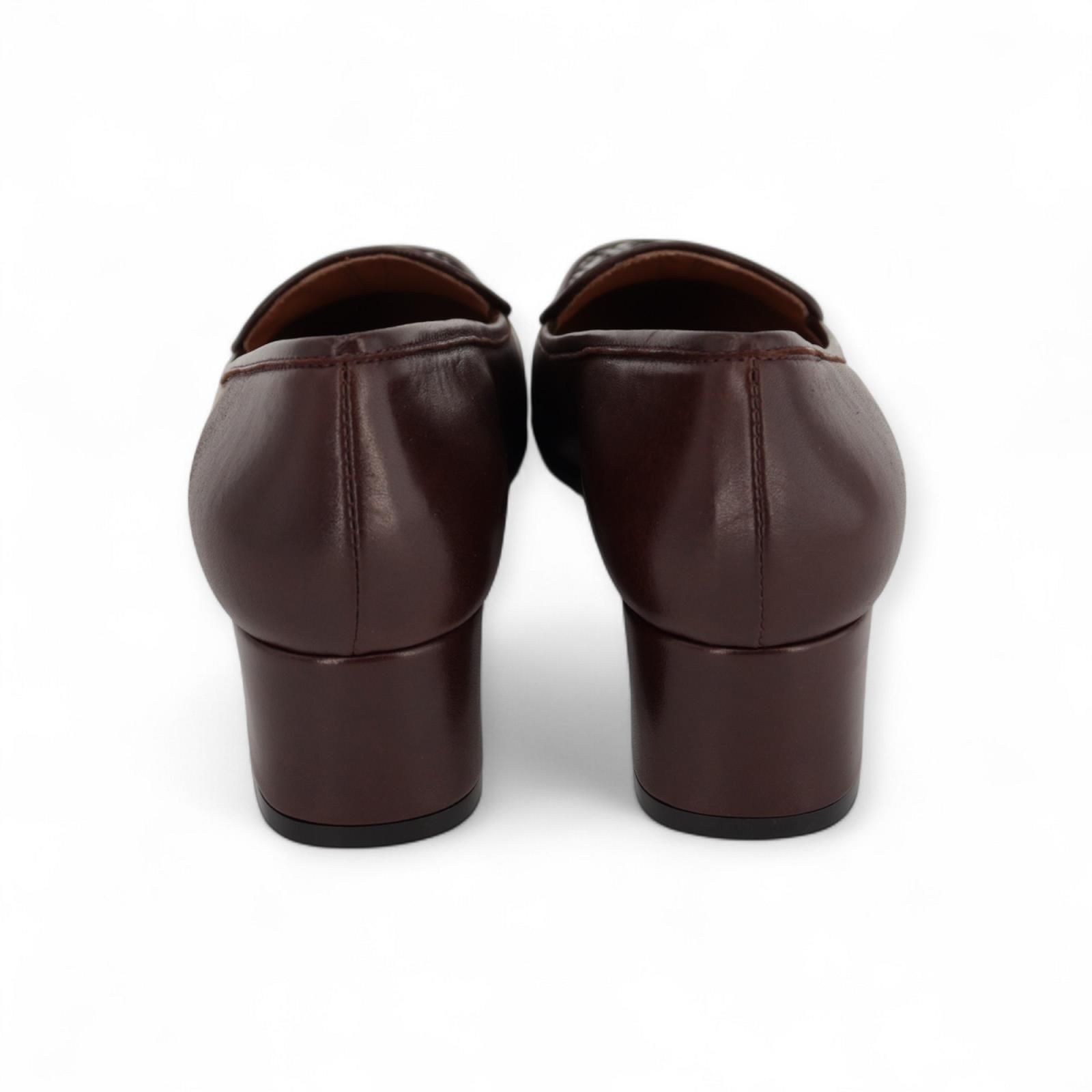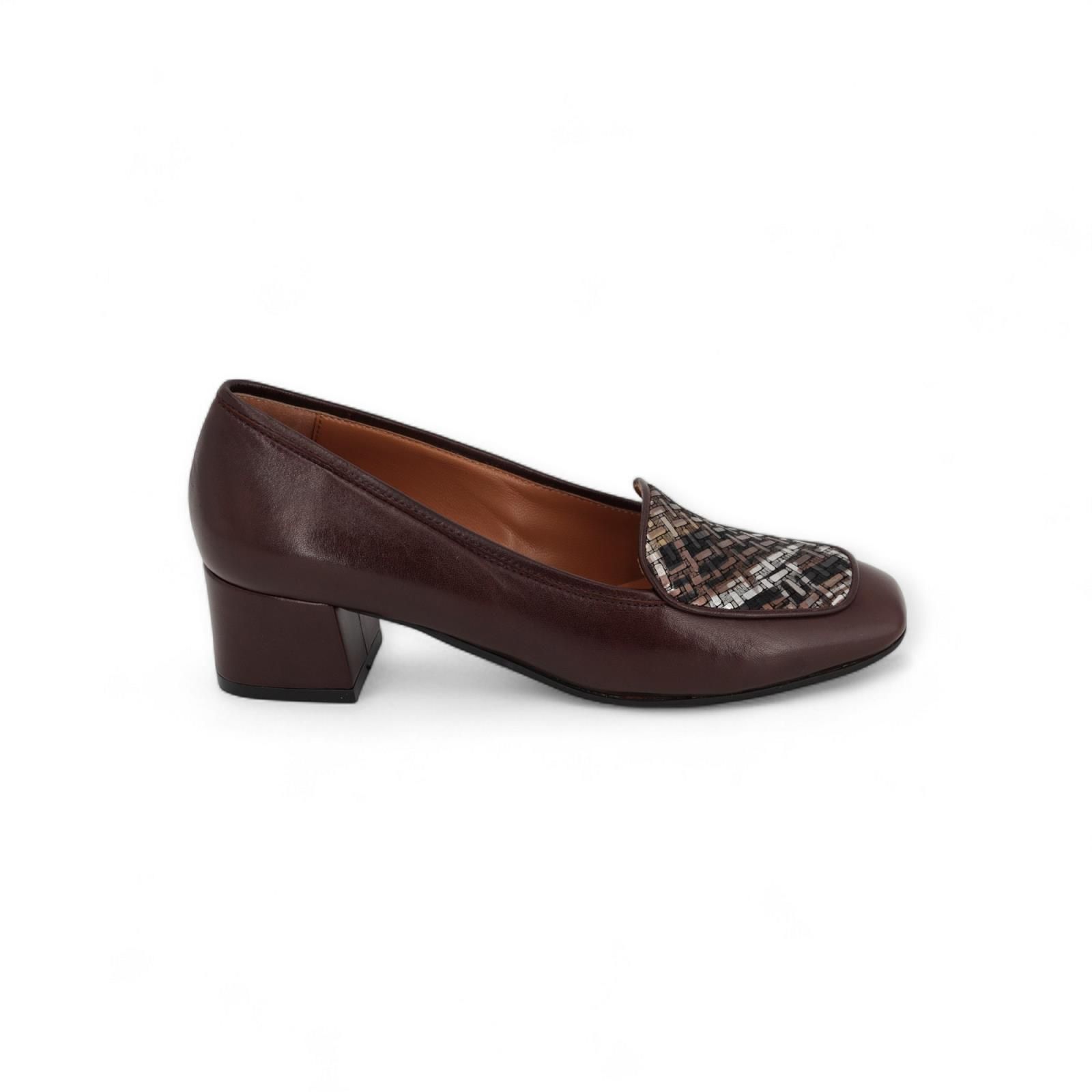 Mocassin LV440 van Voltan voor dames. Dit elegant mocassin model is vervaardigt in kastanjebruin leer. De combinatie van het strakke leer met het metallic patroon op de wreef geeft de schoen een chique uitstraling. Is met een lichte carré top op een hakje van 4,5cm hoog. Heeft een antislip buitenzool.