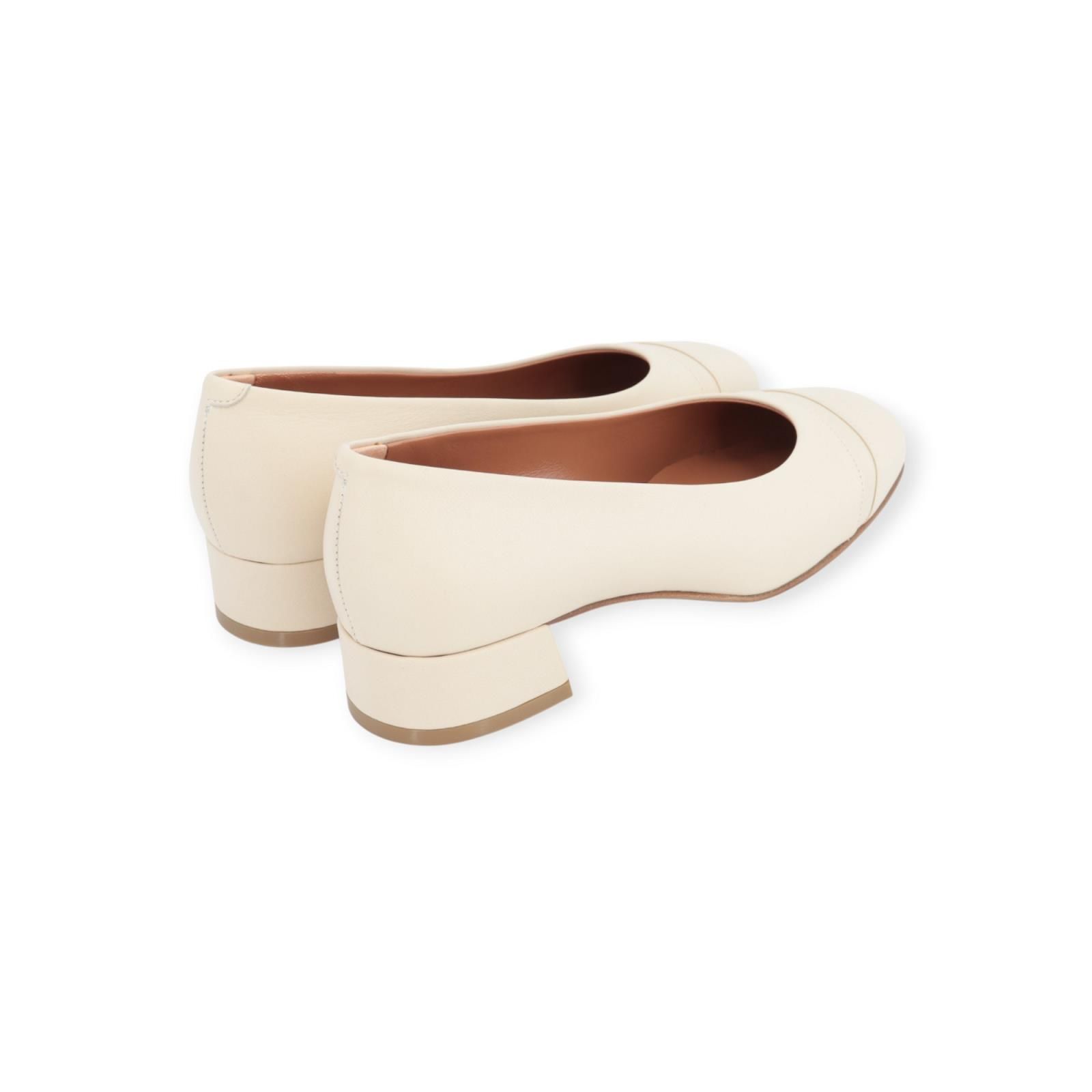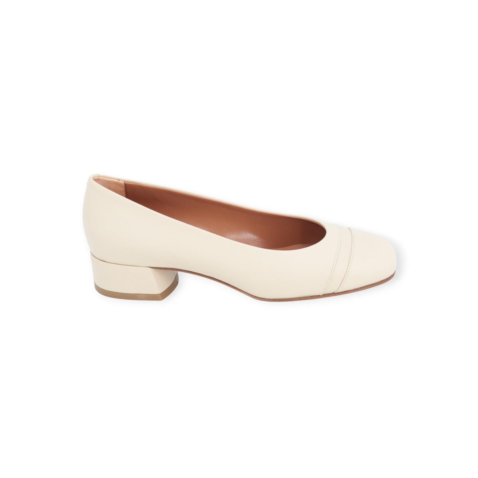 Ballerina LV511 van Voltan voor dames. Is in ecru leer met een beige carré neus. Deze elegante ballerina is op een klein hieltje van 2,5cm hoog, mooi mee afgewerkt in ecru leer. Het buitenzooltje is in leer.