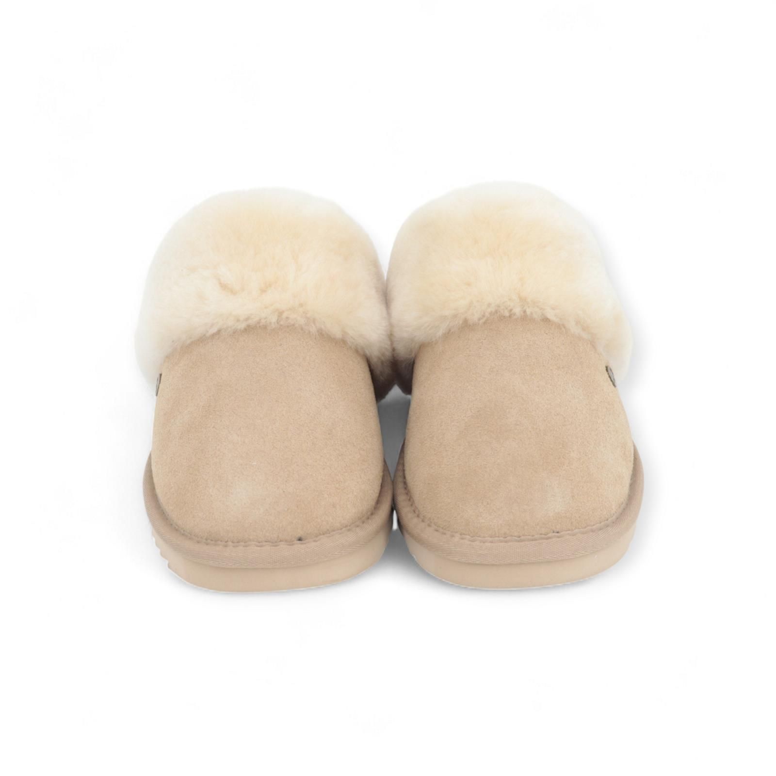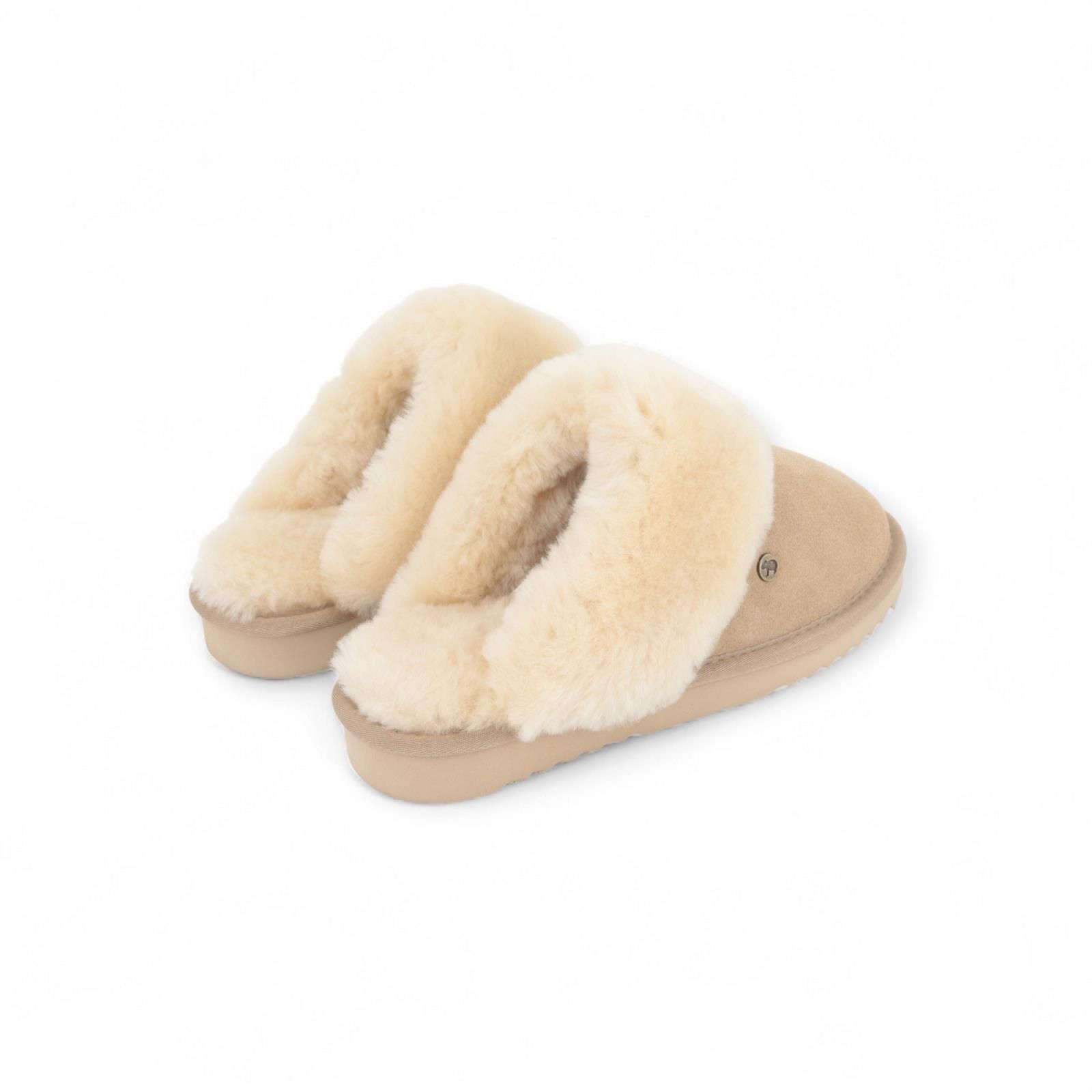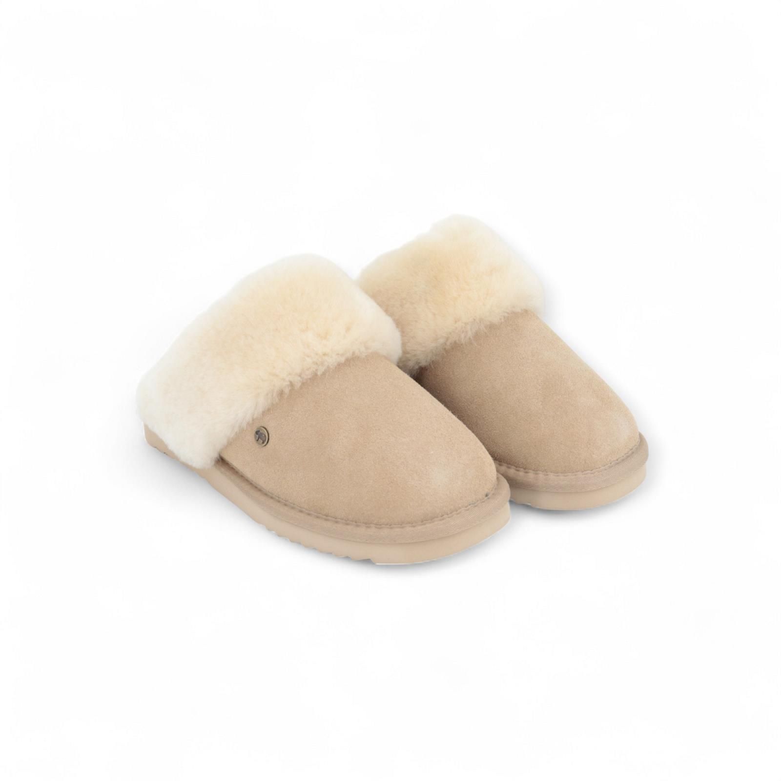 Pantoffel Flurry van Warmbat voor dames. Deze pantoffel is in zand / stone suède met 100% merinowol die mee uitkomt langs de flap. Is op een rubberen zool die zeer licht aanvoelt en antislip is. Dit model zorgt voor een tijdloze en elegante uitstraling.