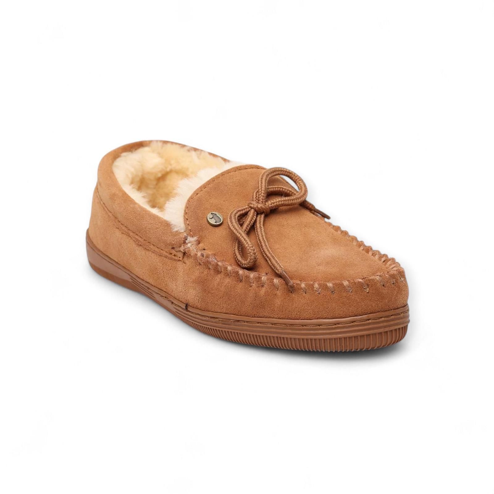 Pantoffel Koala van Warmbat voor dames. Deze pantoffel is volledig toe en in suède cognac met merino wol. De decoratieve strikjes op de wreef kan je wat aantrekken voor iets meer stevigheid aan de voet. Is op een rubberen zool die zeer licht aanvoelt en antislip is.