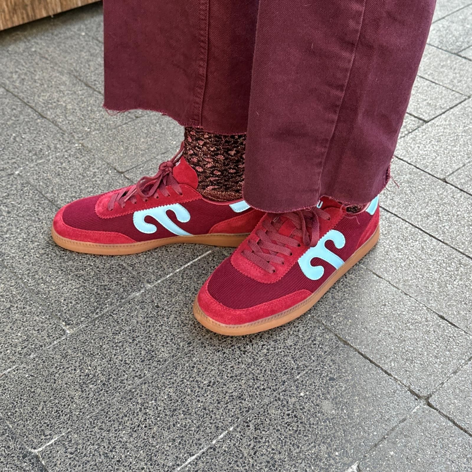 Sneaker Ruyi Art Gong 76 van Wushu voor dames. Deze sneaker is in bordeaux suède met lichtblauw leer aan de zijkant het logo en hielflap. Is zeer licht aan de voeten dankzij het gewichtloze ontwerp van Gong en de Ultra flex gummyzool. Heeft een uitneembare binnenzool.