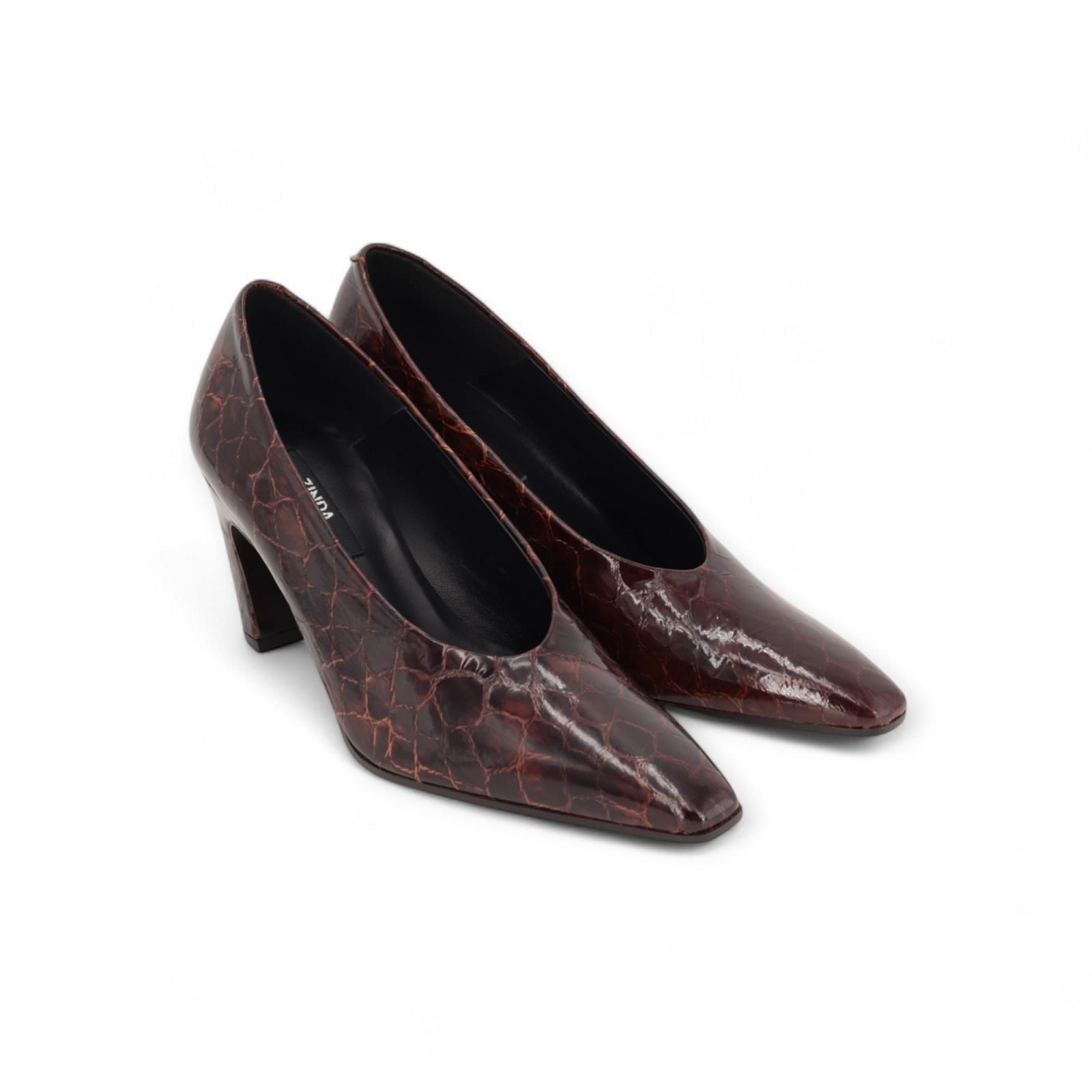 Pump 3200 van Zinda voor dames. Deze mooie pump is in bruine tinten geschubt lakleer. Heeft een lichtscherpe punt en een hak van 5-5.5cm hoog op een antislipzool.