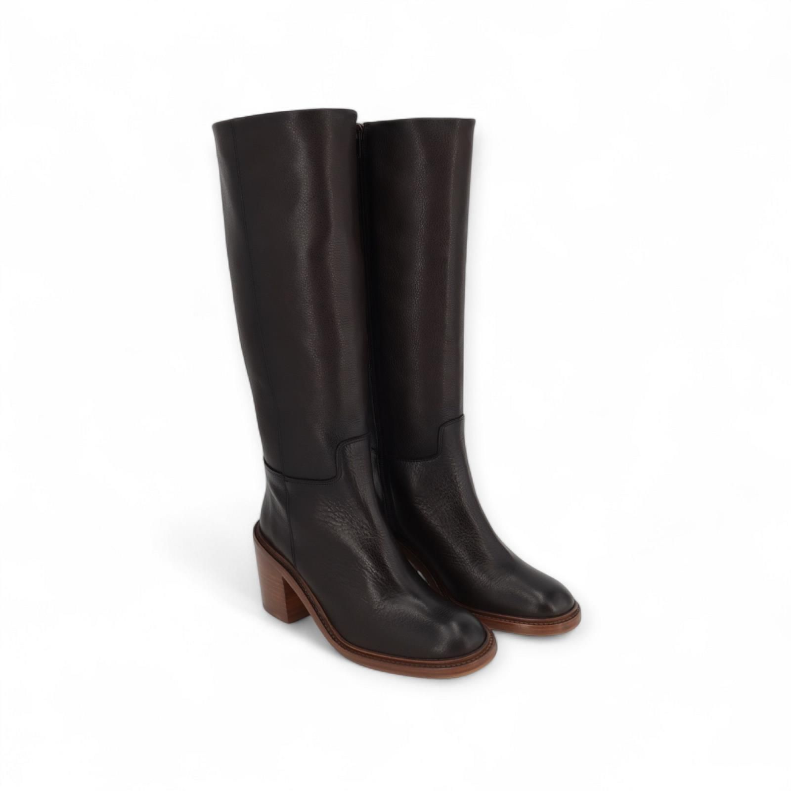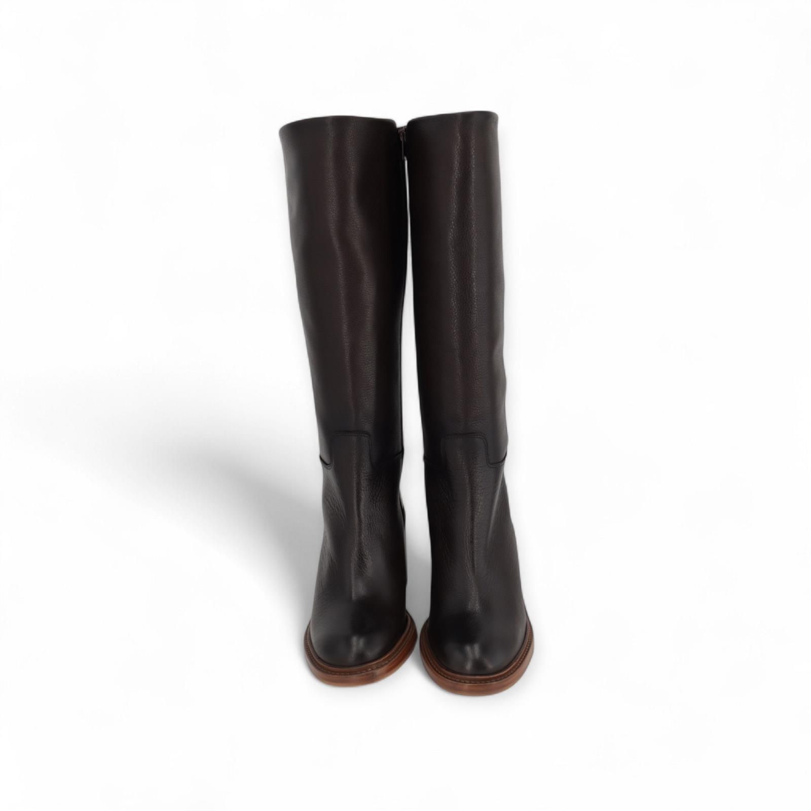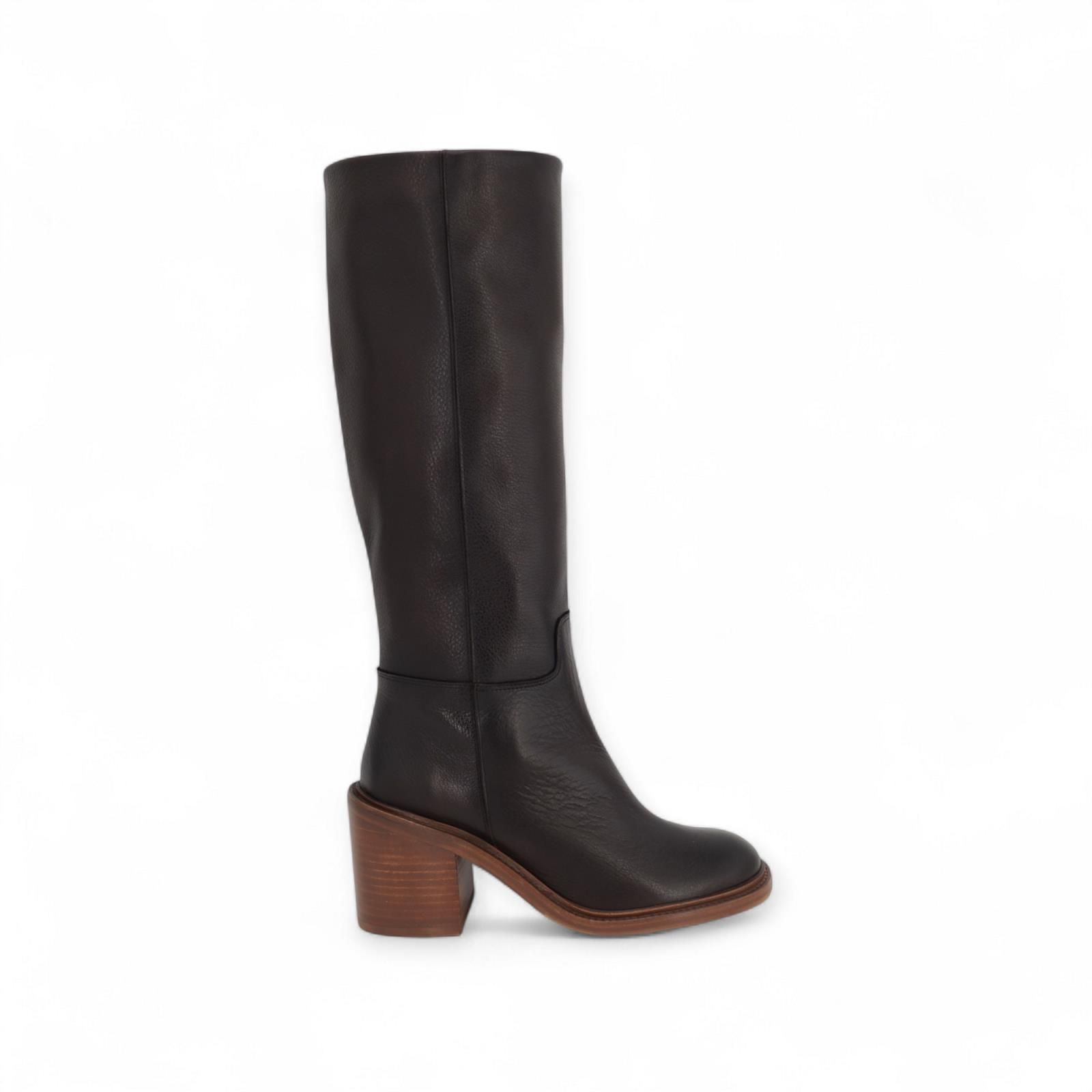 Laars 3337 van Zinda voor dames. Deze lange laars is in bruin leer. Heeft een ronde neus en een volledige ritssluiting. Is met een houten blokhak van 5-5.5cm hoog en een antislipzool.